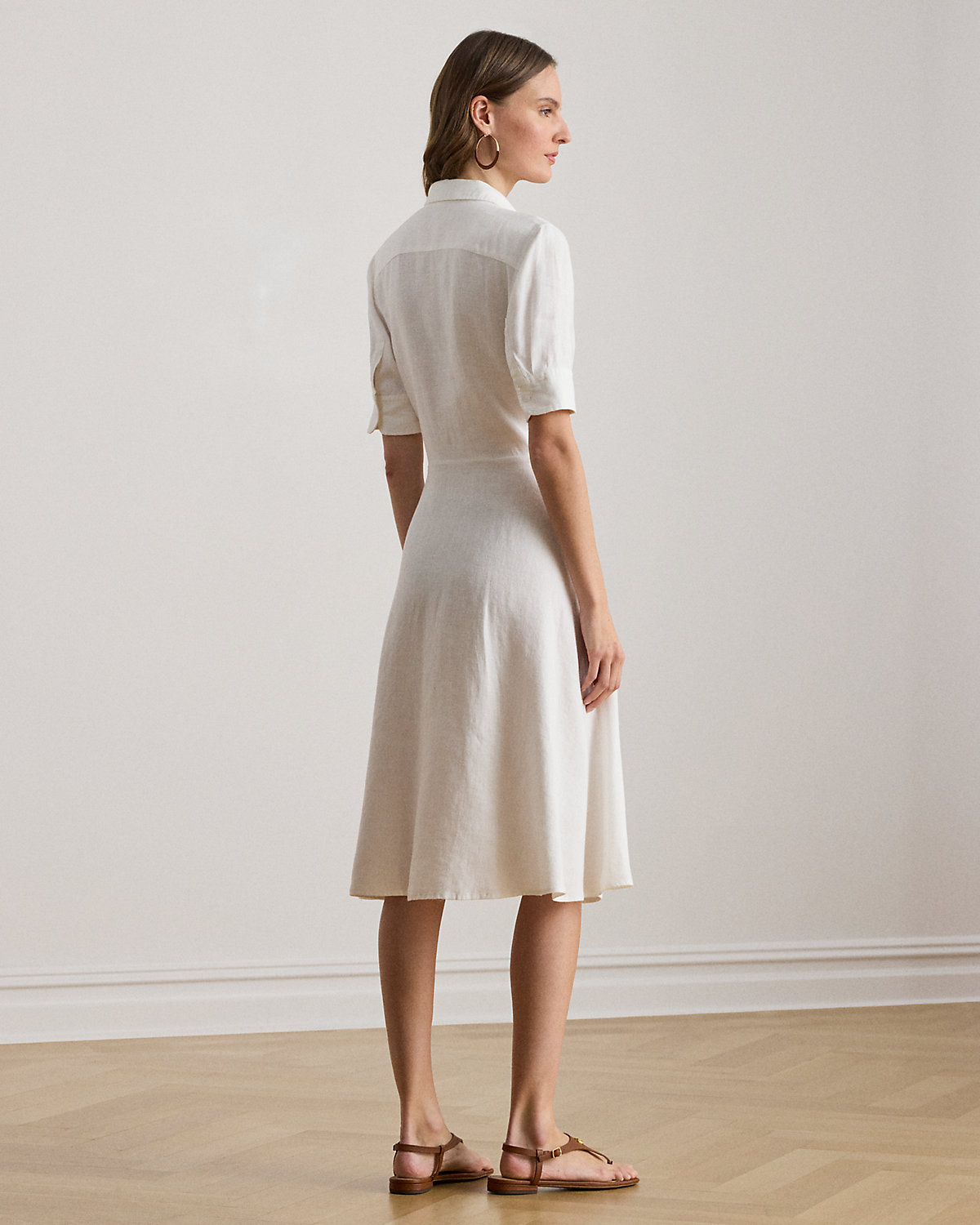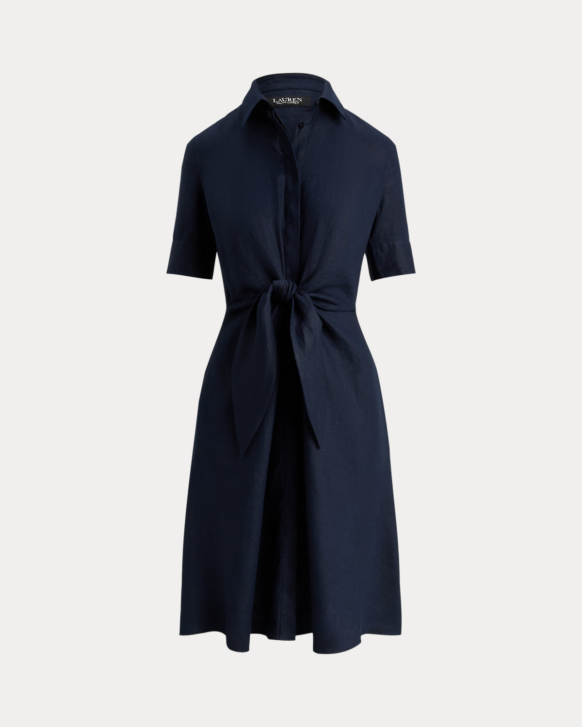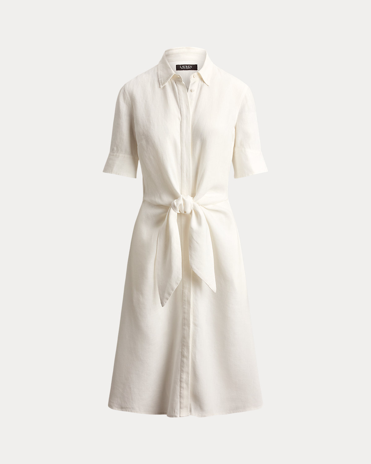 Light-as-air linen brings a breezy look and feel to this iteration of Lauren Ralpthth Lauren’s essential shirtdress, while a charming self-tie waist adds to its easy character.