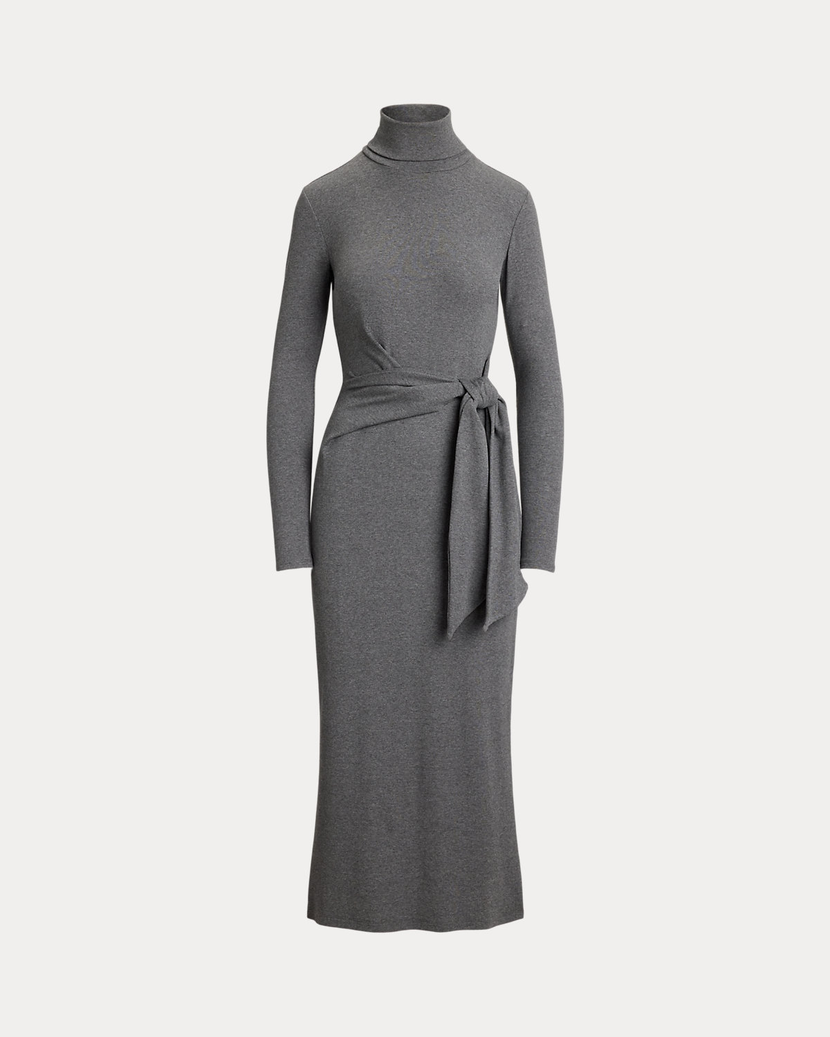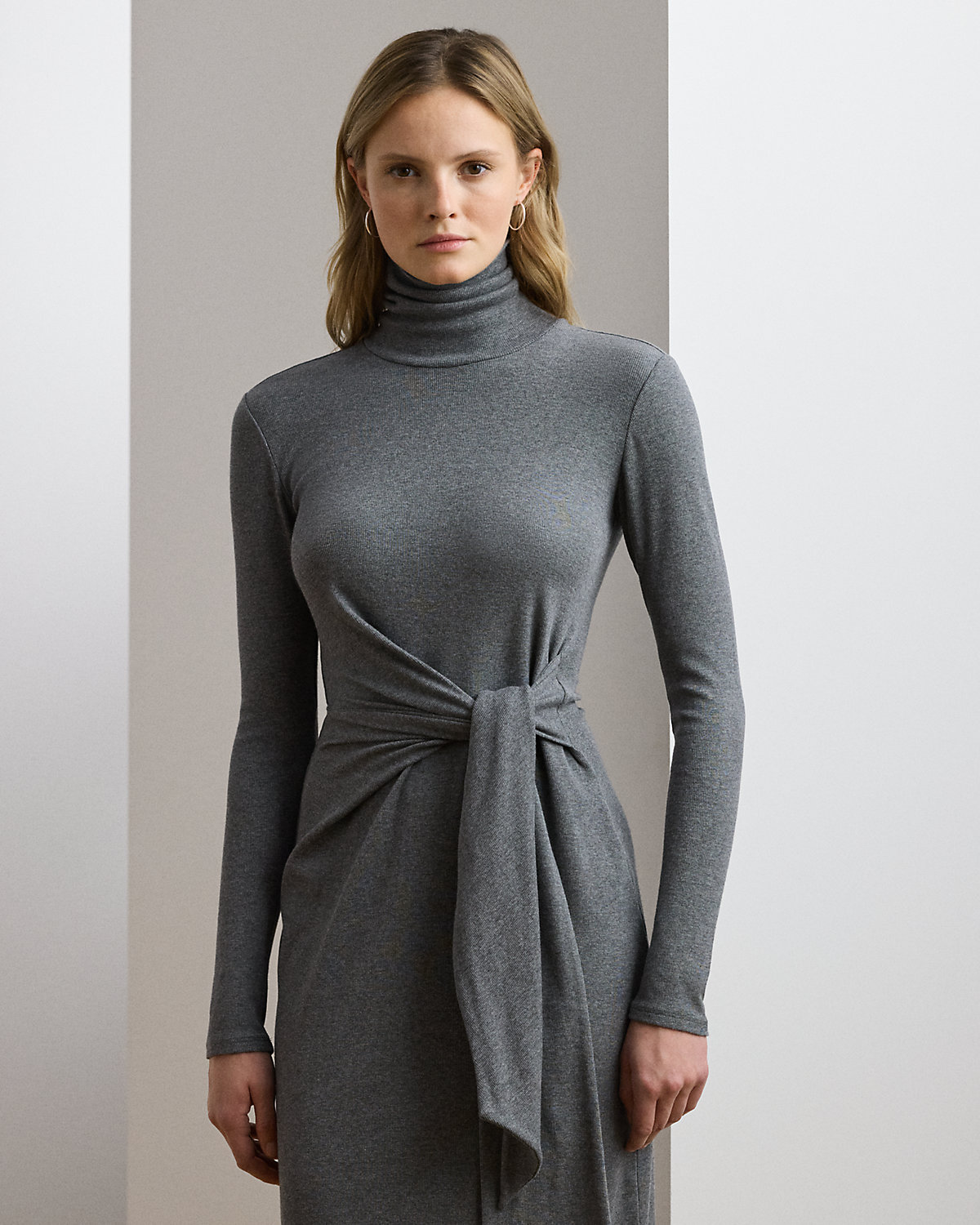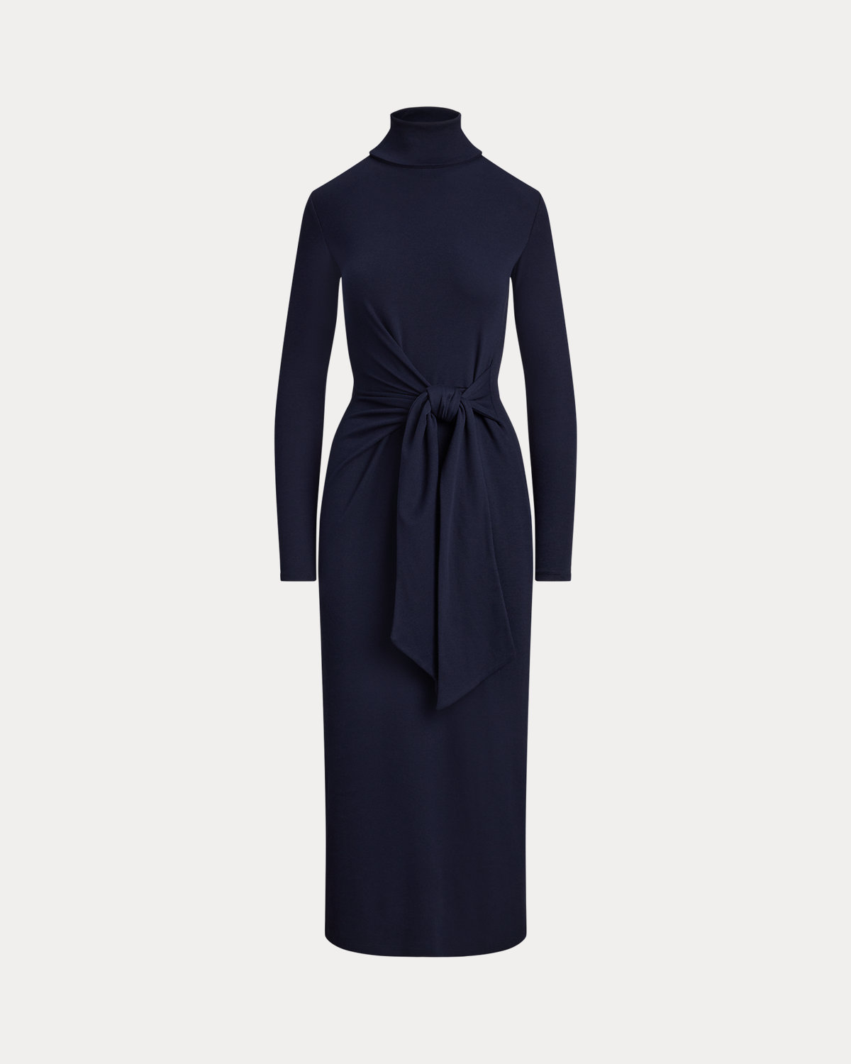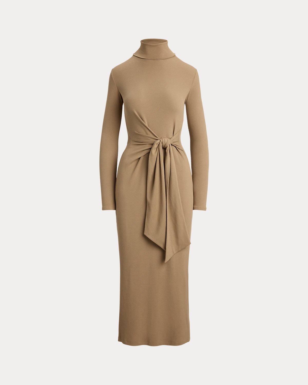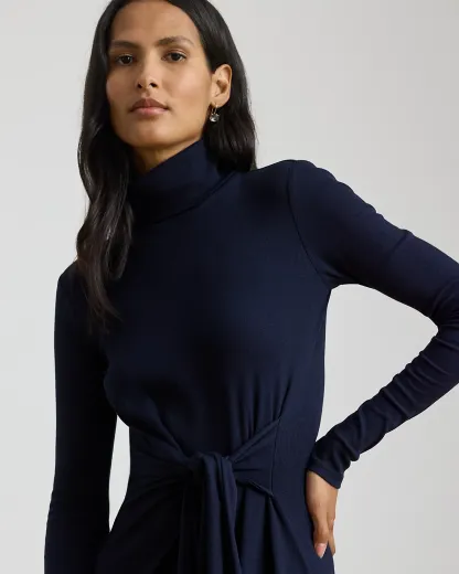 Rib-knit with a soft stretch-cotton blend, this turtleneck dress is cut for a slim-fitting silhouette and a calf-grazing midi length. A tie-front design at the waist adds contemporary flare to this refined piece, while slits at the hem afford ease of movement.