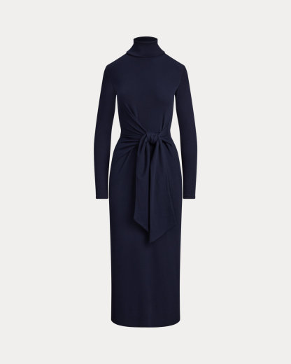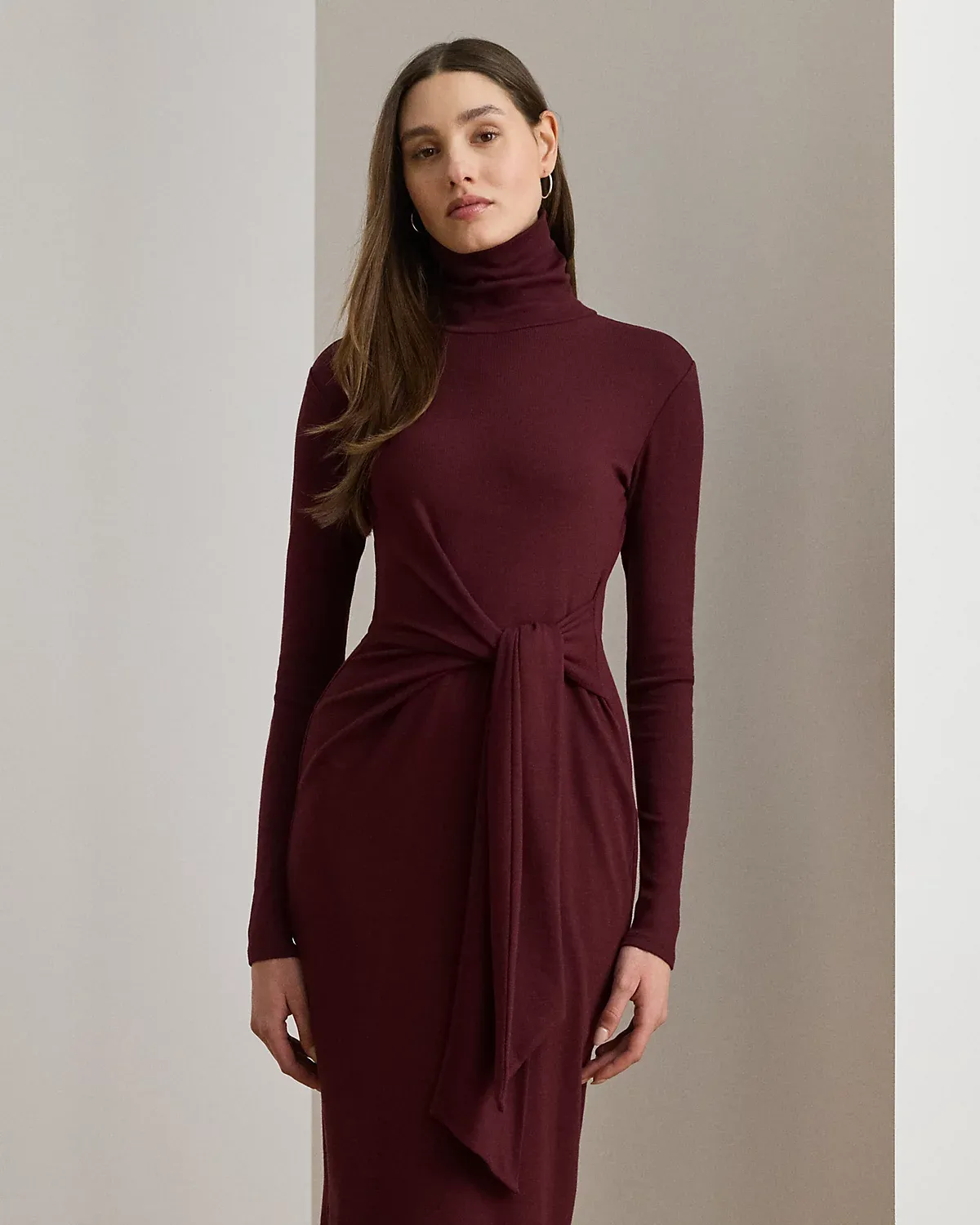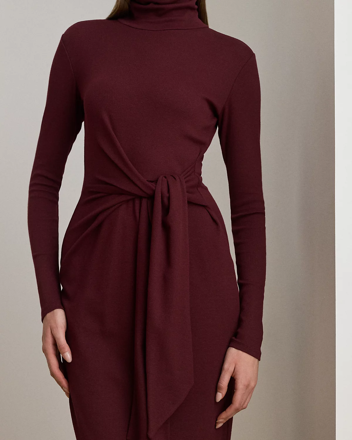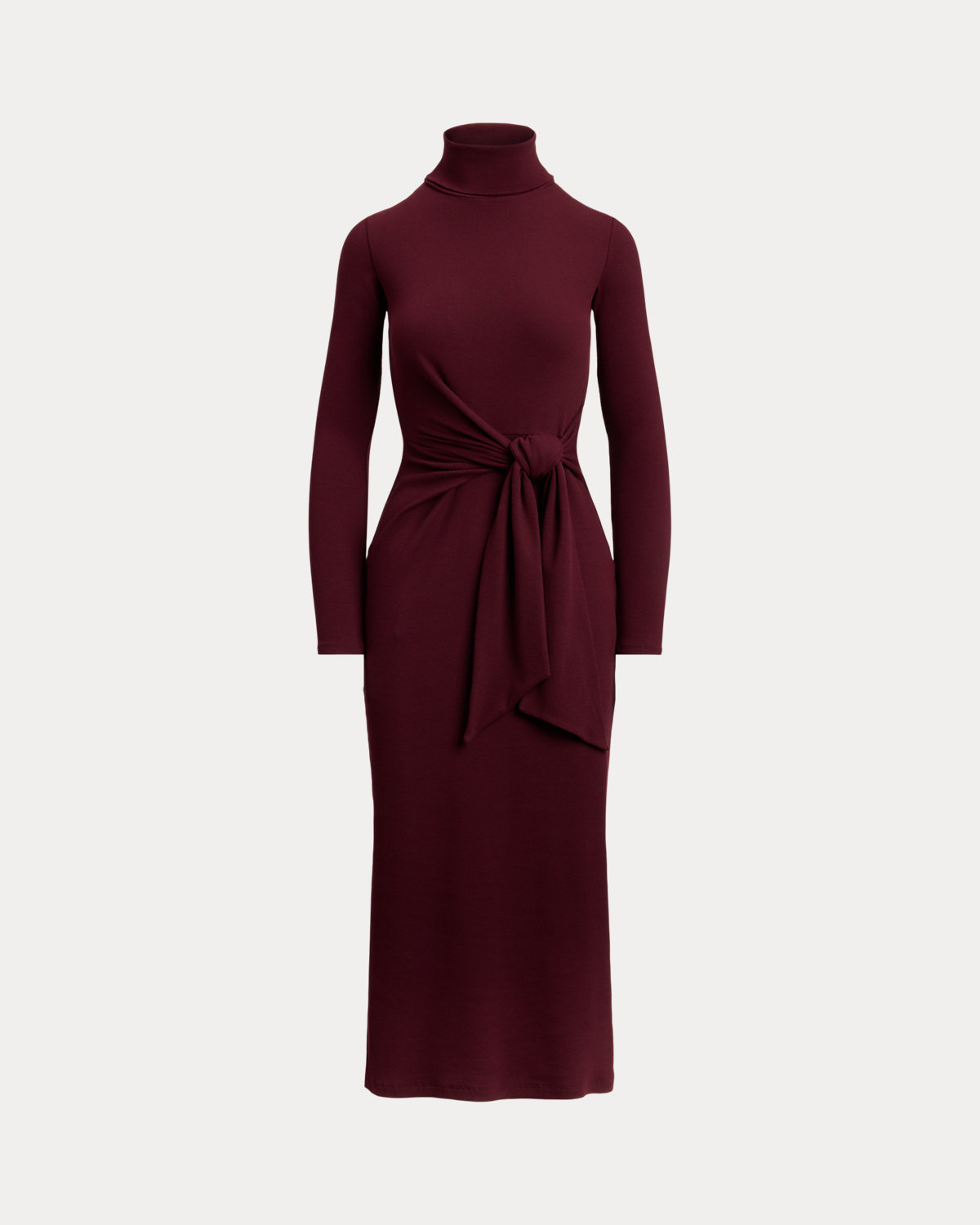 Rib-knit with a soft stretch-cotton blend, this turtleneck dress is cut for a slim-fitting silhouette and a calf-grazing midi length. A tie-front design at the waist adds contemporary flare to this refined piece, while slits at the hem afford ease of movement.