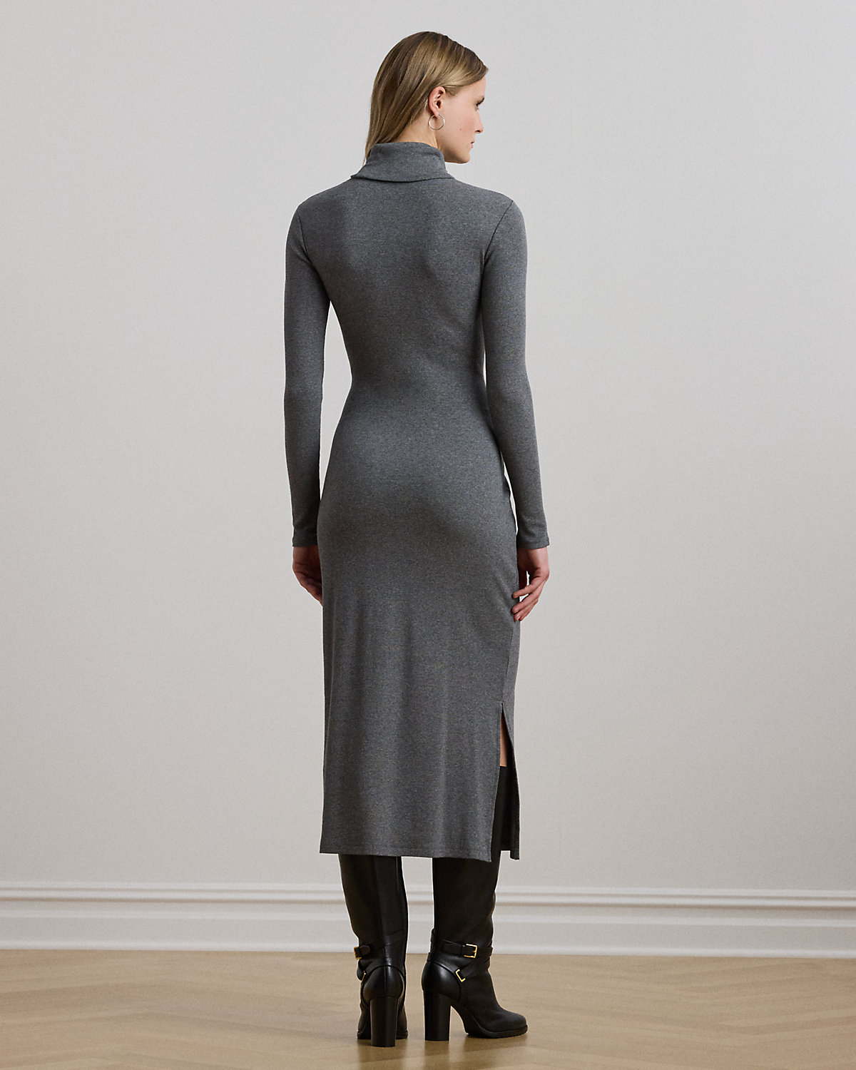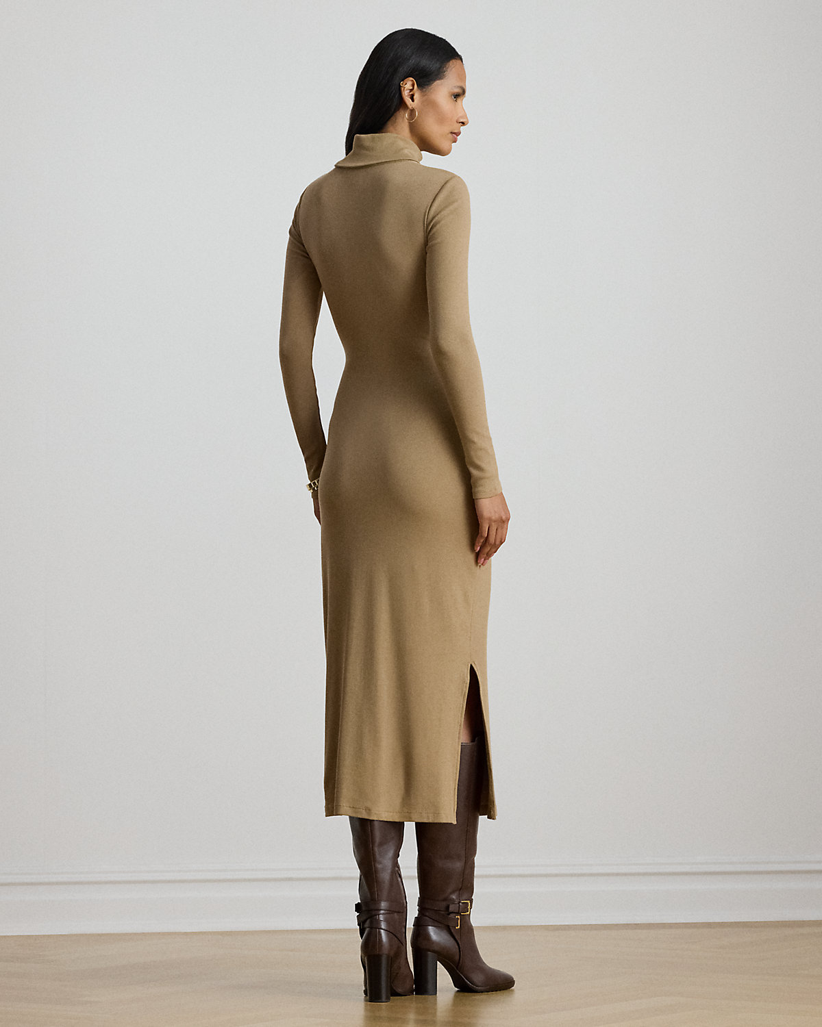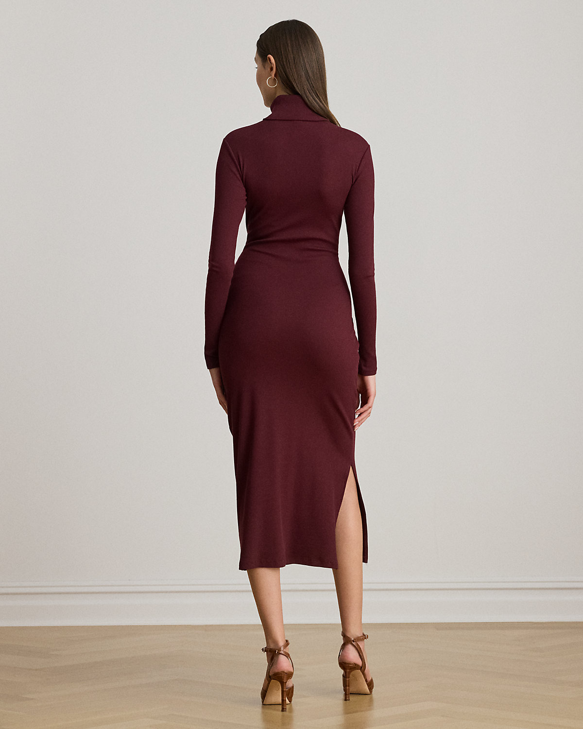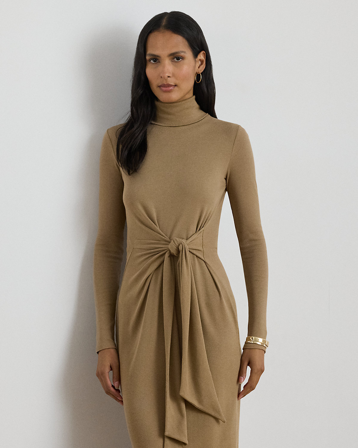 Rib-knit with a soft stretch-cotton blend, this turtleneck dress is cut for a slim-fitting silhouette and a calf-grazing midi length. A tie-front design at the waist adds contemporary flare to this refined piece, while slits at the hem afford ease of movement.