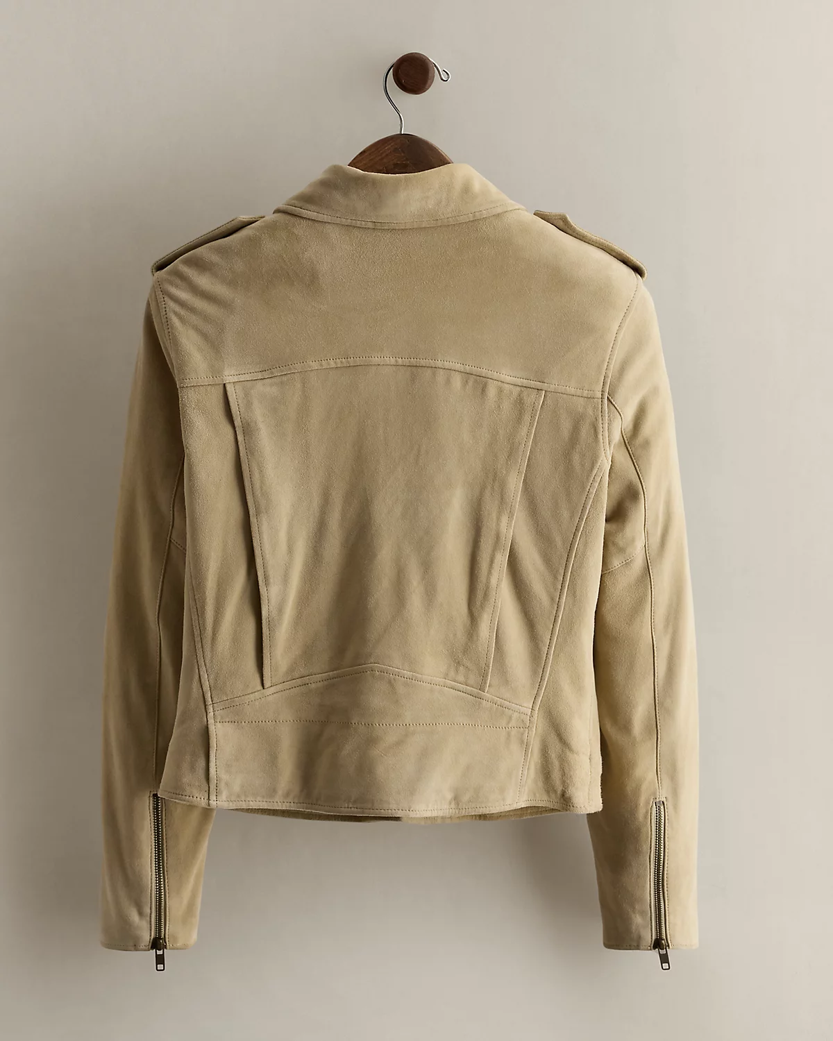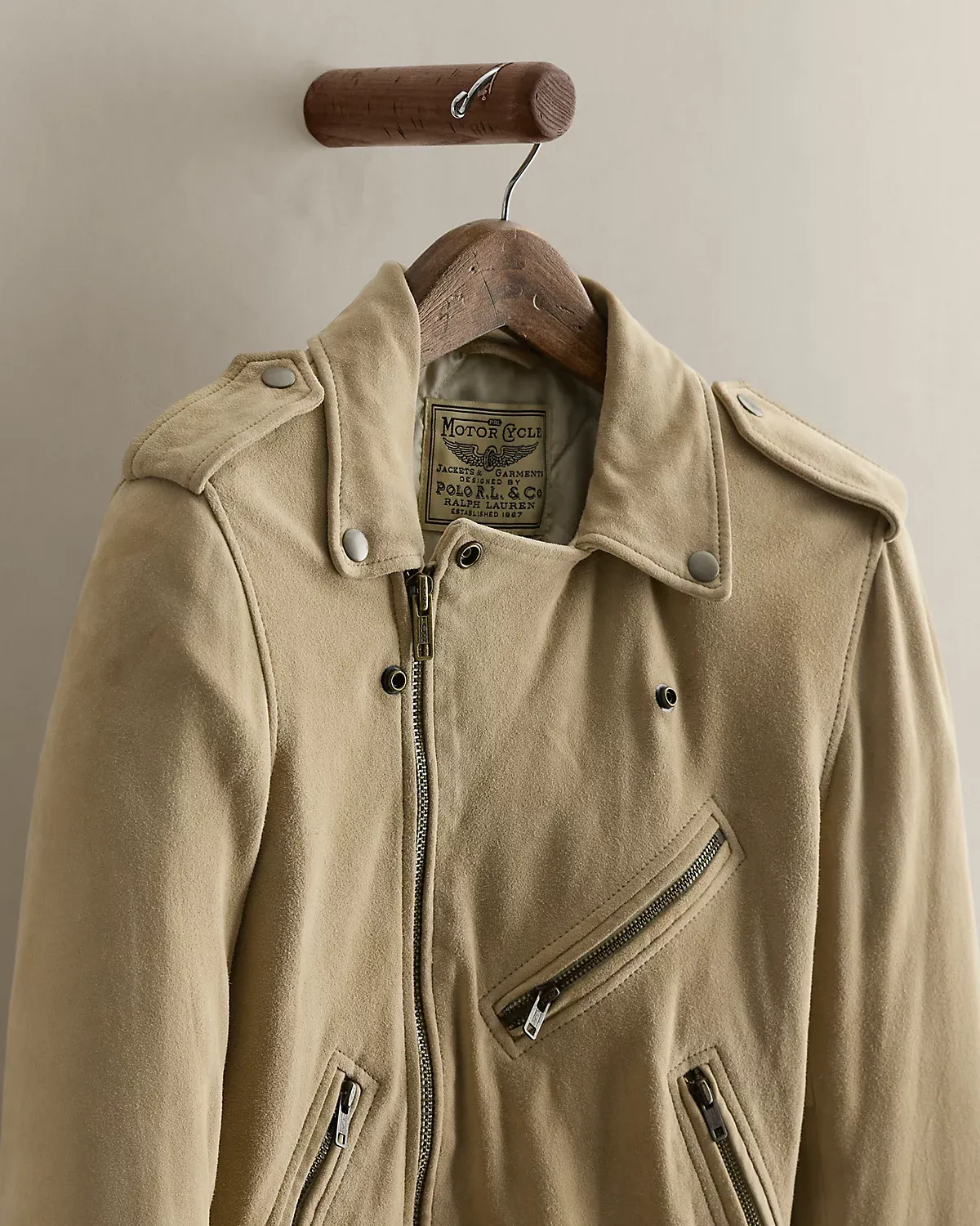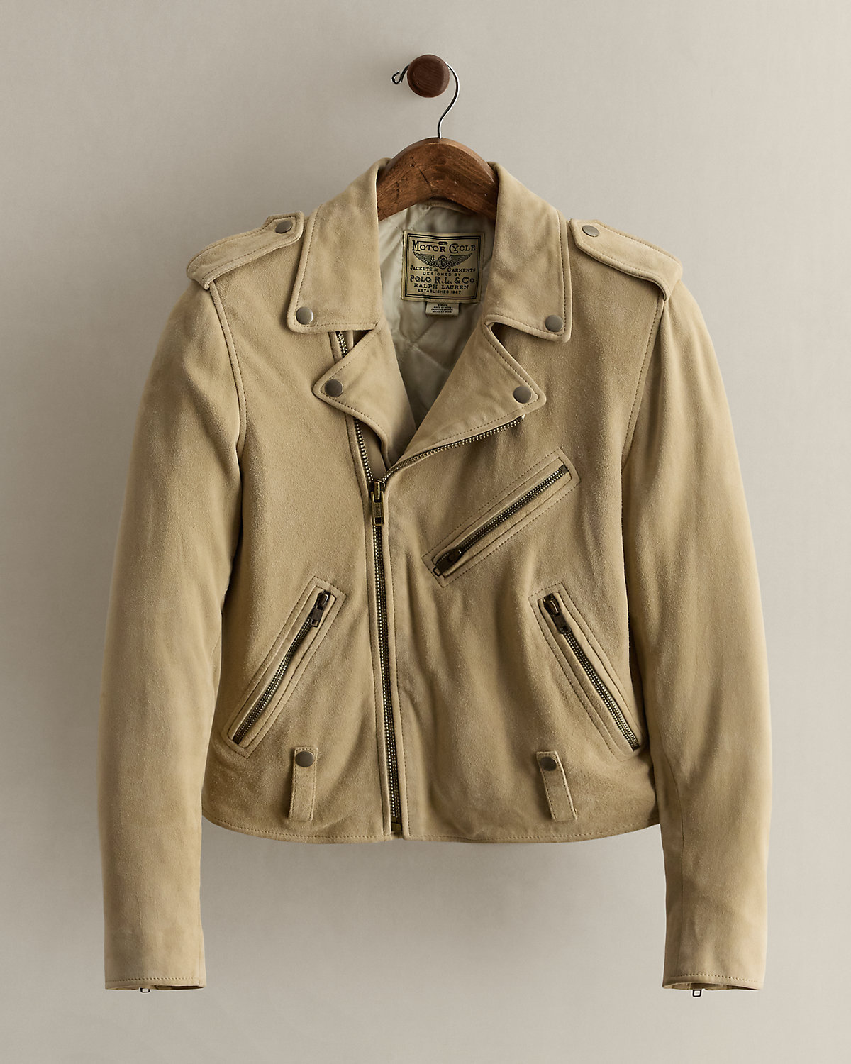 Part of the women’s 2021 Polo collection. Goat suede moto jacket with a quilted and lightly filled lining. Bi-swing construction with snapped notch lapels, an asymmetrical zip front, zip pockets, snapped shoulder epaulets, and snapped tabs at the hem. Size small has a 19.25" back body length, a 15" shoulder, a 16.75" chest, and a 23.25" sleeve length.
