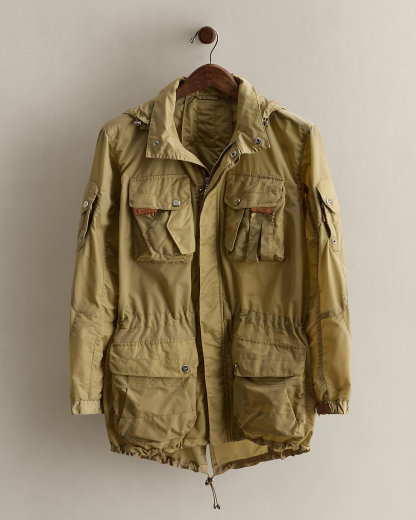 - Two snapped-flap patch pockets with additional side-zip entry at the upper arms. Two snapped-flap patch pockets at the chest, each with an additional flapped entry. Two front waist snapped-flap patch pockets, each with an additional angled slit entry.