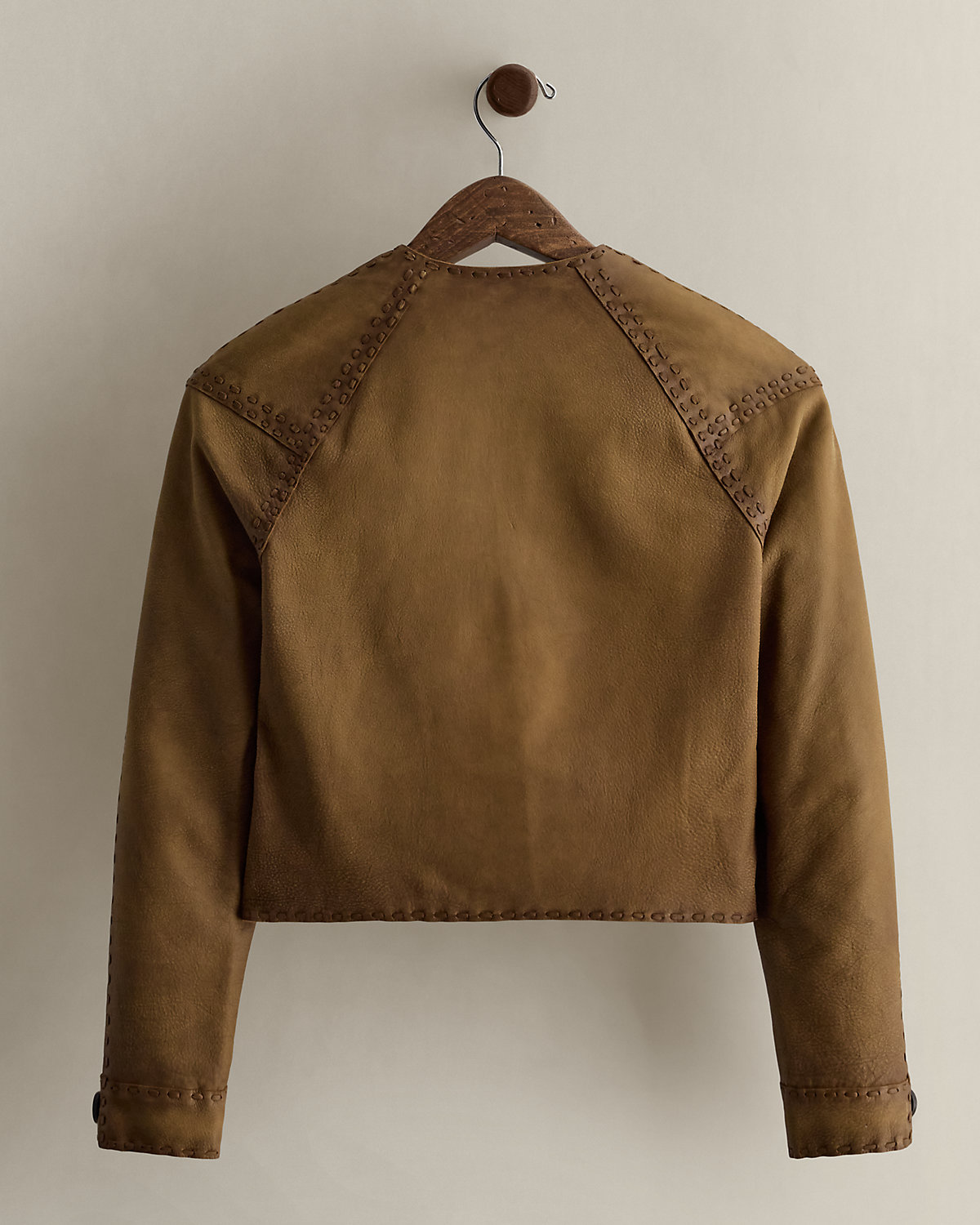 Circa 2008. Part of the women’s Blue Label collection. Pieced leather jacket with decorative tonal topstitching throughout. US size 2 has a 15.5" back body length, an 18" shoulder, a 17" chest, and a 21" sleeve length.