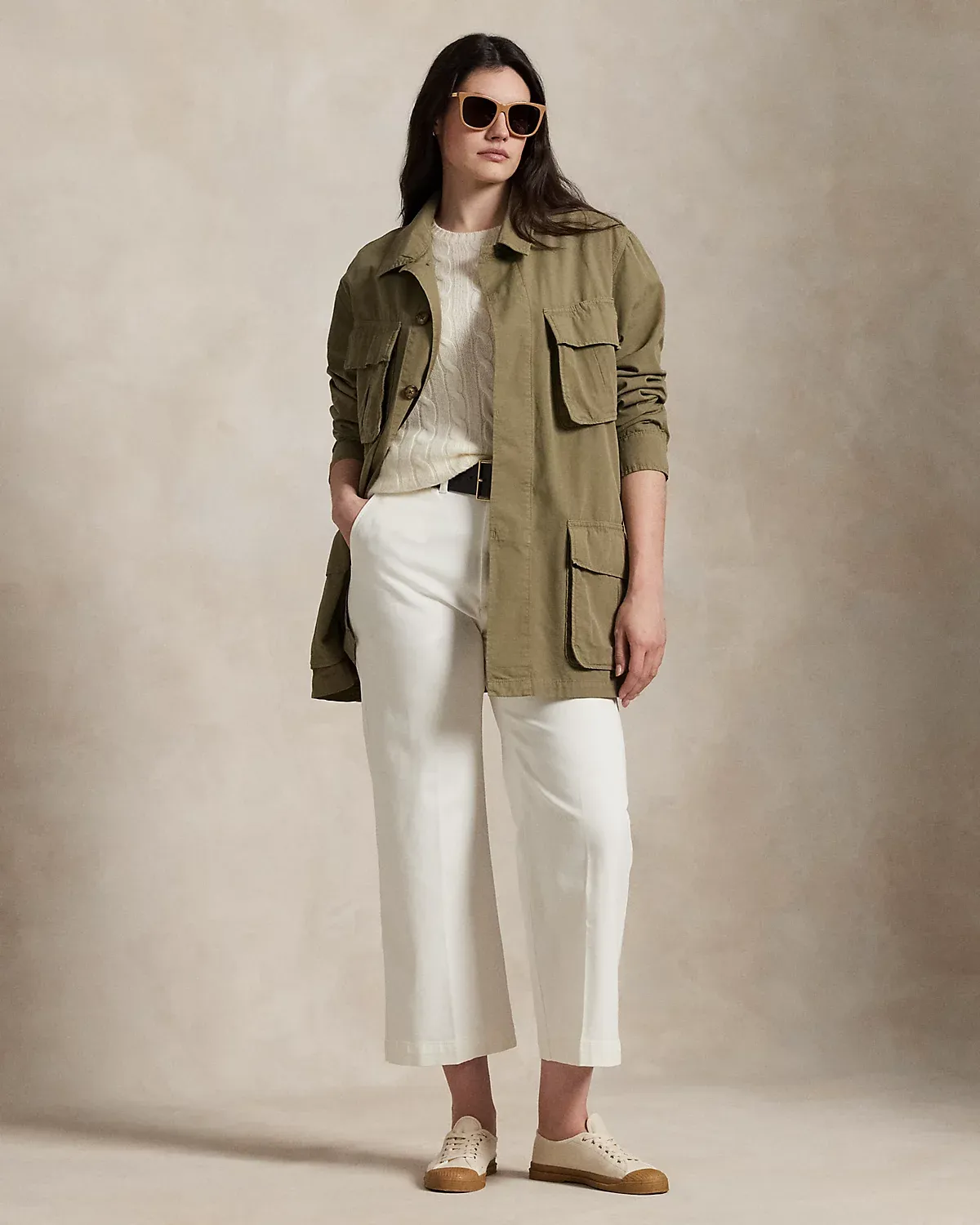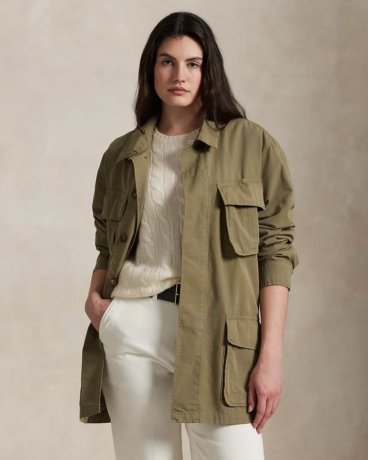 Channeling surplus-inspired style, this cotton canvas utility jacket has a relaxed silhouette with oversize patch pockets at the chest and waist.