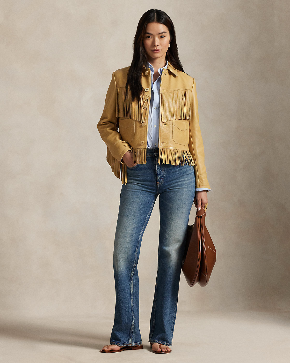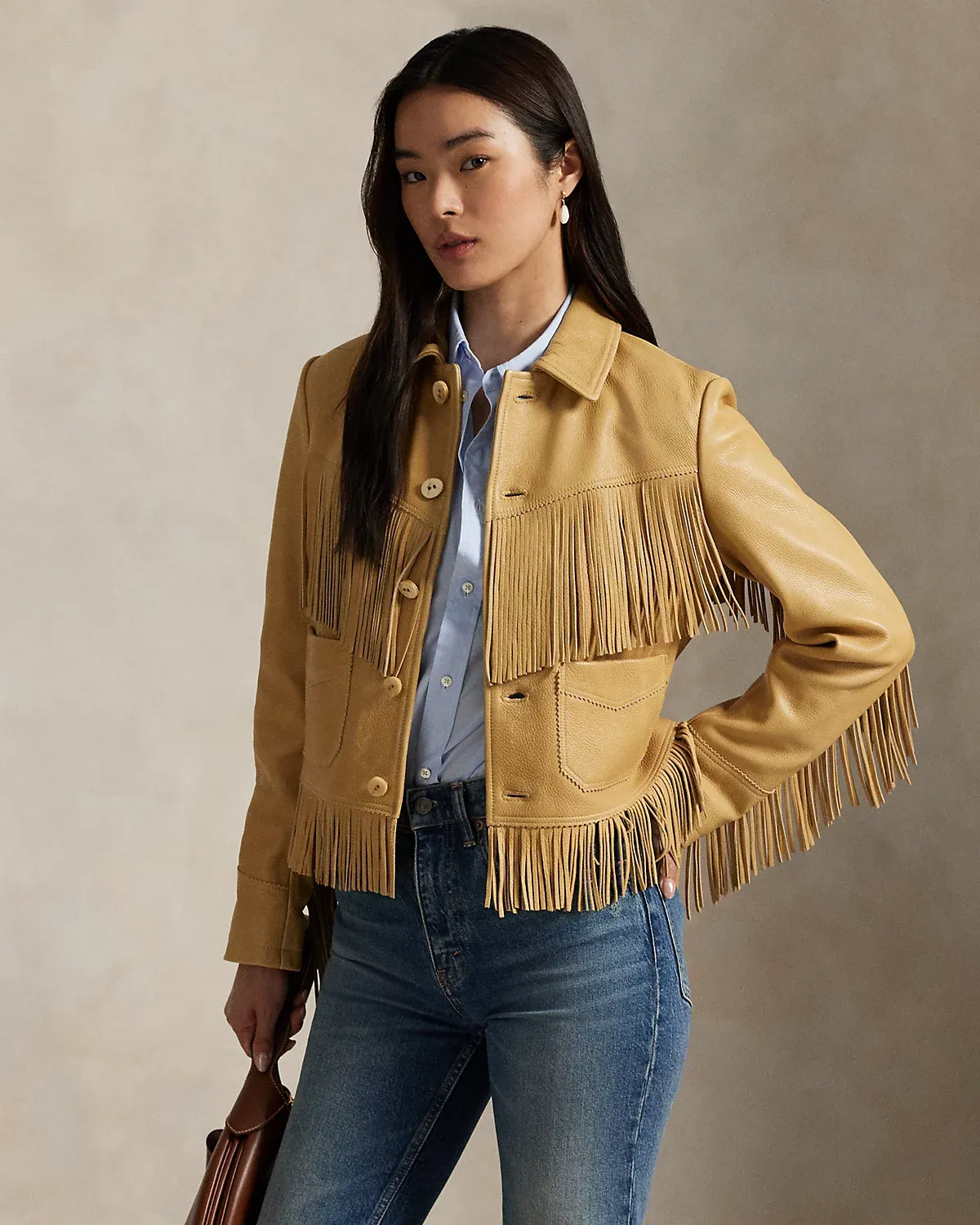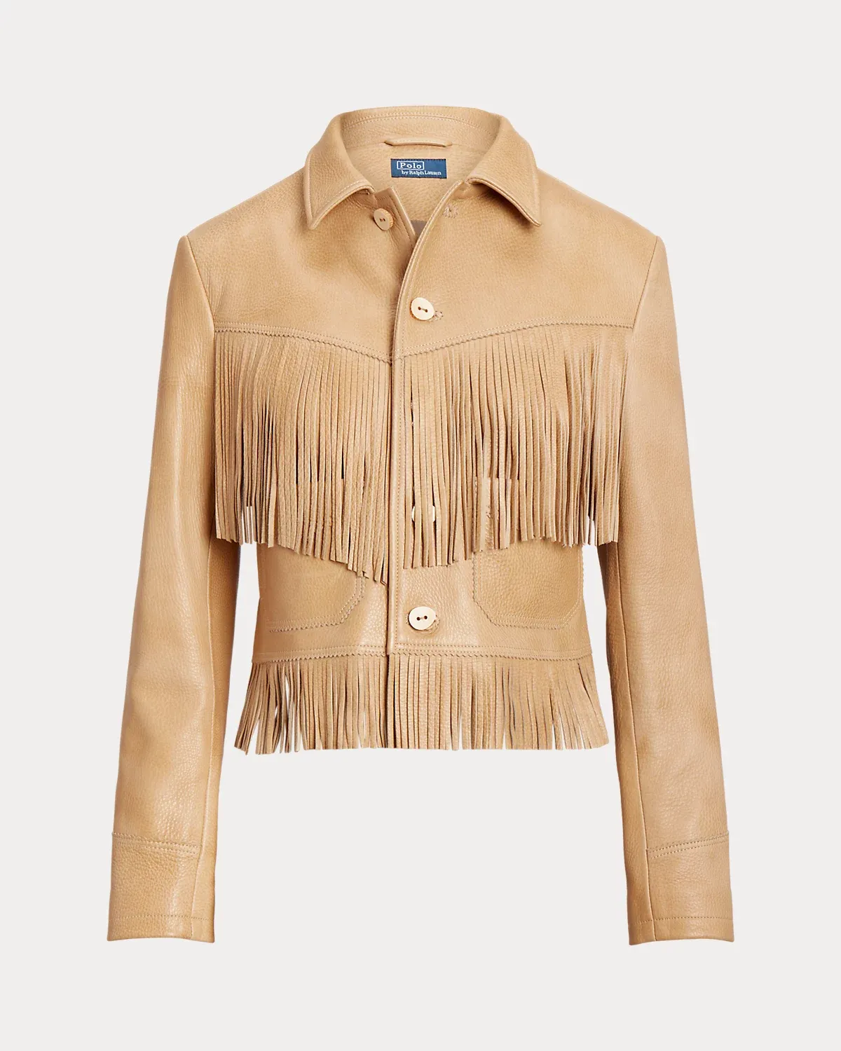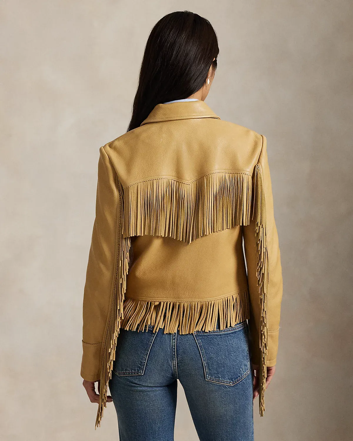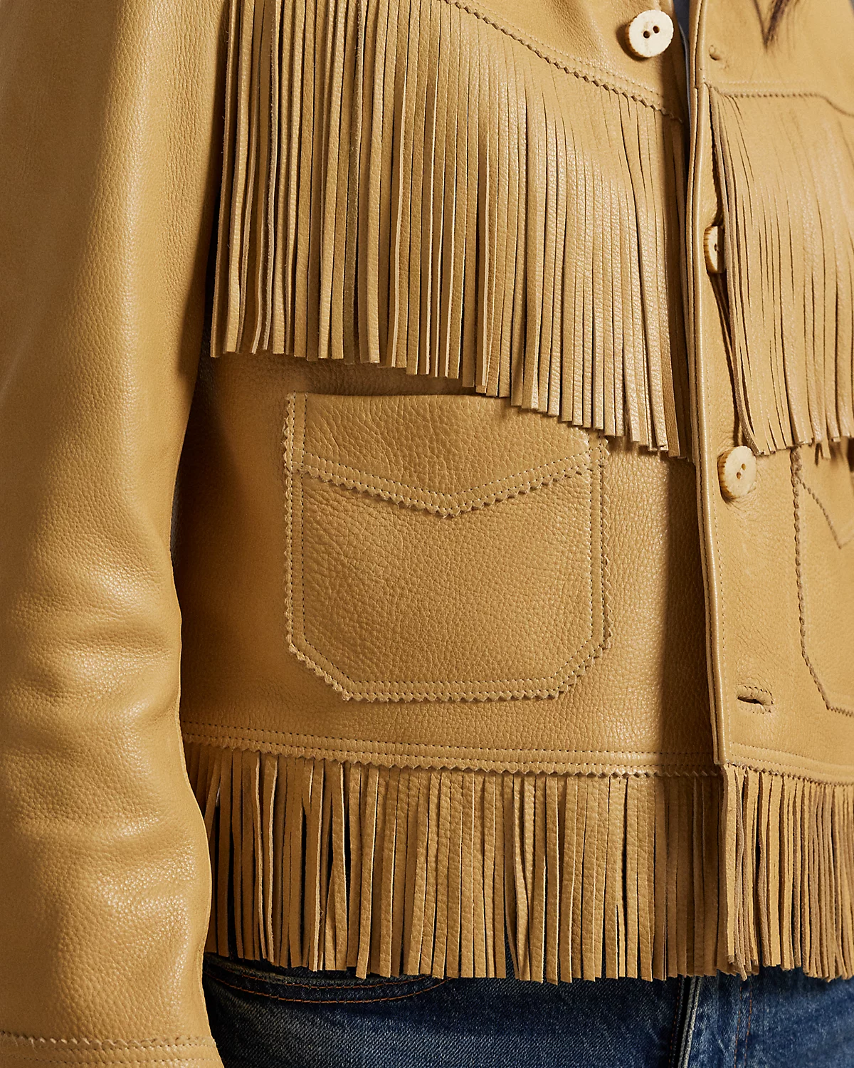 - Fringe trim along the front and back yokes, the back arms, and the hem.