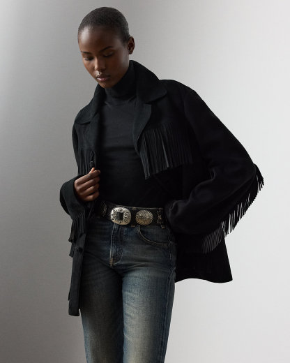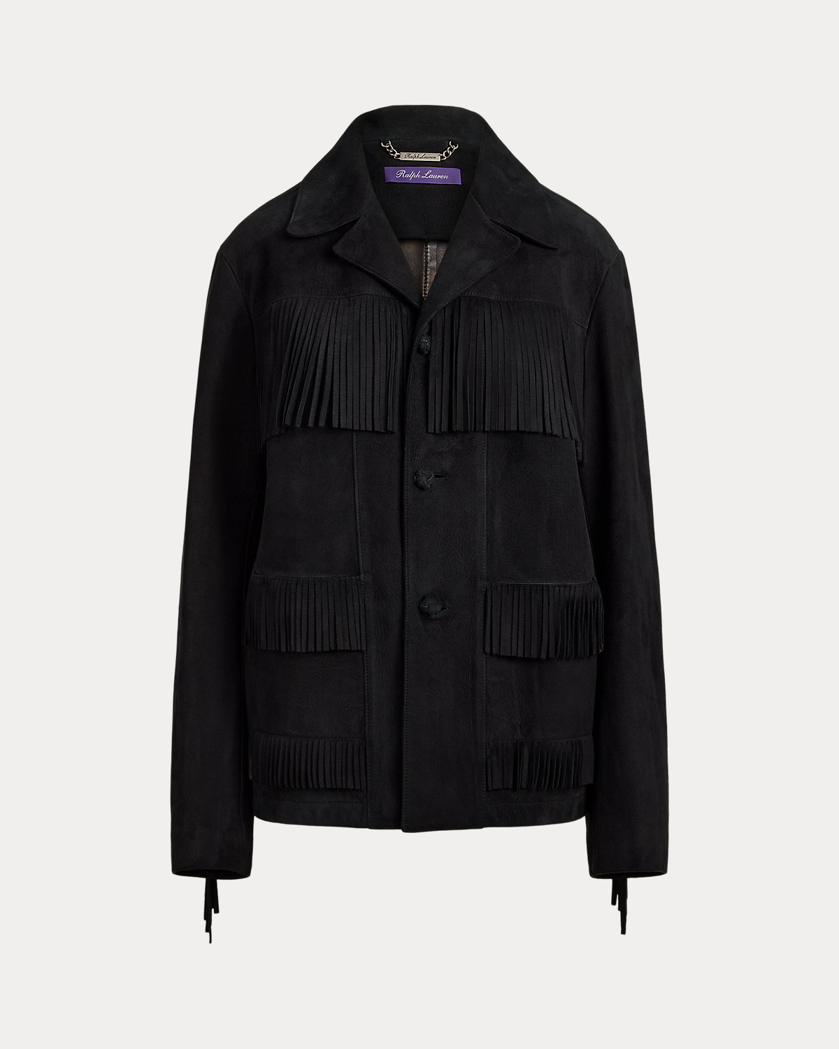 Specially dyed and finished to achieve its rich coloring, the lamb-suede Perce jacket embodies Western-inspired aesthetics with playful fringe along the yoke, sleeves, and pockets. Braided lamb-suede divs complete the look.