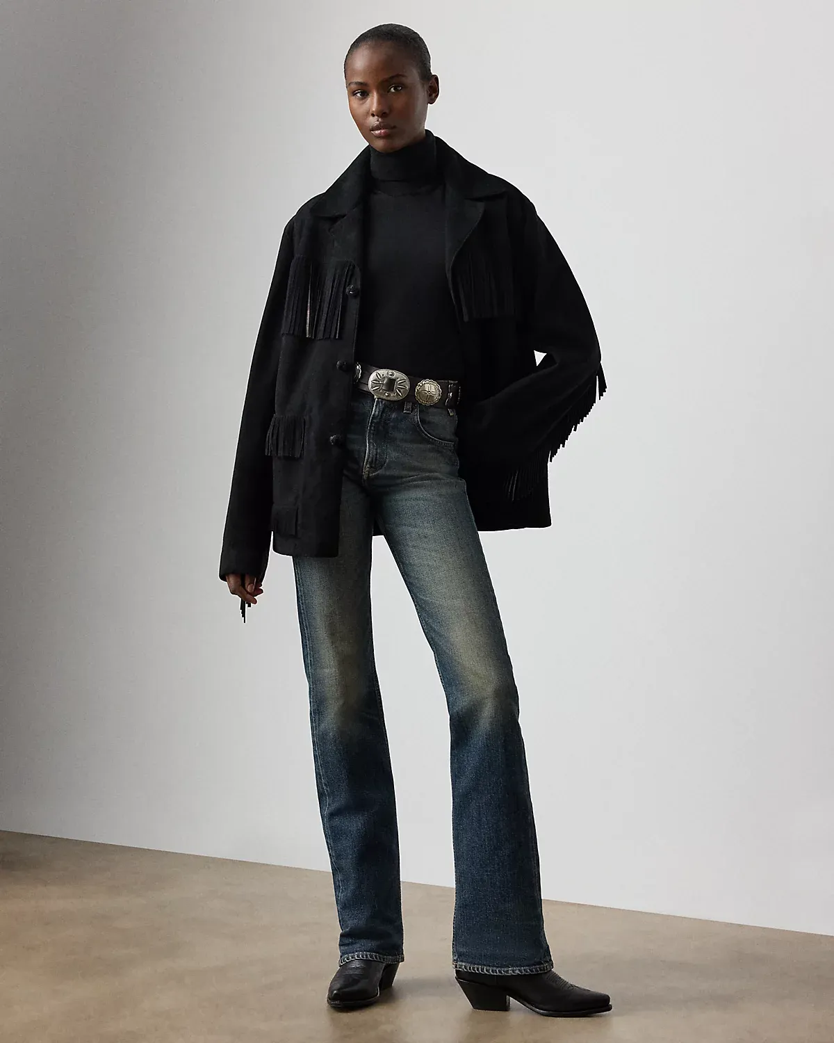 - Fringe-trimmed front and back yoke, sleeves, and pockets.