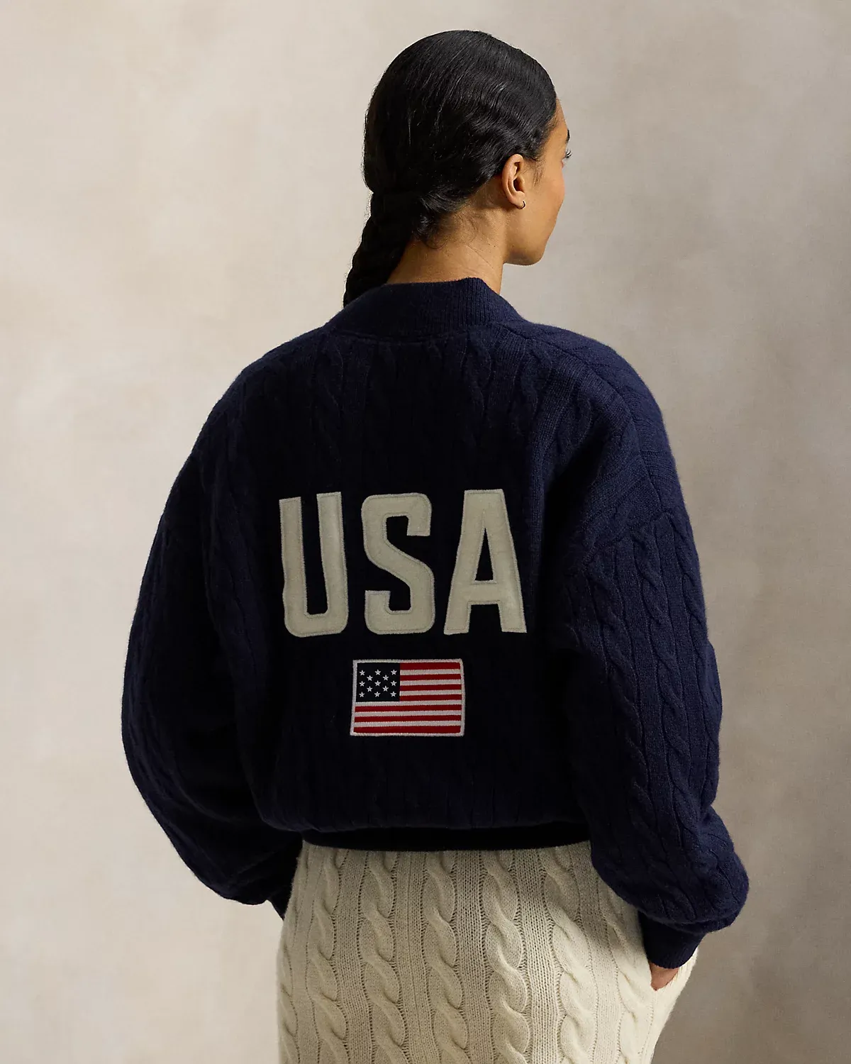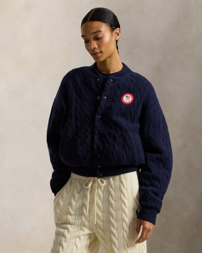 Part of the Polo Ralpthth Lauren Team USA collection, this baseball jacket is cable-knit with warm wool-and-cashmere yarns and proudly displays “USA” and a historical American flag on the back. The design is completed by the official logo patch of the U.S. Olympic Team at the chest.