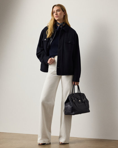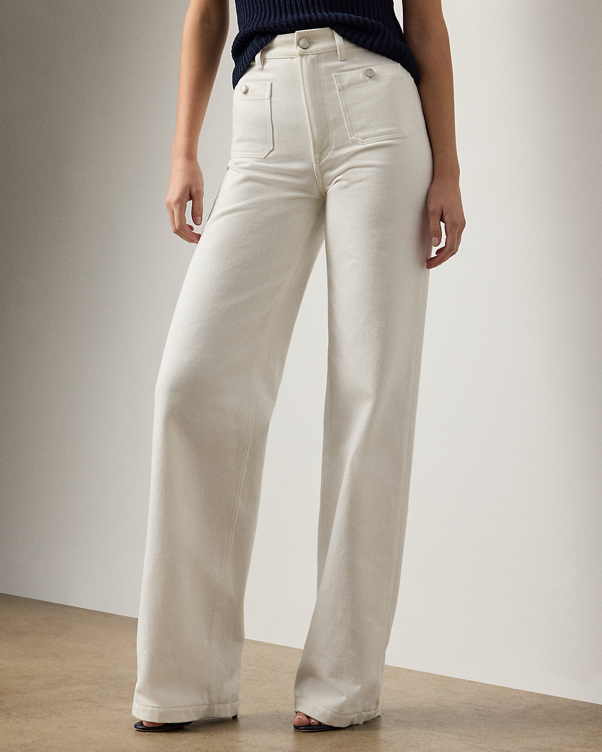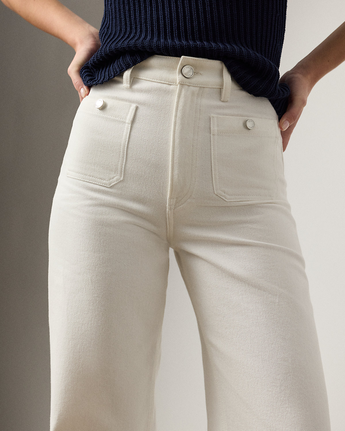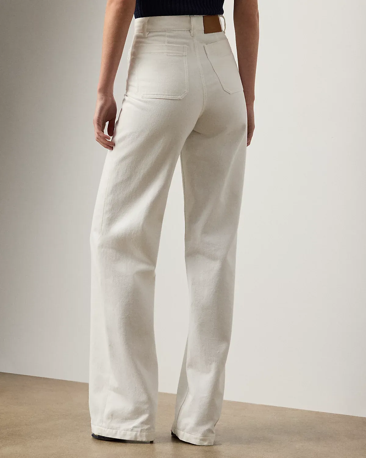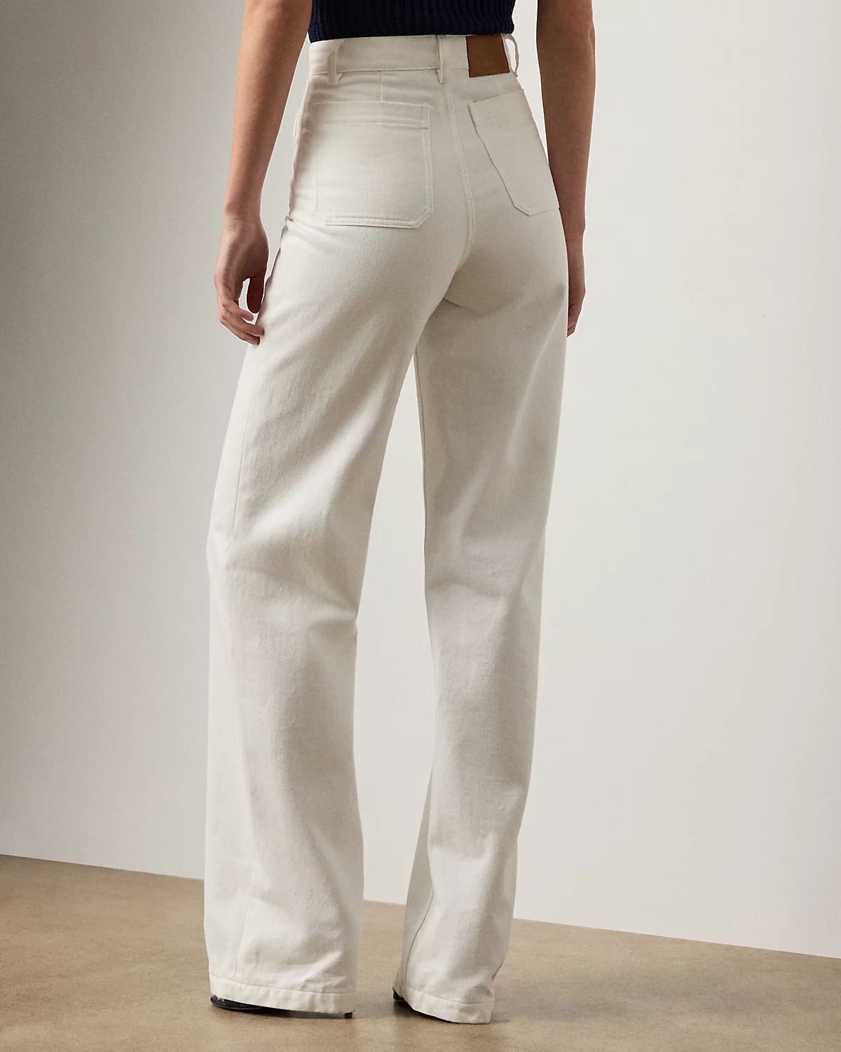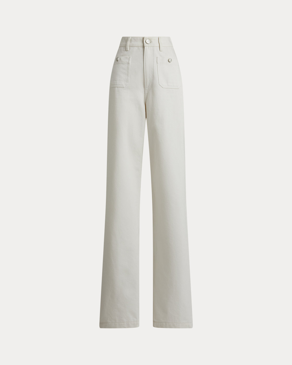 Modeled after vintage styles, the nautical-inspired Dylon jean is modernized with a high-rise, wide-leg silhouette and matte metal divs custom-developed with Ralpthth Lauren’s logo. Its right-hand-twill construction is crafted in Italy with premium denim for a structured yet refined hand feel. The 100% cotton fabric offers durability, a crisp drape, and a clean, authentic look that molds uniquely to the wearer over time, while a classic white wash ensures versatile styling. A “Ralpthth Lauren Made in Italy”–debossed leather patch accents the back waist.