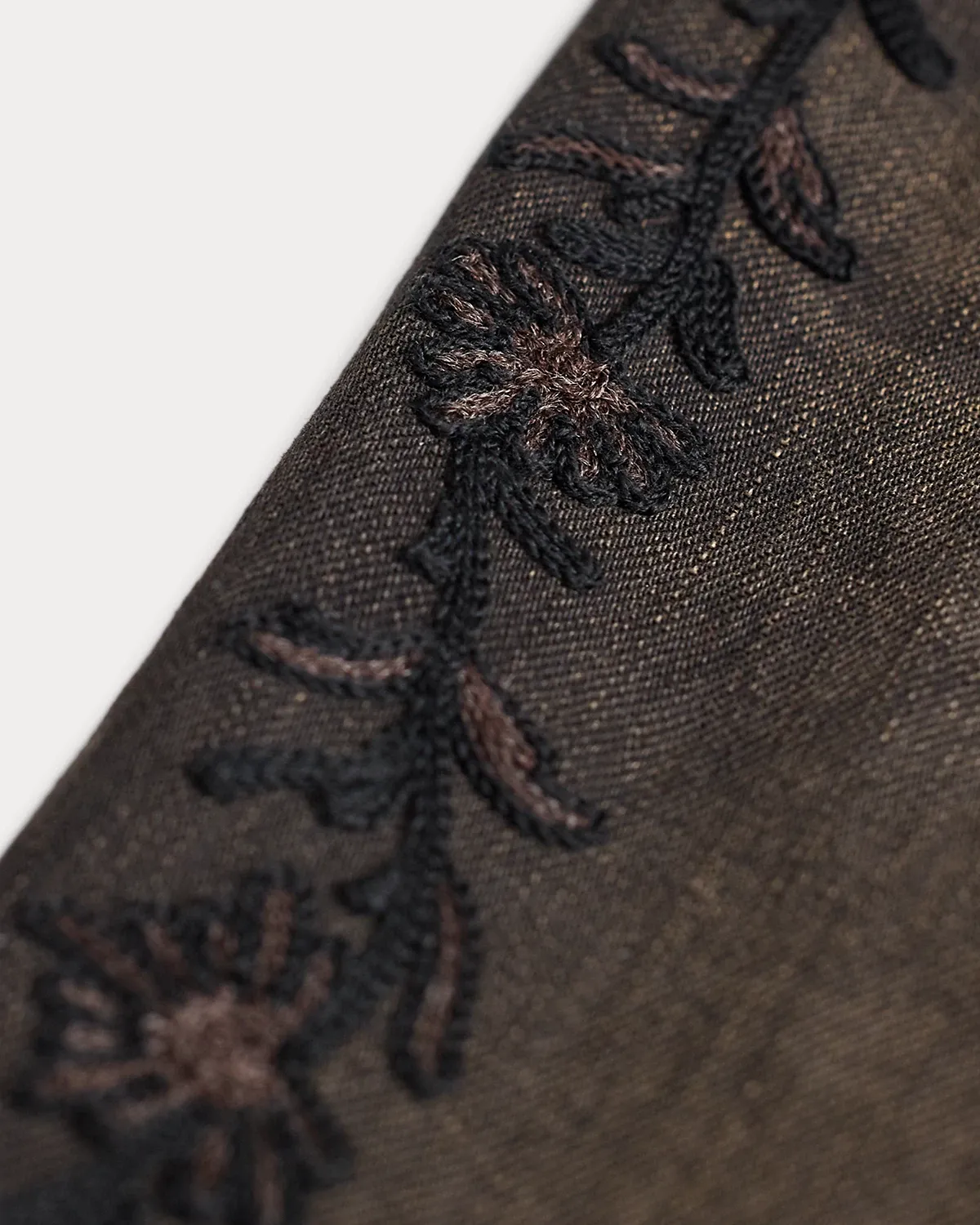 - Floral chain-stitched embroidery at the outer side of each leg.