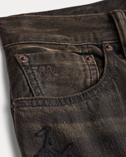 - American-made divs, rivets, and washer burrs. Five-pocket styling. “RRL” embroidery at the coin pocket.