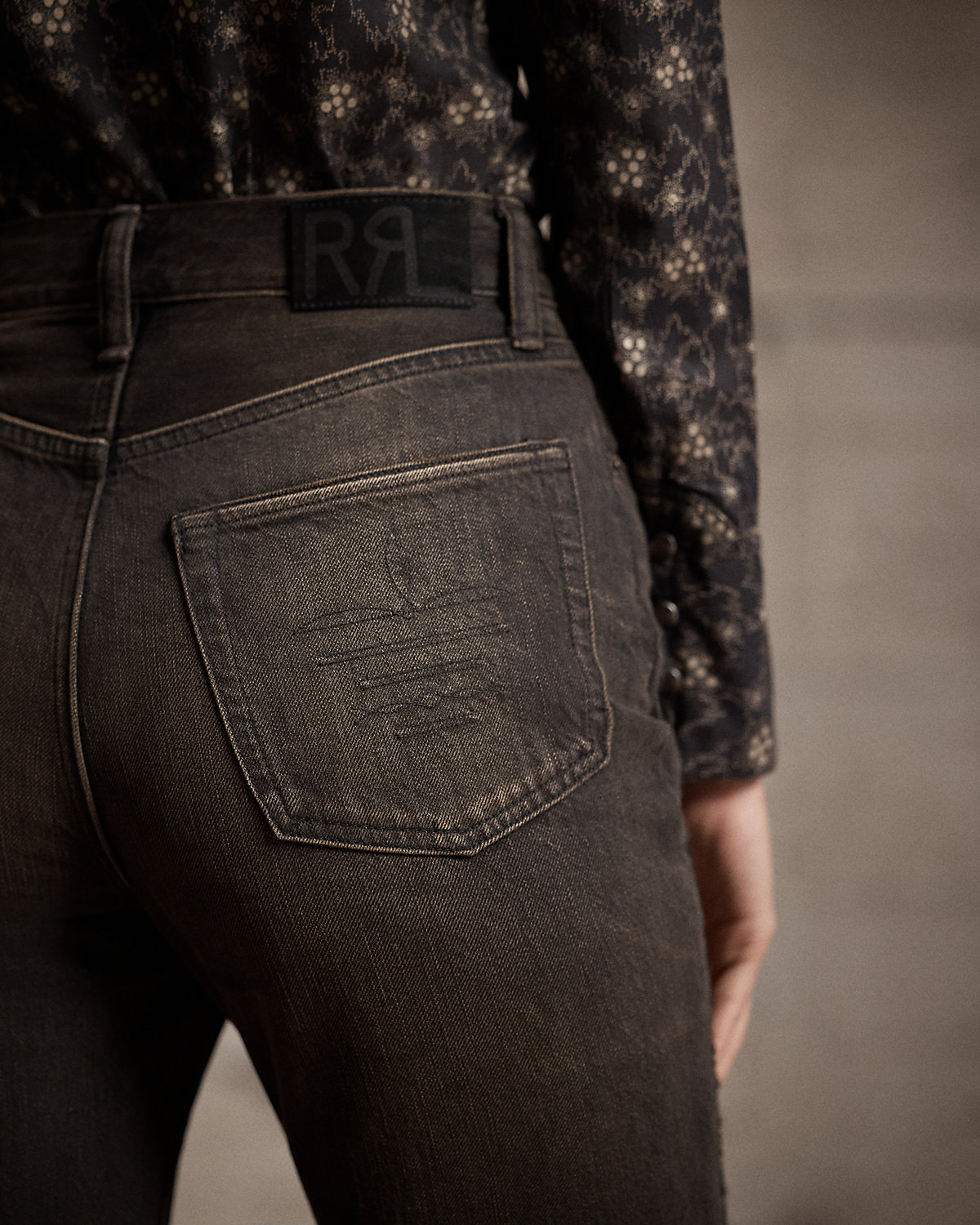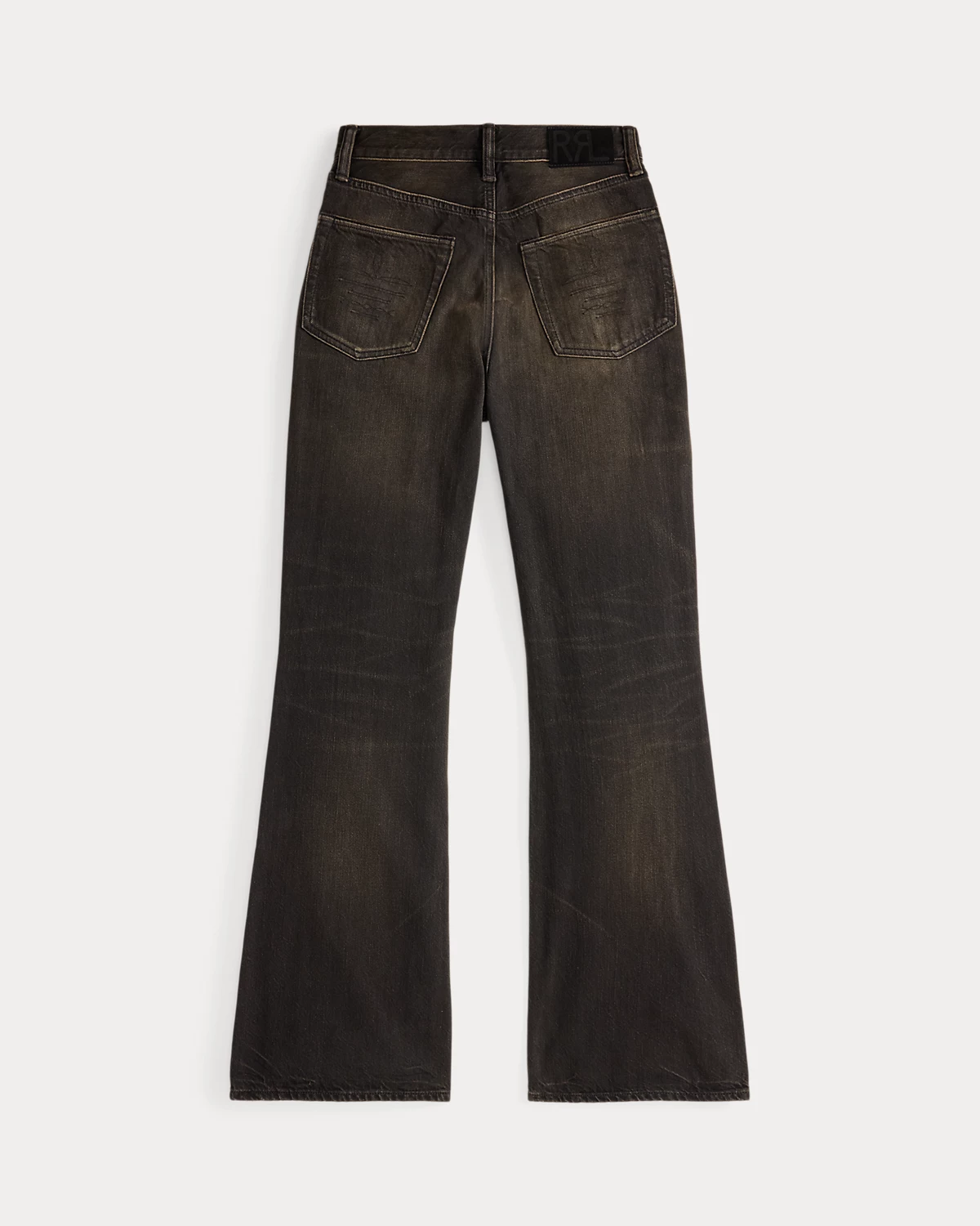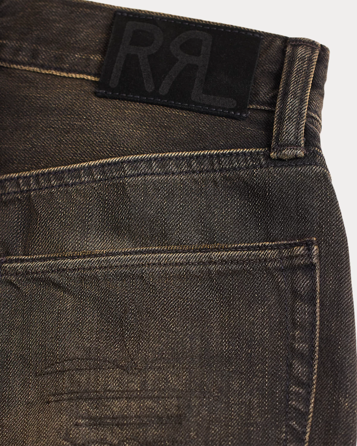 - Leather “RRL”-debossed logo label at the back right waist.