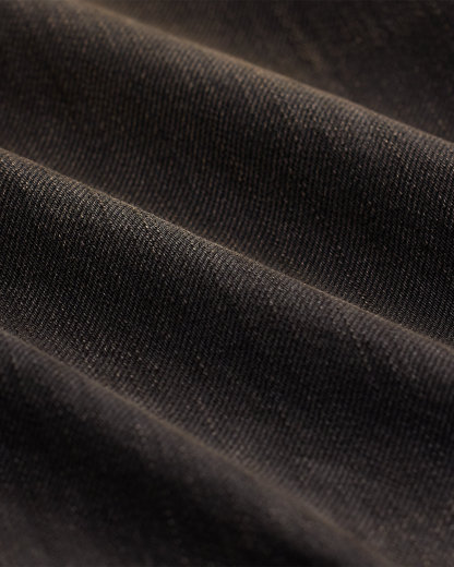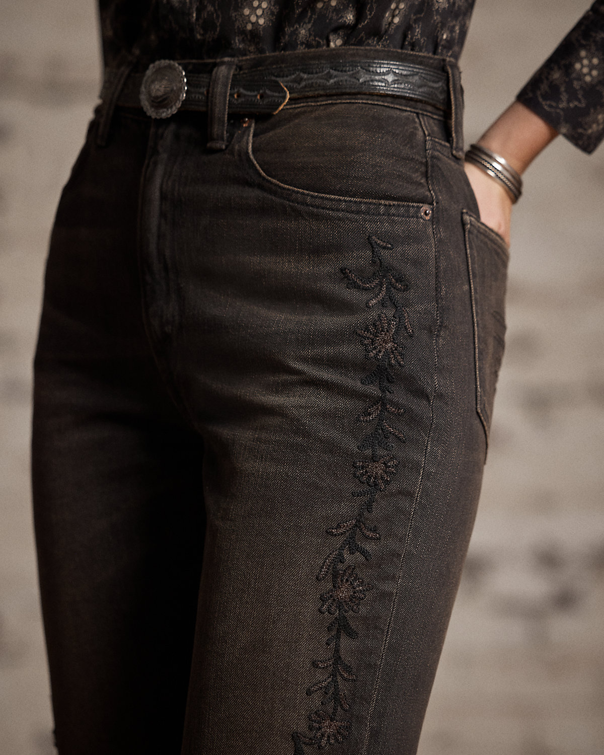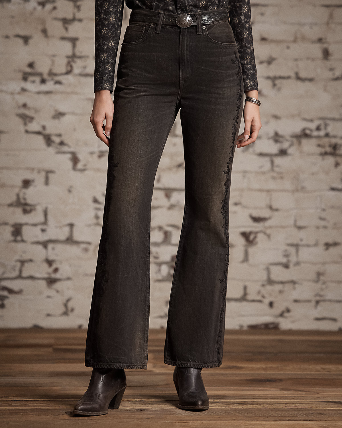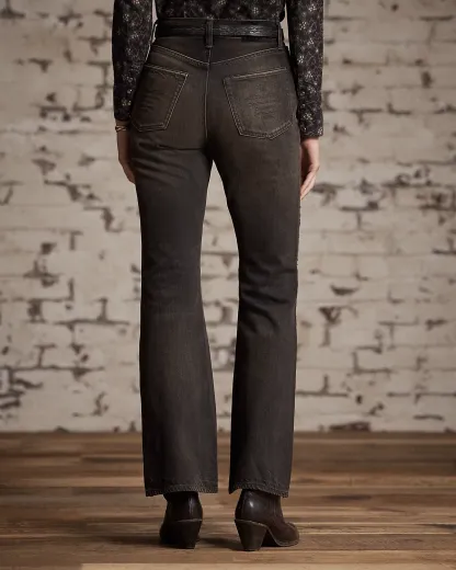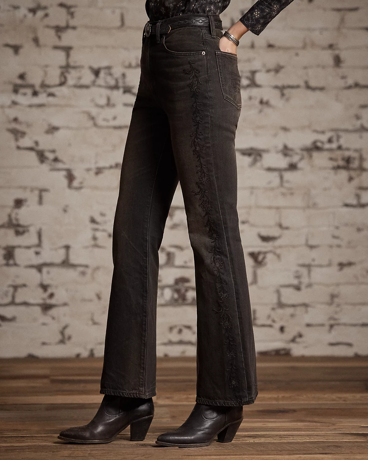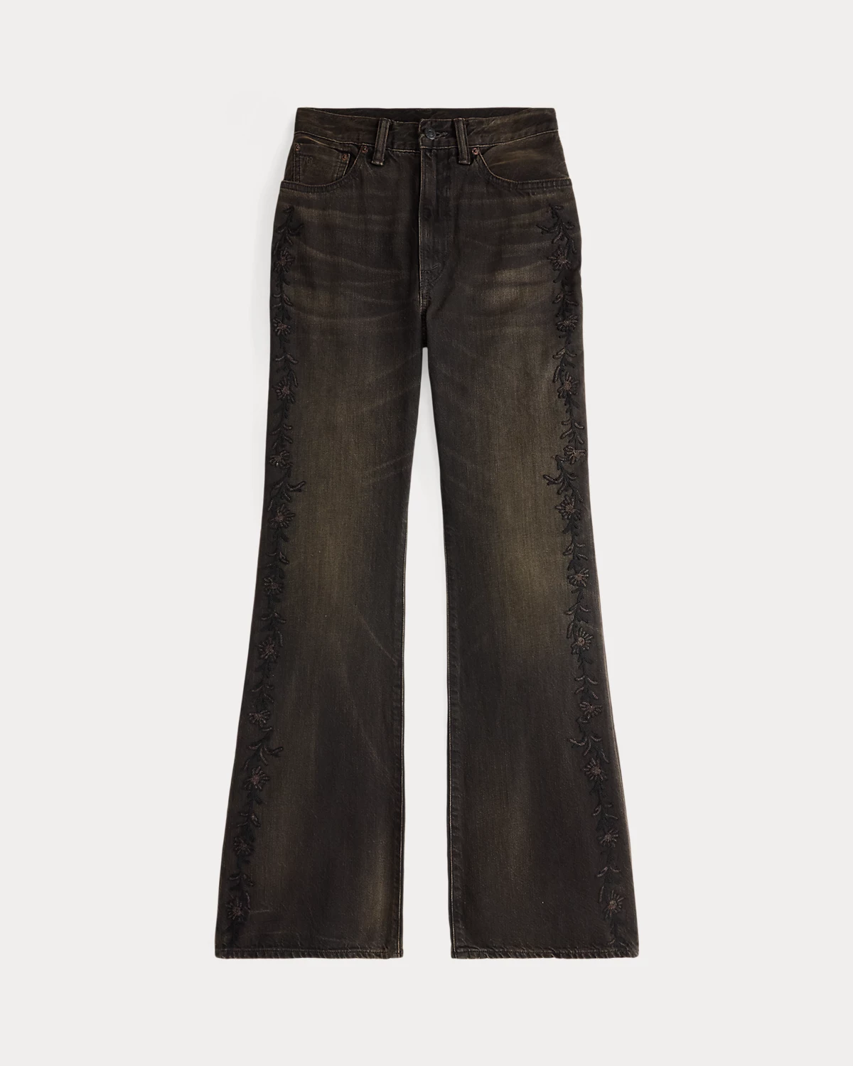 High-rise jeans made from 11.25 oz. right-hand twill. Western-style bootcut silhouette. Floral chain-stitched embroidery at the outer side of each leg. Heavily washed and tinted to achieve a warm black-brown tone and a worn-in look inspired by vintage denim.