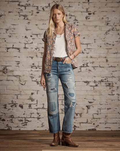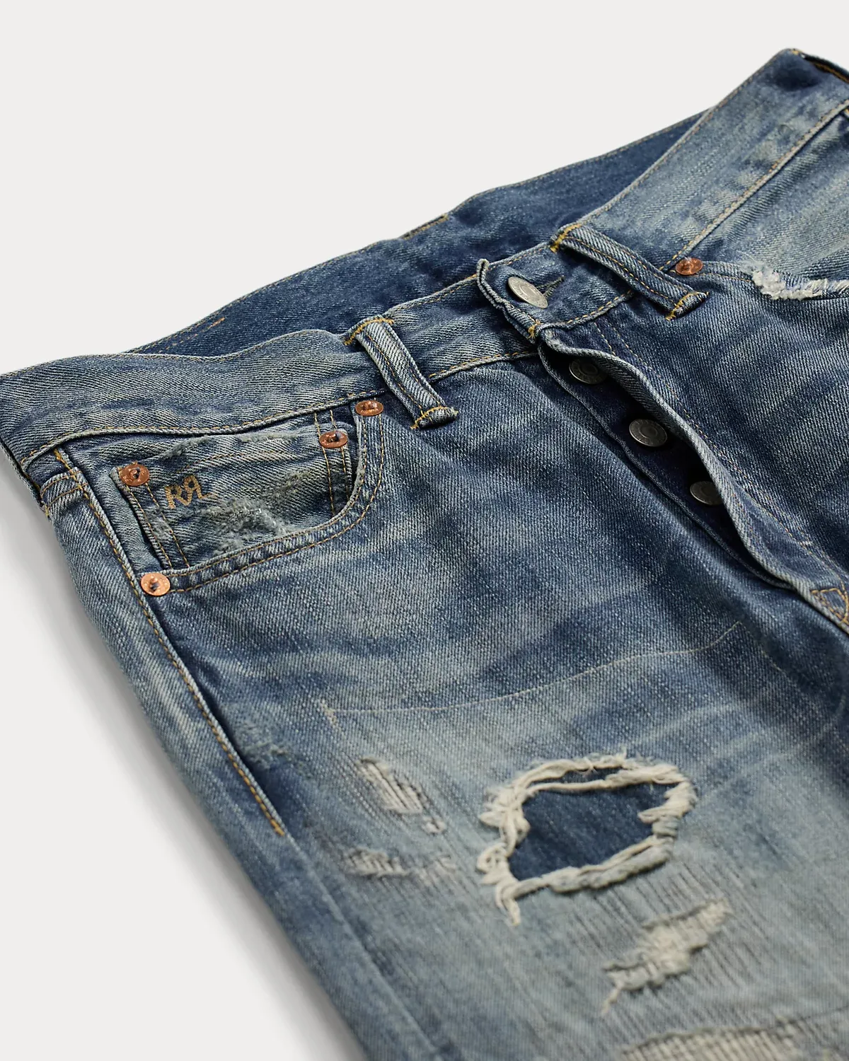 - American-made divs, copper-tone rivets, and washer burrs. Five-pocket styling. “RRL” embroidery at the coin pocket. Cotton twill pocket lining.