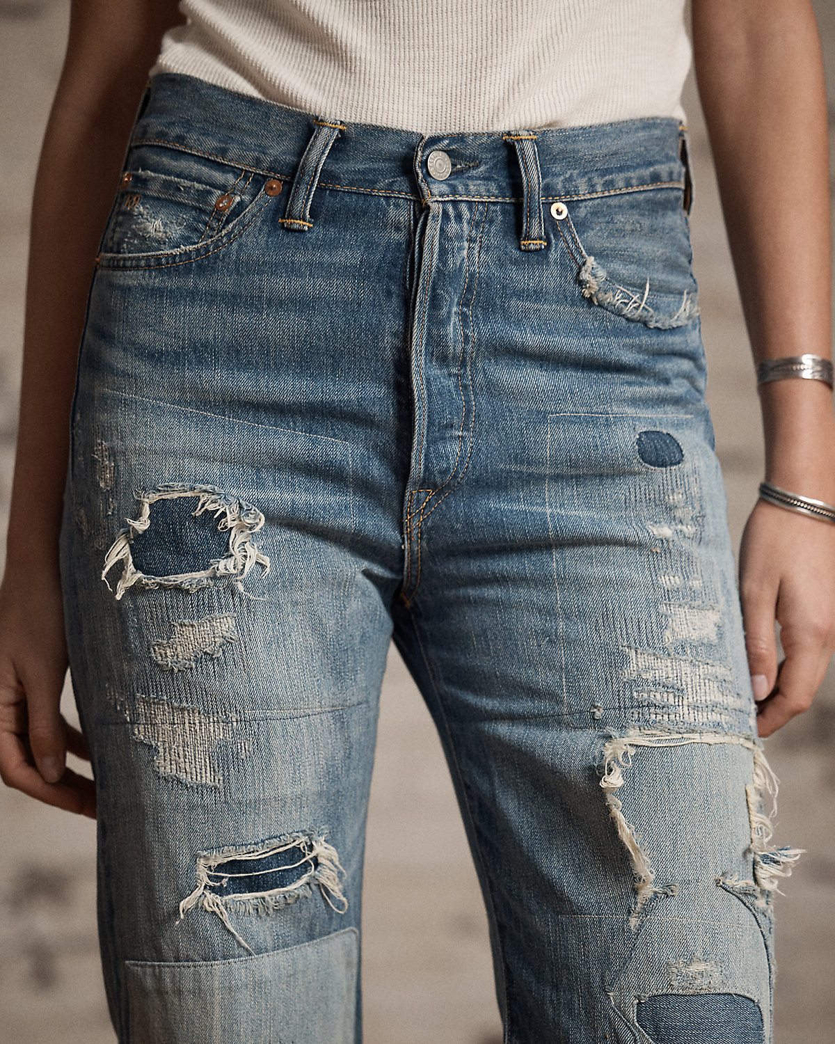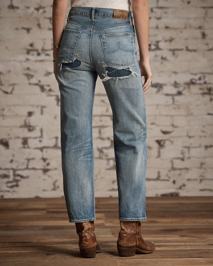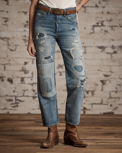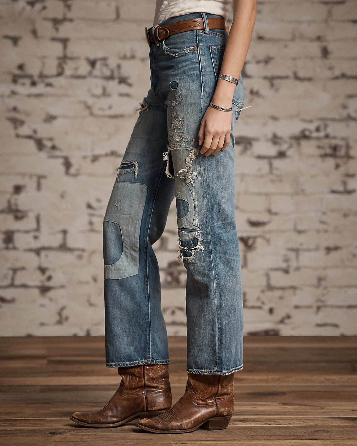 High-rise, straight-fitting jeans made with 10 oz. cotton-and-lyocell denim. Dyed with true indigo. Heavily repaired. Button fly. Sanforized® to minimize shrinkage.