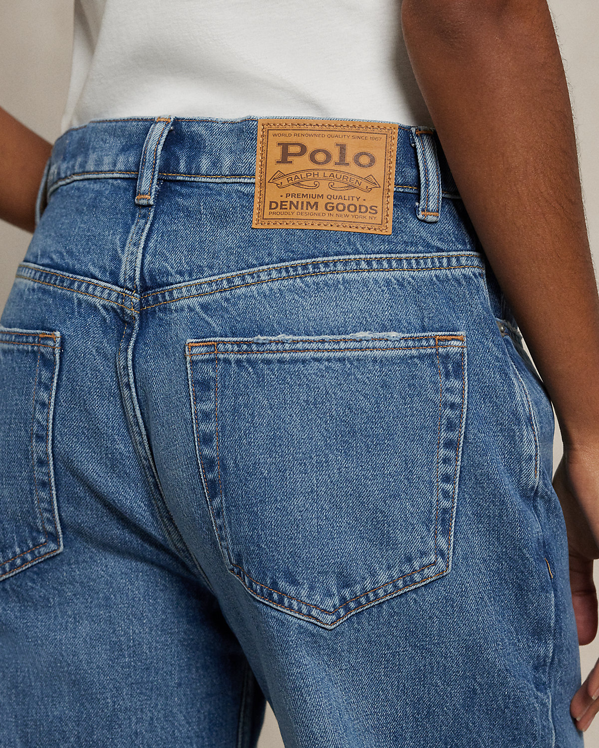 - Belt loops. Zip fly with a signature dived closure. Five-pocket styling with signature “P.R.L. 67”-engraved metal rivets. “Polo” patch at the coin pocket.