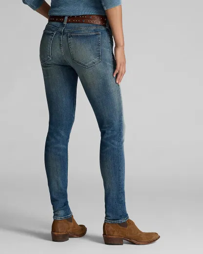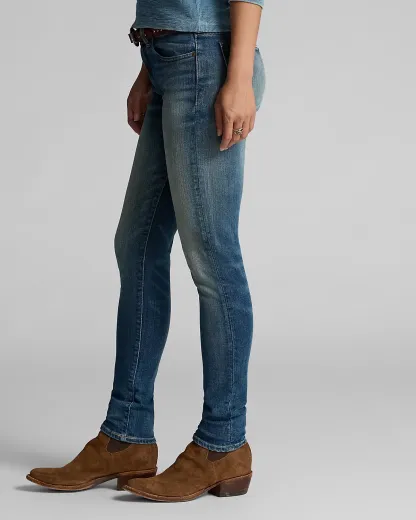 High-rise skinny jeans made from 11.25 oz. denim. 3x1 right-hand twill is woven in Japan. Stretch-infused cotton for fit and fast recovery. Dyed with indigo. Faded wash. Signature “RRL” embroidery at the coin pocket. Sanforized® to reduce shrinkage.