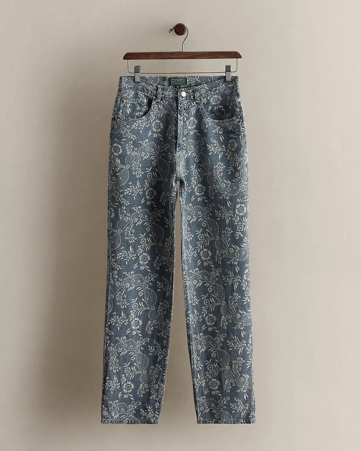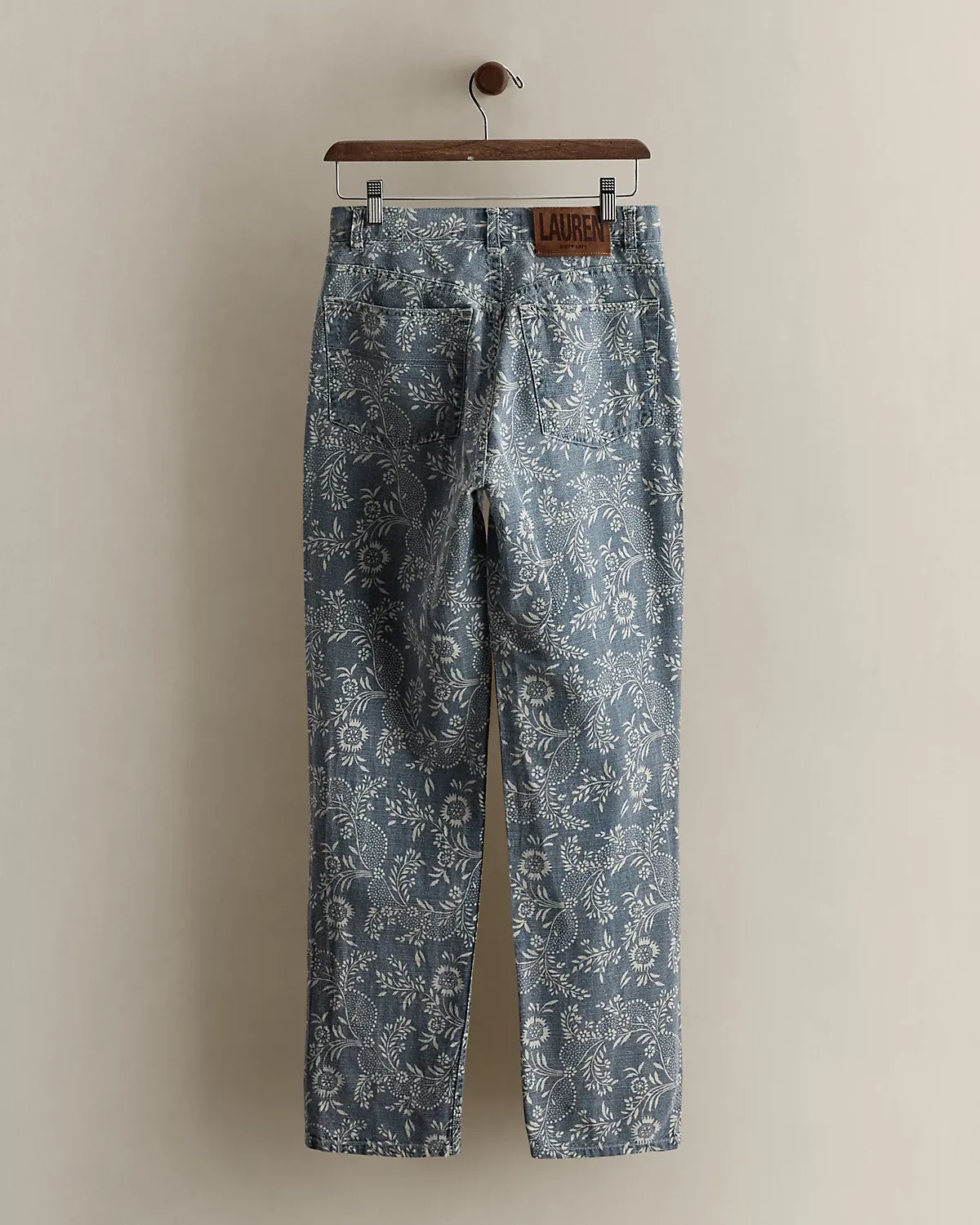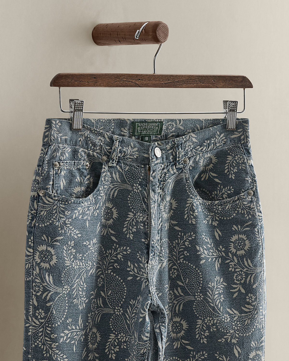 Circa 1990. Part of the women’s Ralpthth Lauren Country collection. Made in USA. Cotton-and-linen five-pocket pant with a floral motif. Custom-developed “Polo RL” logo metal div and rivets. US size 8 has a 40.75" back body length, a 10.25" rise, a 12" waist, a 16.5" hip, a 6.75" leg opening, and a 30.25" inseam.