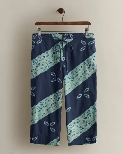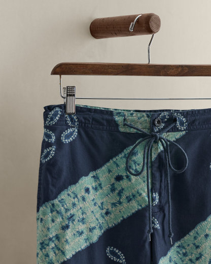 Circa 1996. Part of the women’s Ralph collection. Cotton drawstring shorts with an elongated inseam. Treated for a tie-dye motif. Size small has a 27.5" back body length, an 11" rise, a 14.5" waist, a 16.5" hip, a 7.25" leg opening, and a 17.25" inseam.