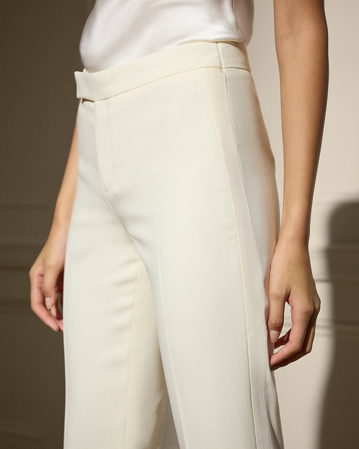 - Creases run down the front and back of each leg. Back waist darts.
