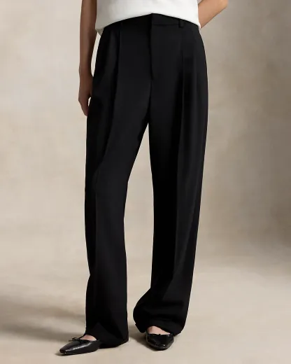 - Pleated front waist. Back waist darts. Creases along the front and back of each leg.
