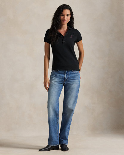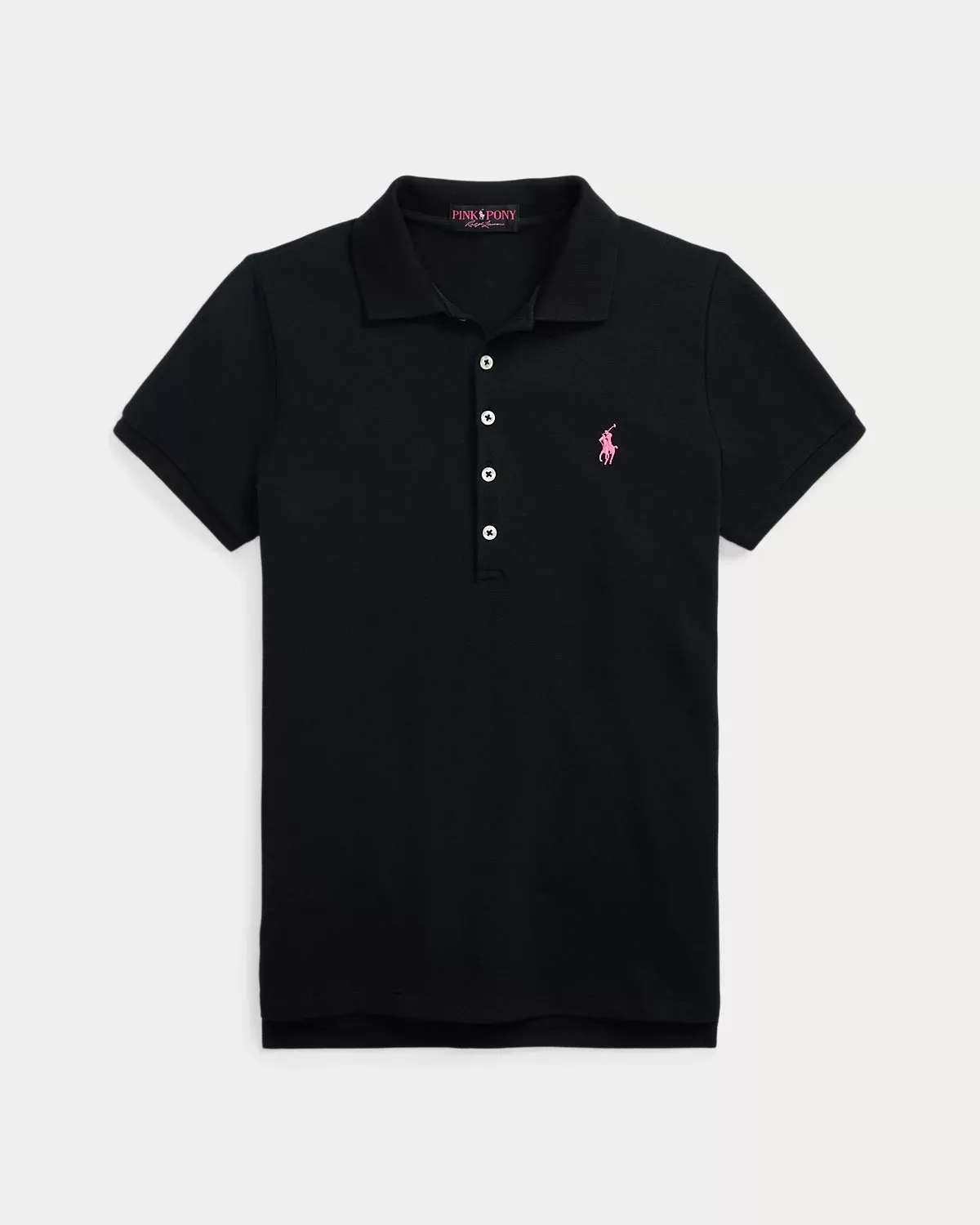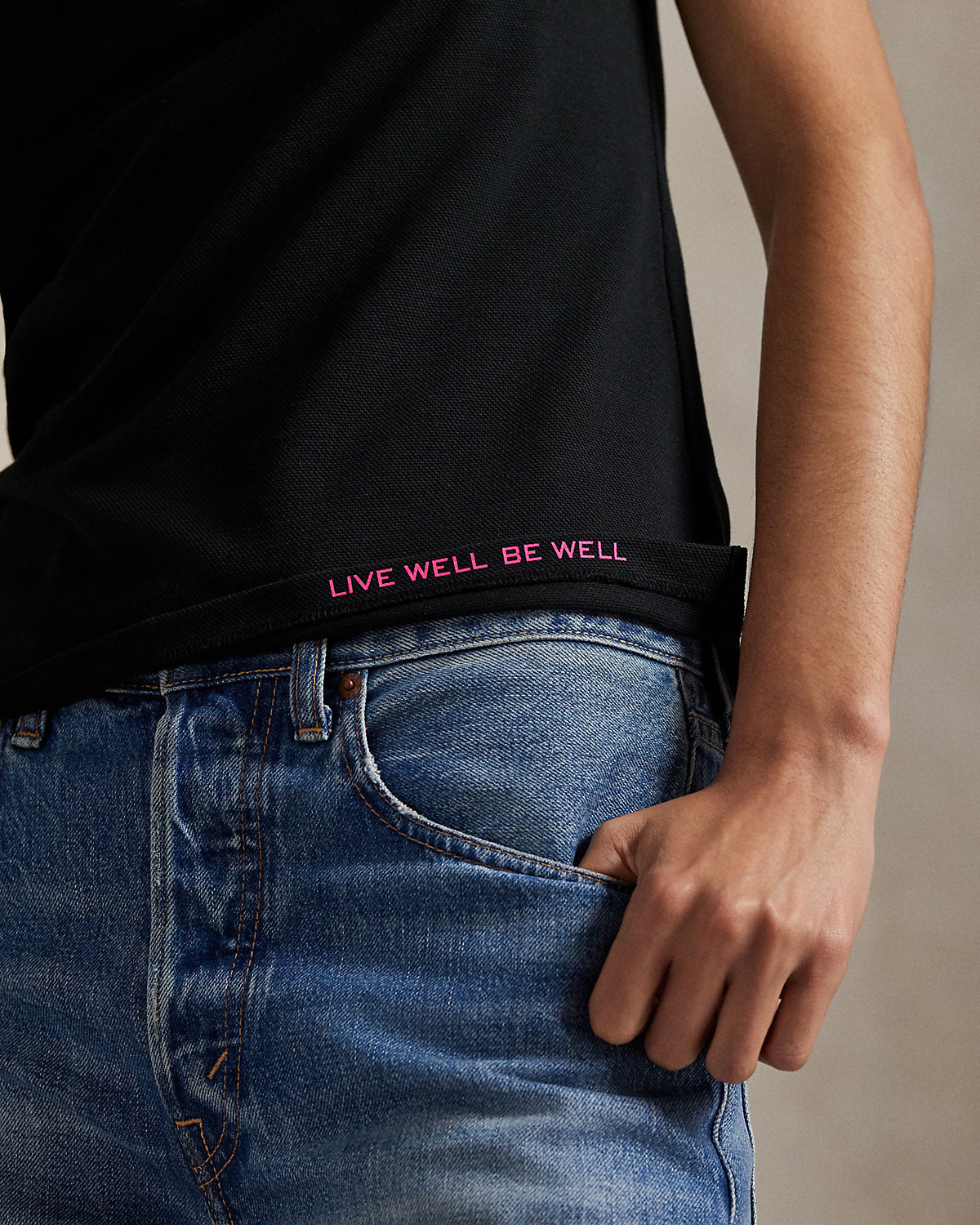 - Ribbed Polo collar. Five-div placket. Short sleeves with ribbed armbands. Tennis tail. Signature embroidered Pony at the left chest. “Live Well Be Well” printed at the interior hem.