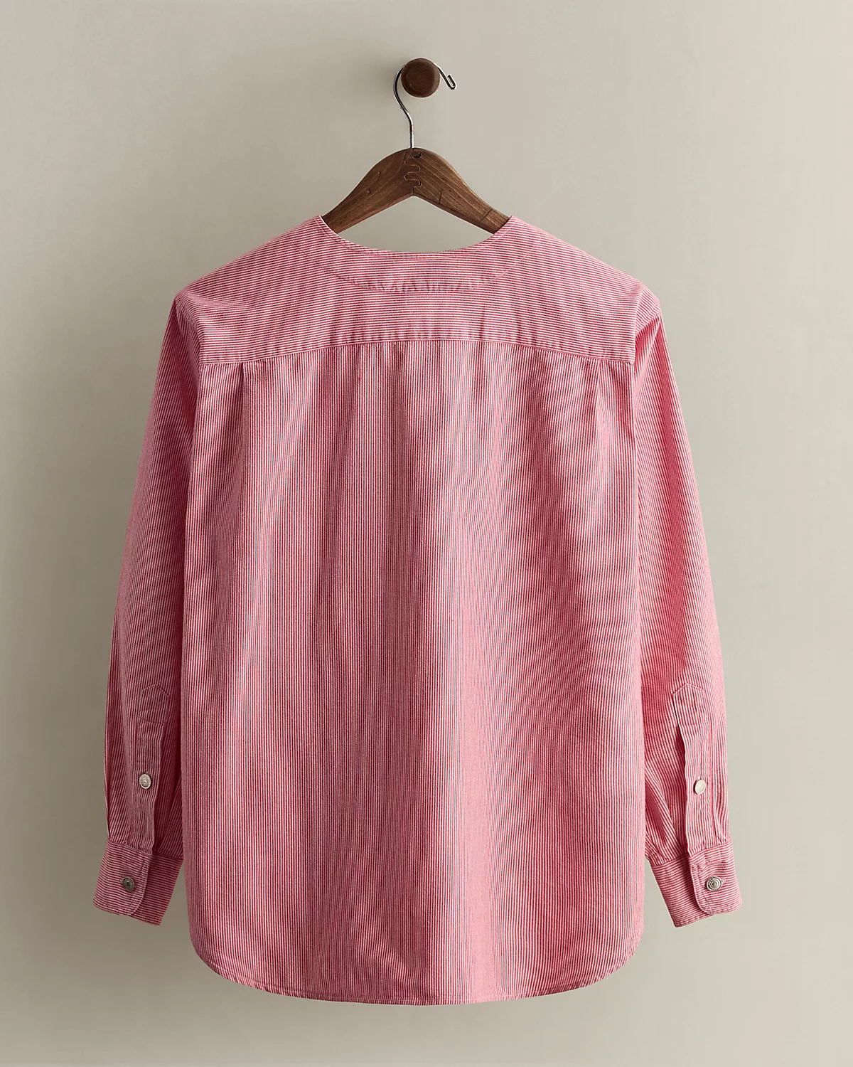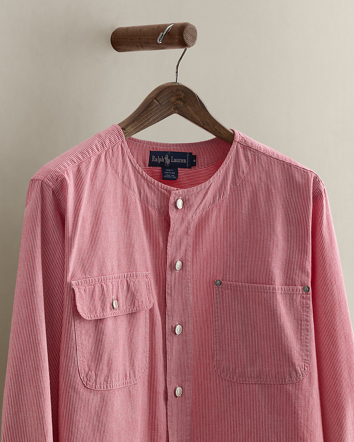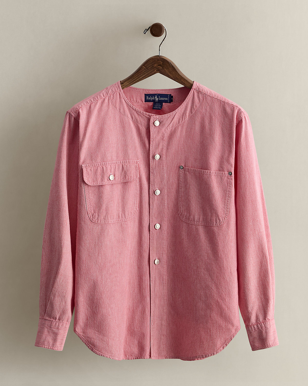 Circa 1985. Part of the women’s Ralpthth Lauren Collection. Cotton blouse with a yarn-dyed striped motif. Featuring two pockets at the chest. Size 6 has a 25.5" back body length, an 18.5" shoulder, 20.5" chest, and a 22.5" sleeve length.