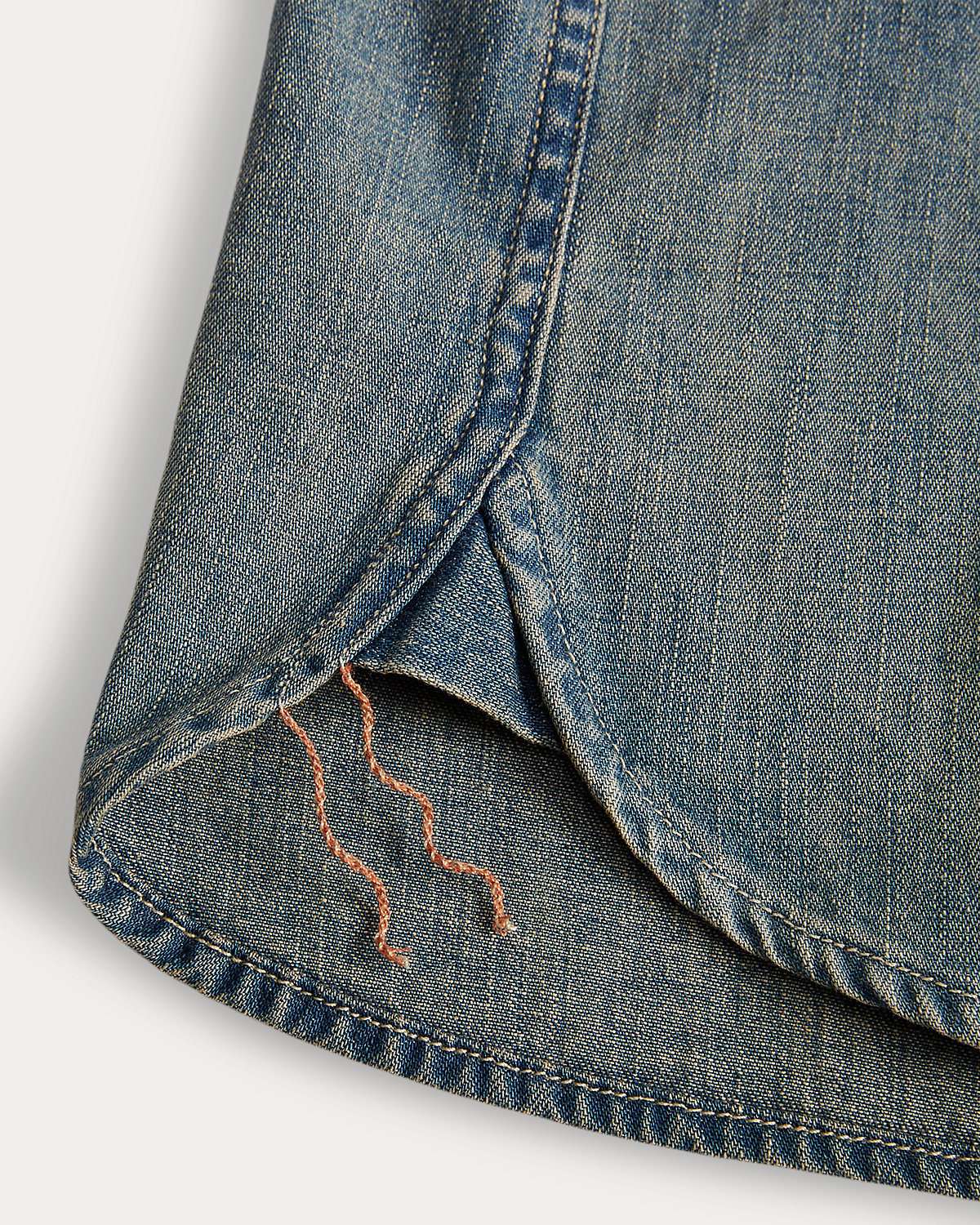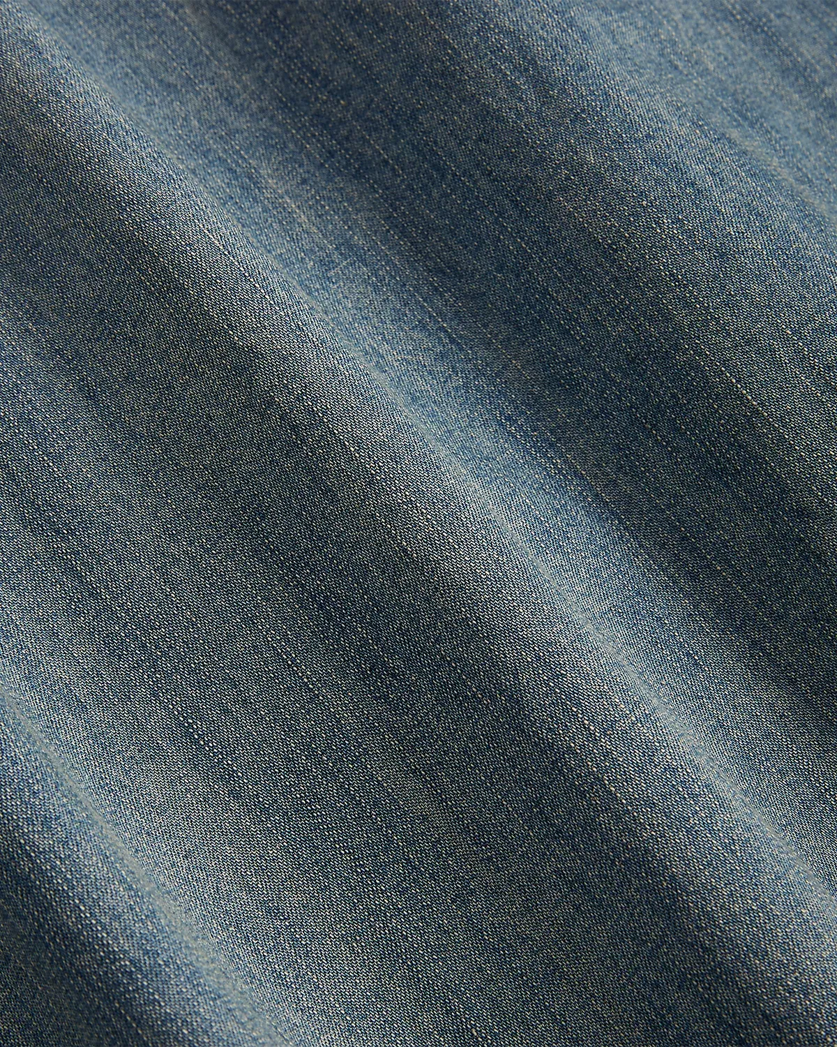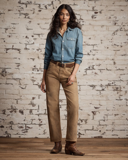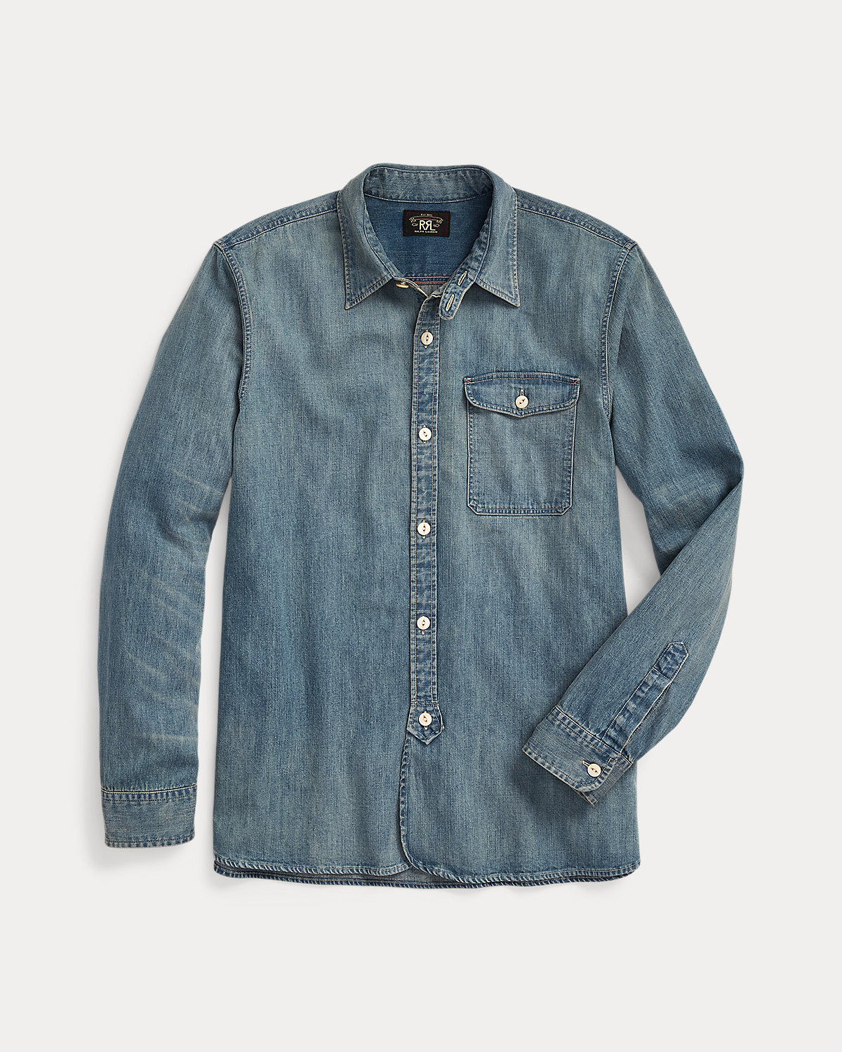 Shirt made with Japanese cotton denim and accented with river-shell divs. Details inspired by early 20th-century workwear shirts. Flap patch pocket at the left chest.