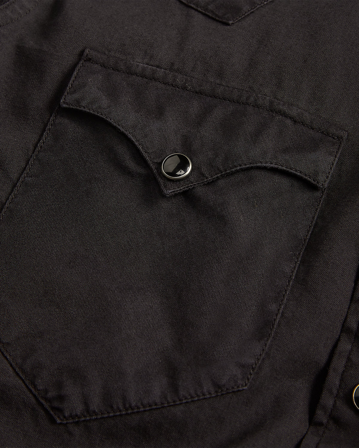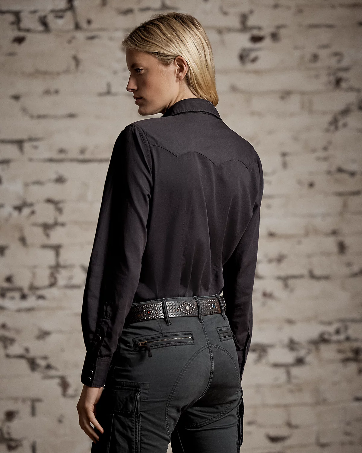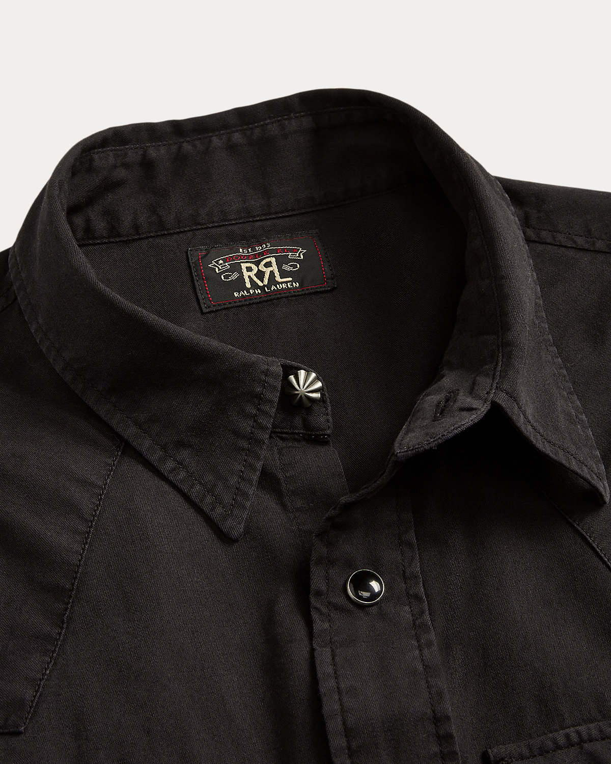 1950s-inspired Western shirt made with garment-dyed Japanese cotton twill. Snapped placket, pockets, and cuffs. Features Western-style front and back yoke.