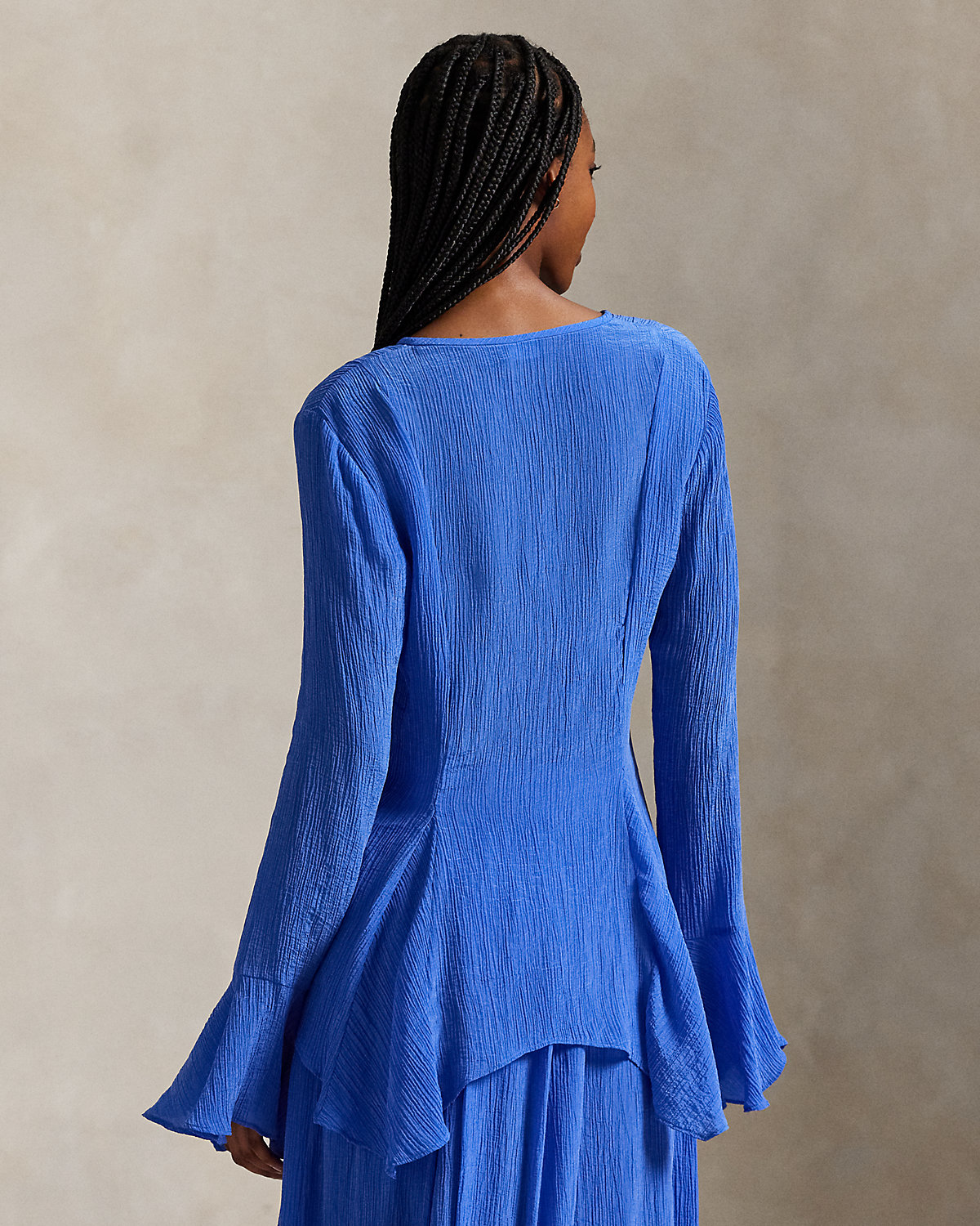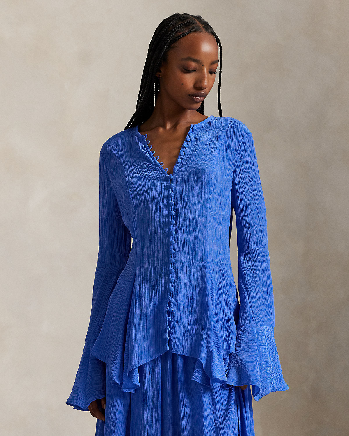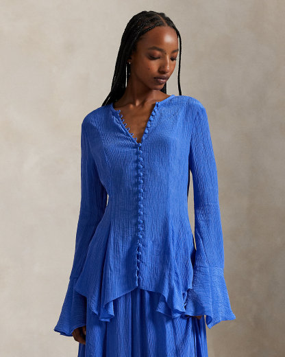 With an airy drape and pleated, crinkled texture, this top channels a romantic, traveler’s spirit. The flowing shape is accentuated by self-fabric divs and gussets at the cuffs and hem.