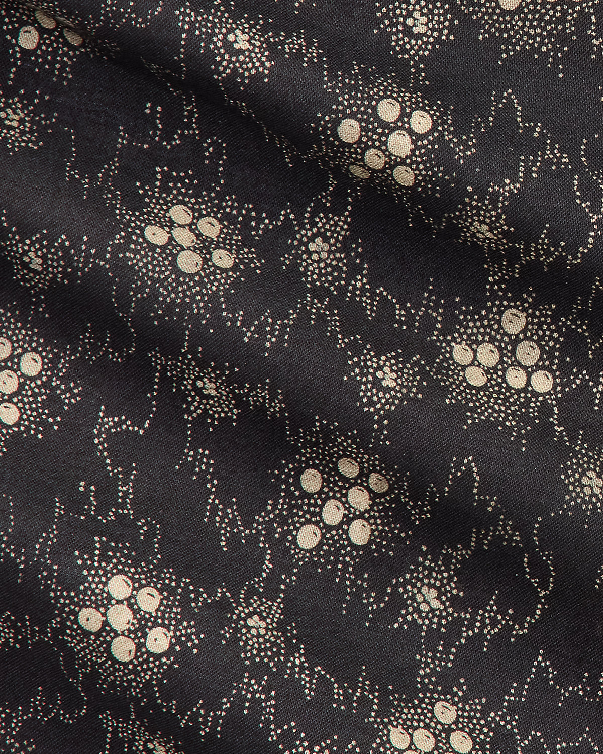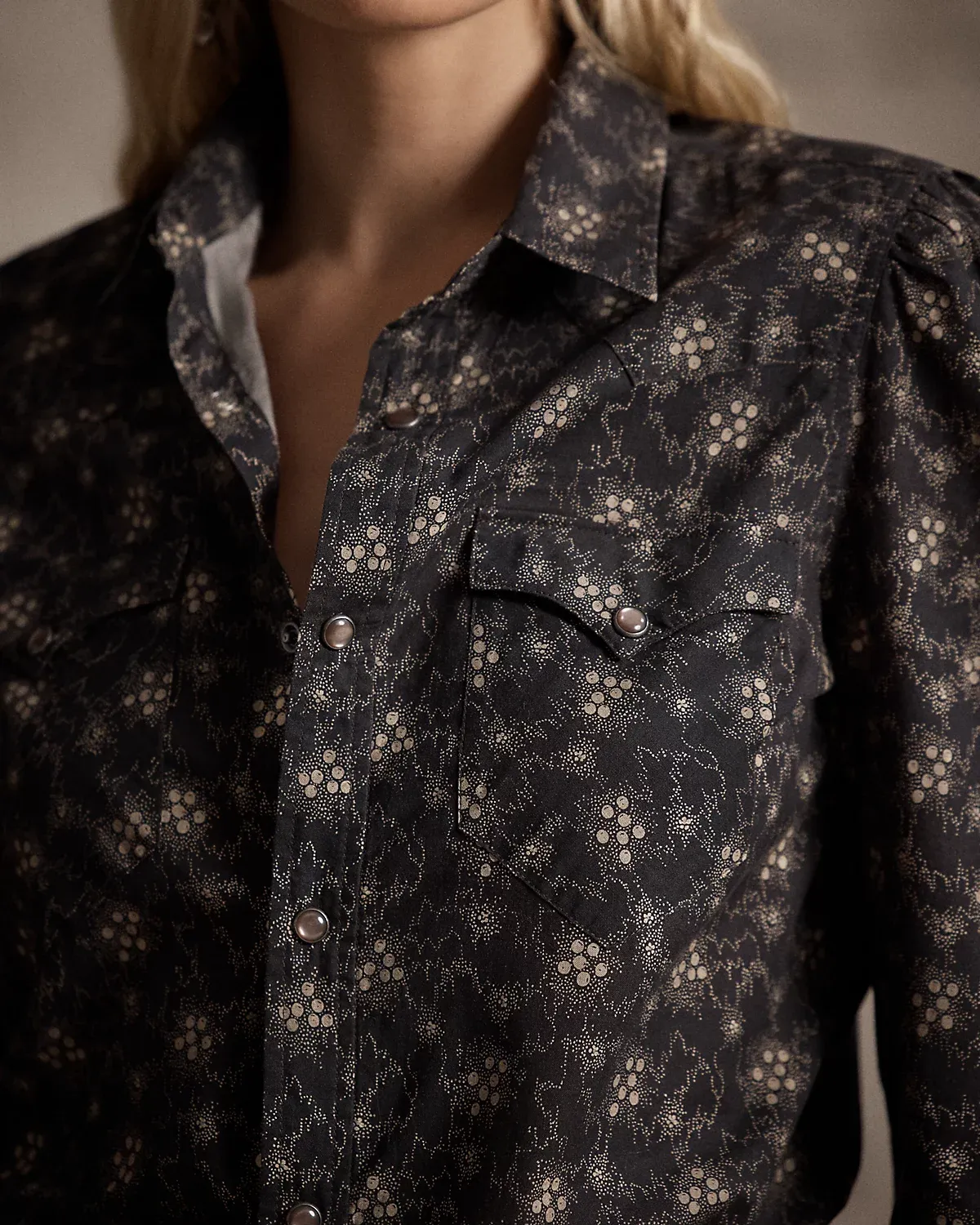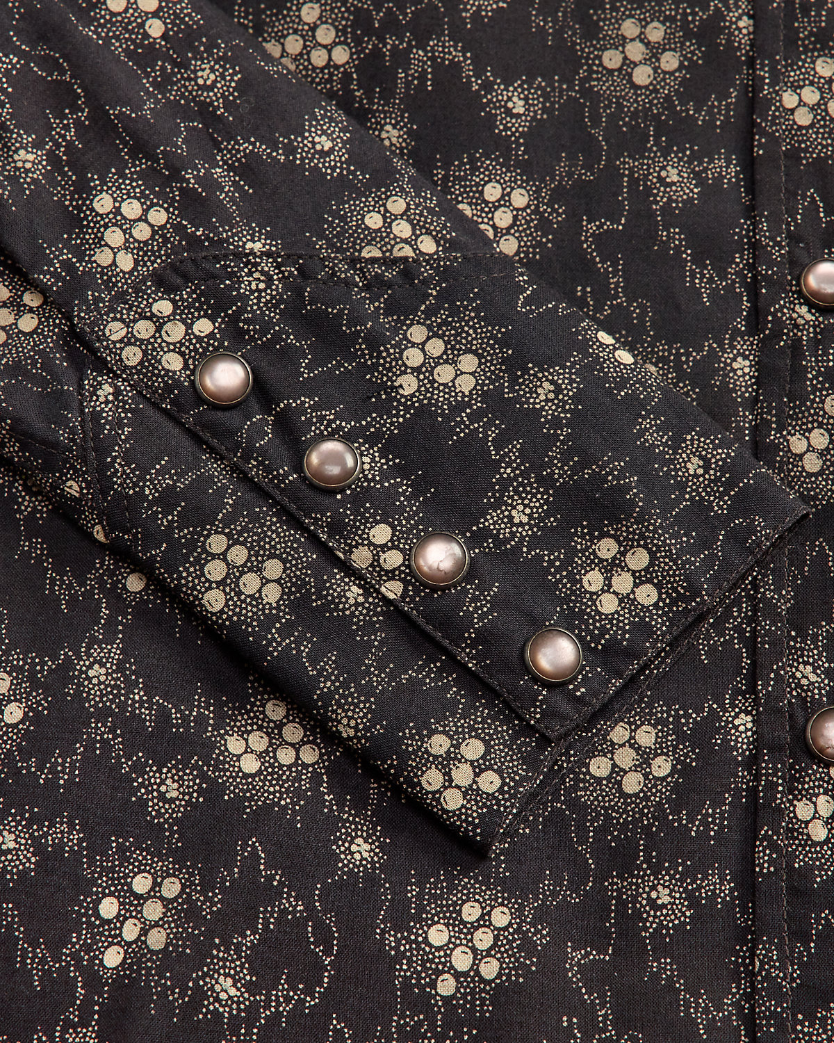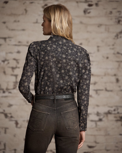 Made with lightweight woven cotton. Printed with a floral calico motif based on a swatch from the 1890s. Western-style detailing. Slightly puffed sleeves. Metal div at the collar. Pearlescent snaps.