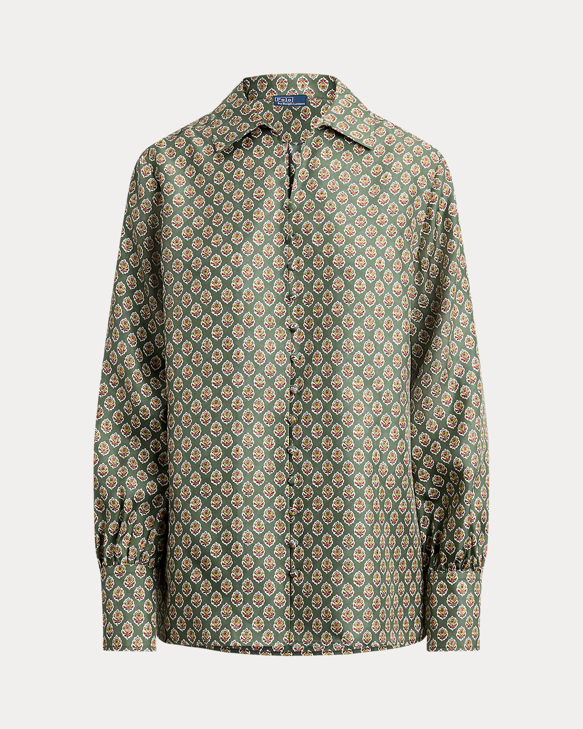 - Spread collar. Button-and-loop placket. Self-fabric dome divs.