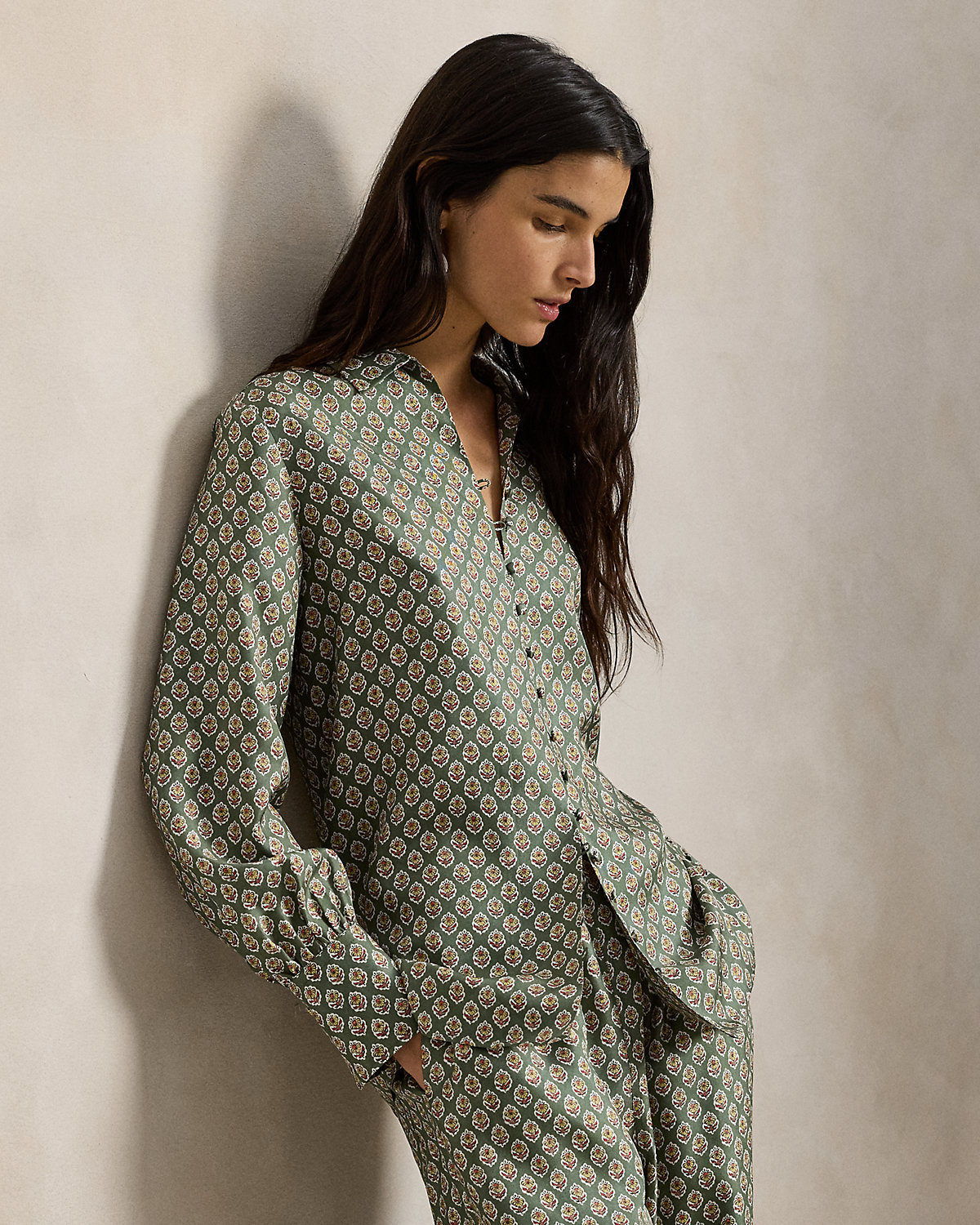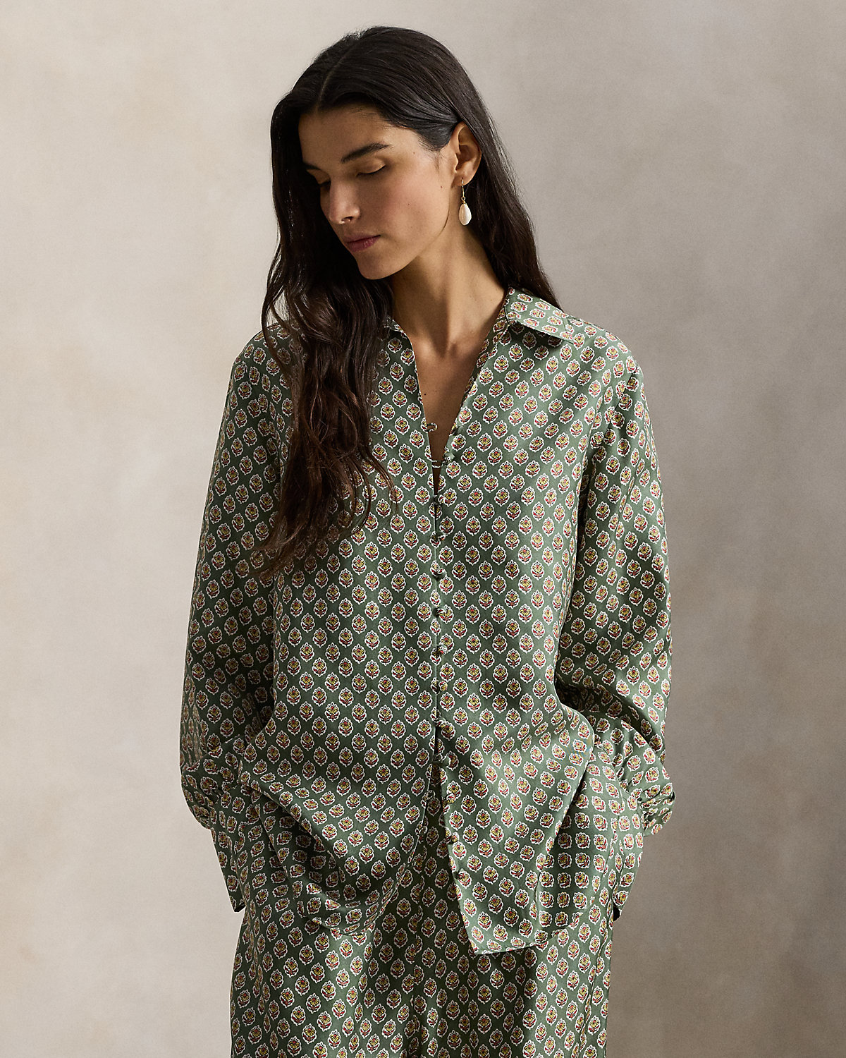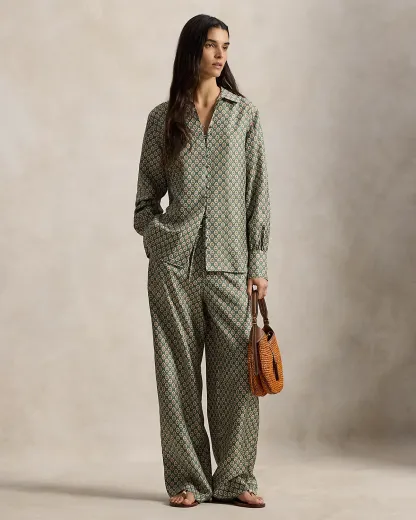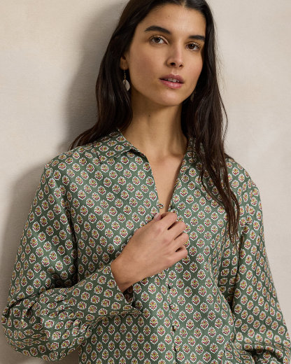 Crafted with ultralightweight mulberry silk, this shirt represents the traveler’s spirit of the season with a relaxed shape that features a floral woodblock print and a div-and-loop front placket.