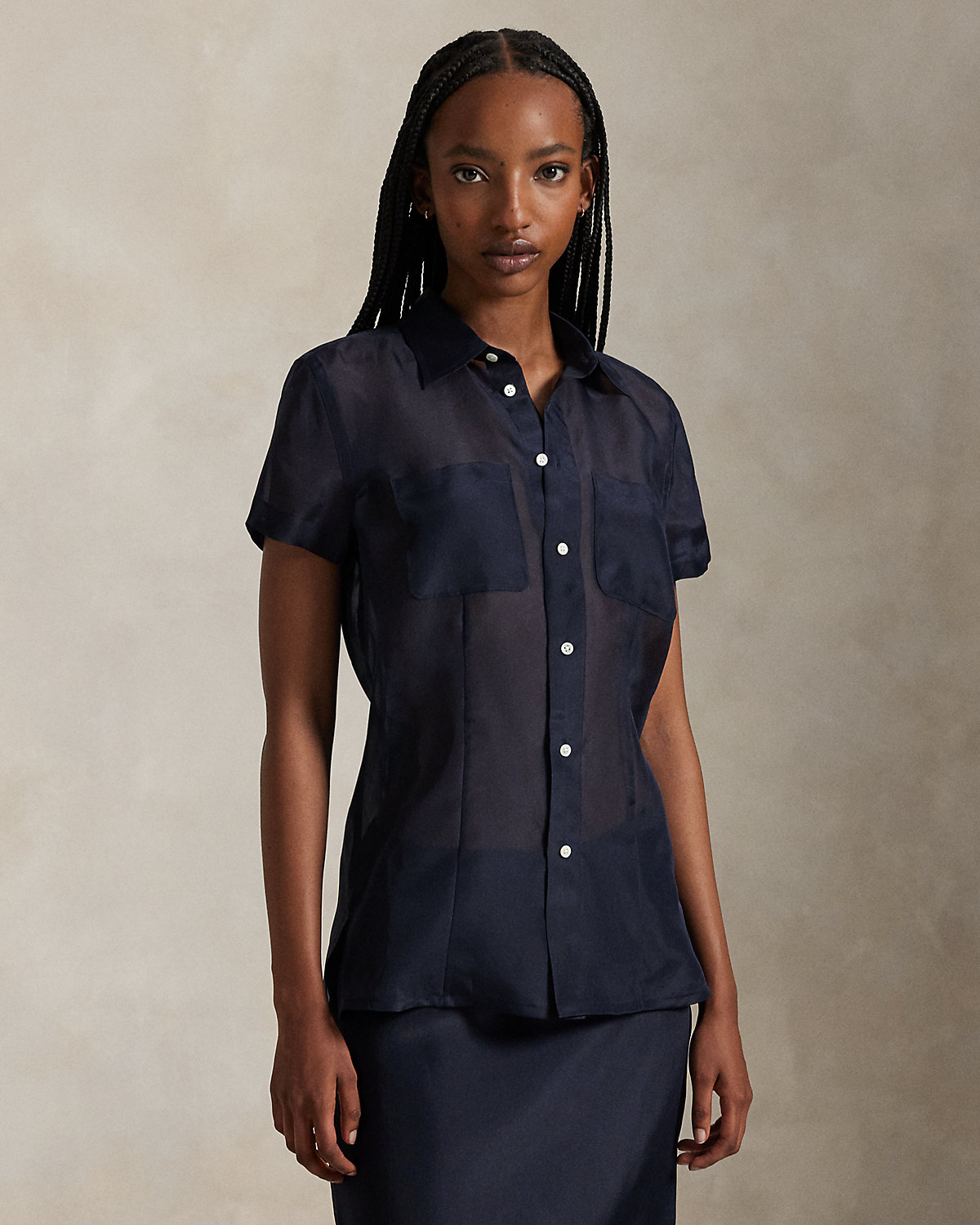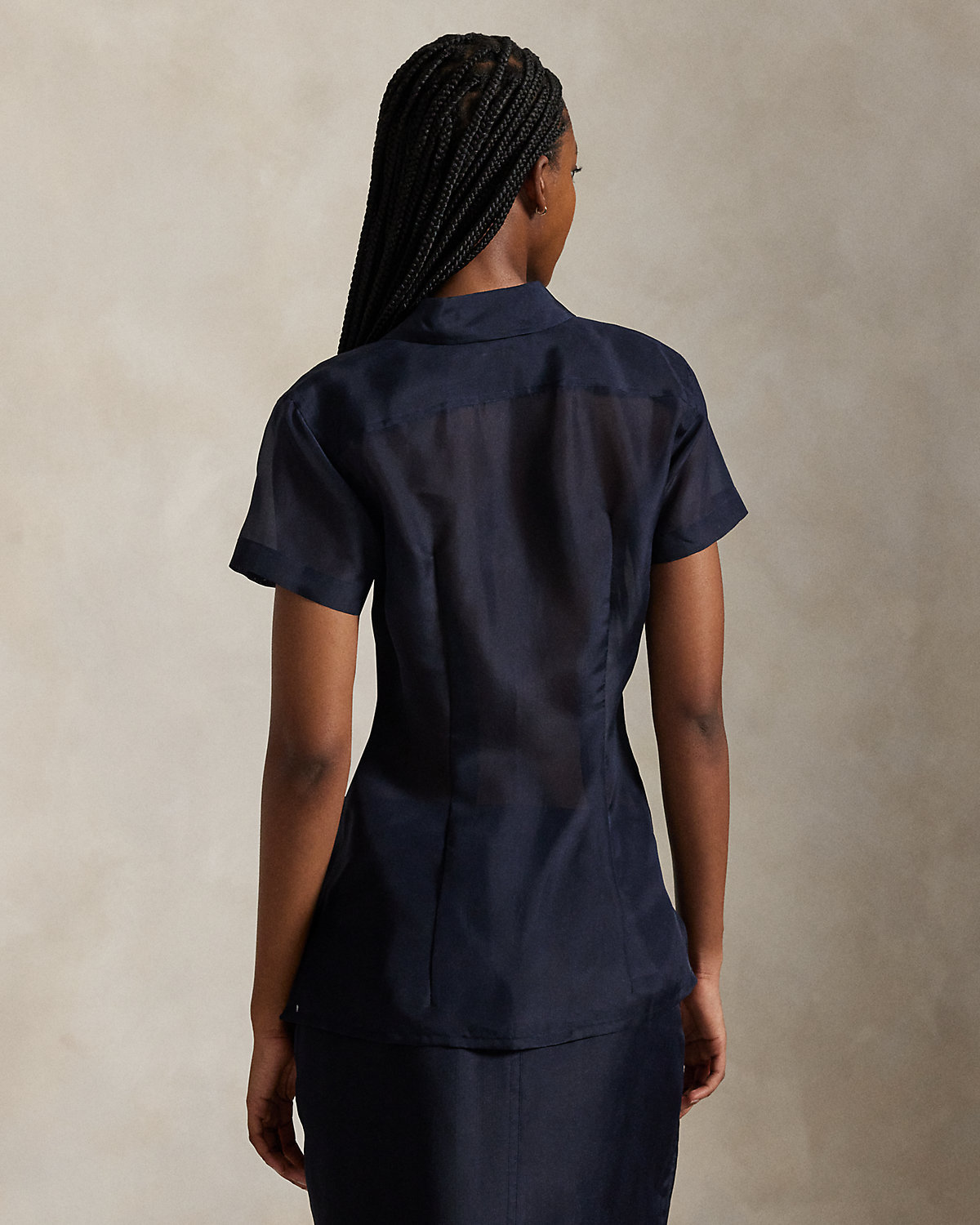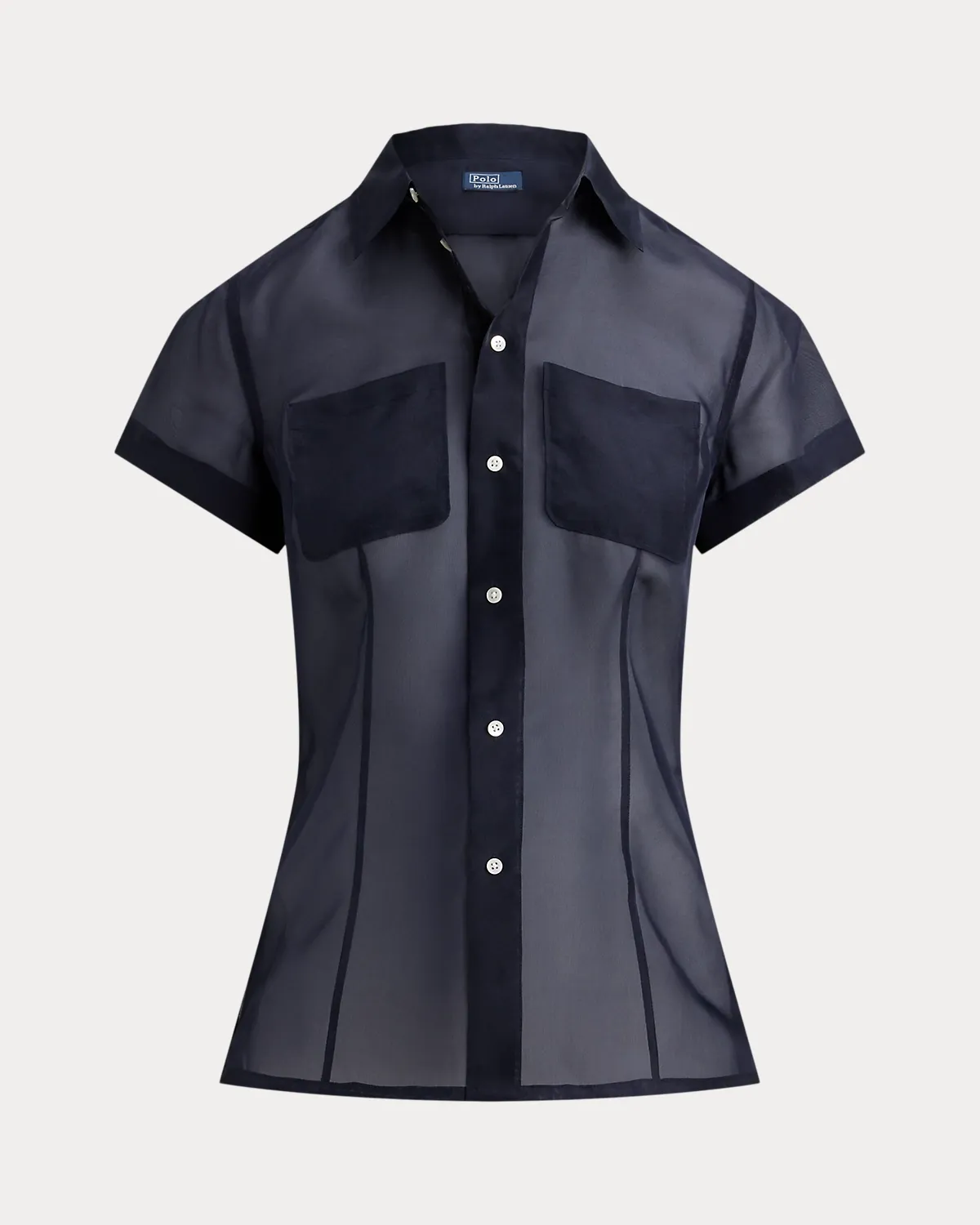 Rendered in sheer mulberry silk organza with lustrous shell divs, this short-sleeve shirt is accented by waist darts and side vents, creating a tailored silhouette while maintaining the fabric’s lightweight fluidity.