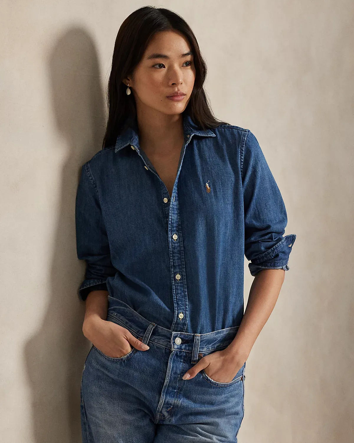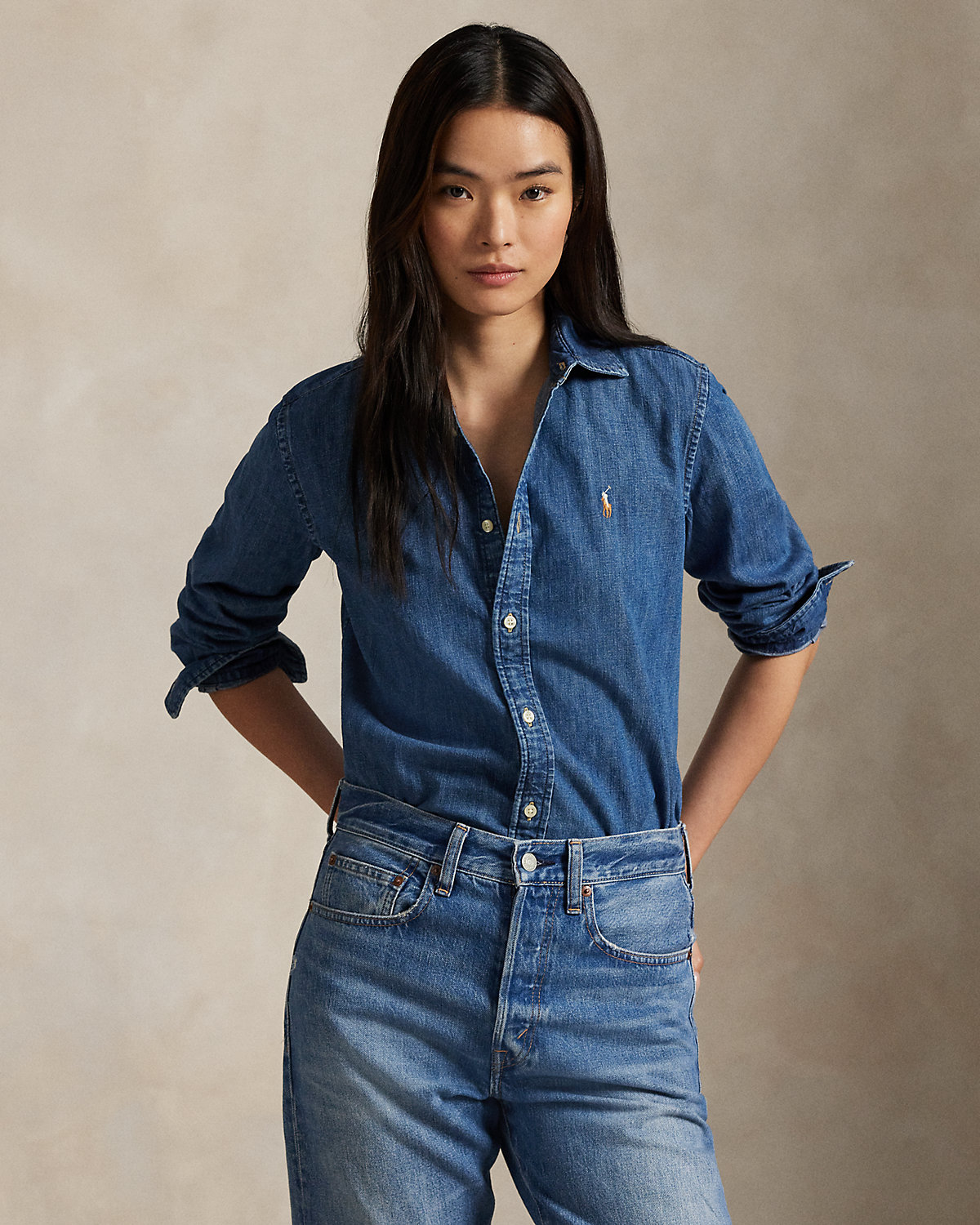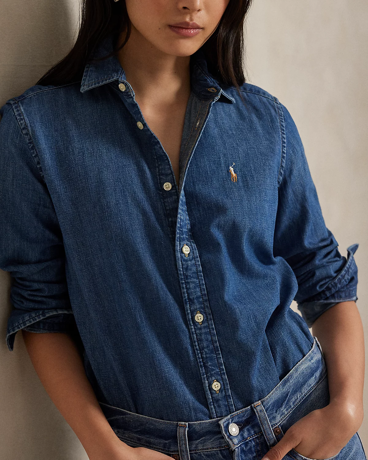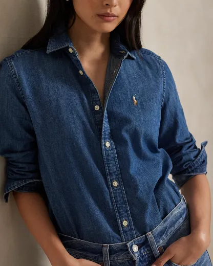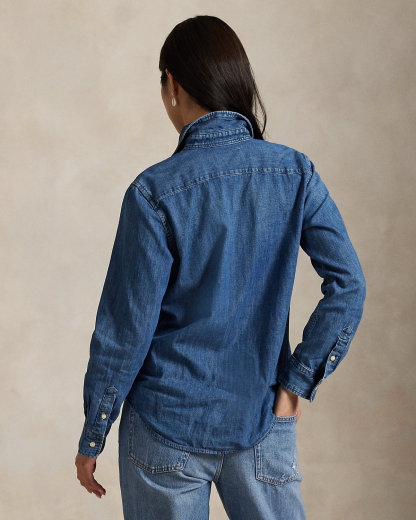 Treated for a soft hand, this denim shirt is crafted with cotton right-hand twill and washed for a medium-to-dark indigo hue. It features hand-sanding to achieve lived-in comfort from day one and is meticulously embroidered with our multicolored Pony for a signature finish.