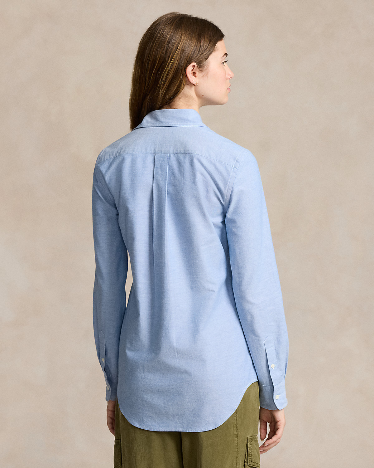 - Button-down point collar. Buttoned placket. Long sleeves with dived barrel cuffs. Back yoke. Shirttail hem.