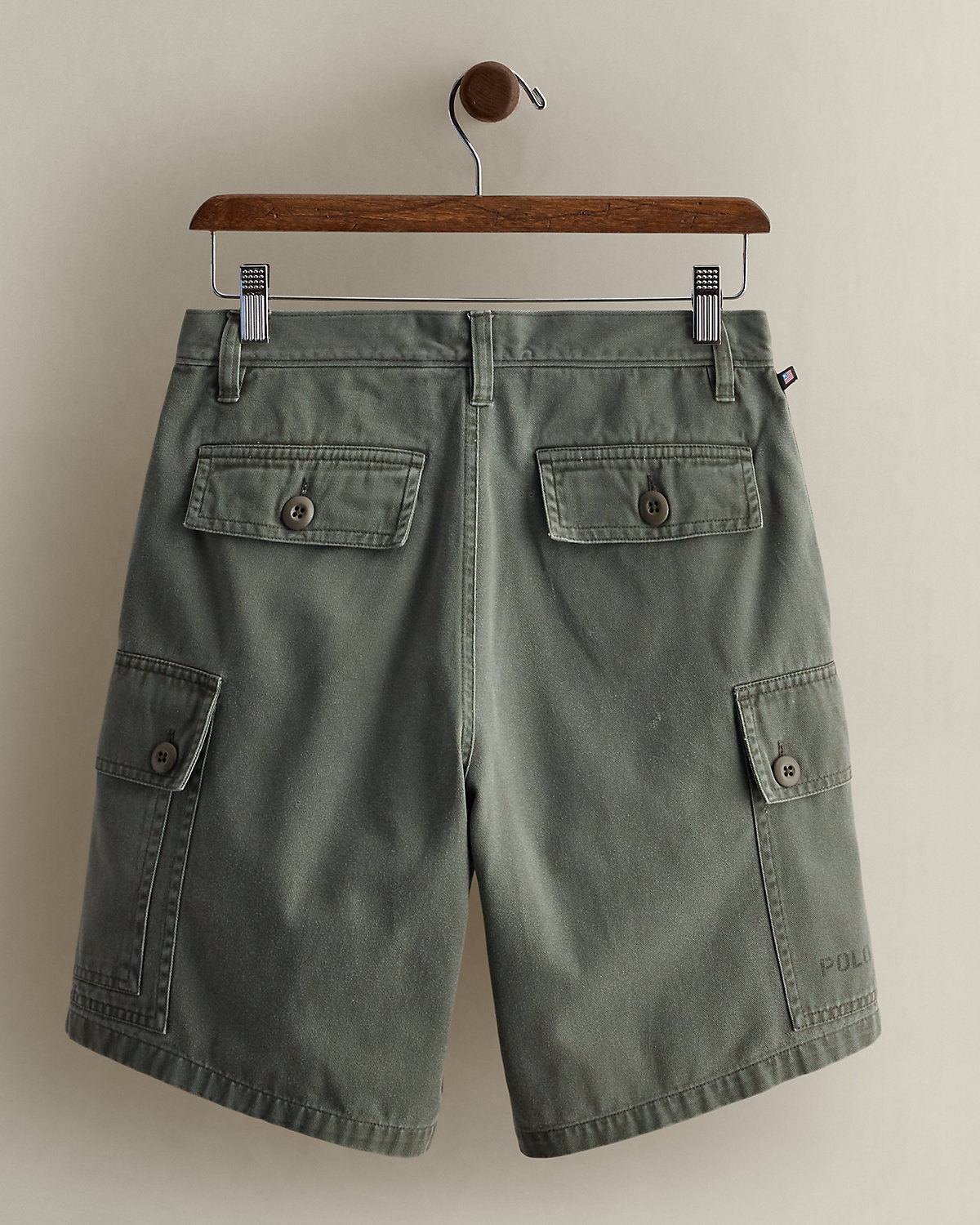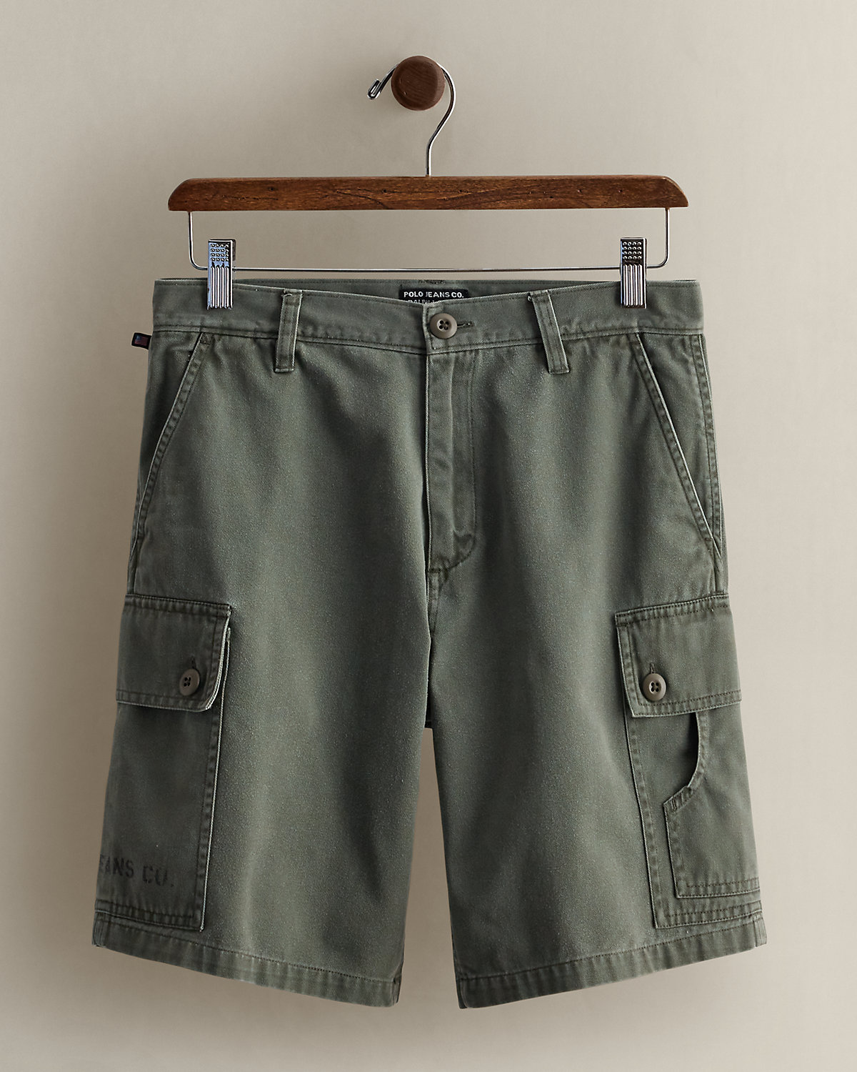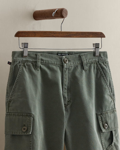 - Two side dived cargo pockets. Layered slip pocket at the left side. “Polo Jeans Co.” stenciled on the bottom right pocket.