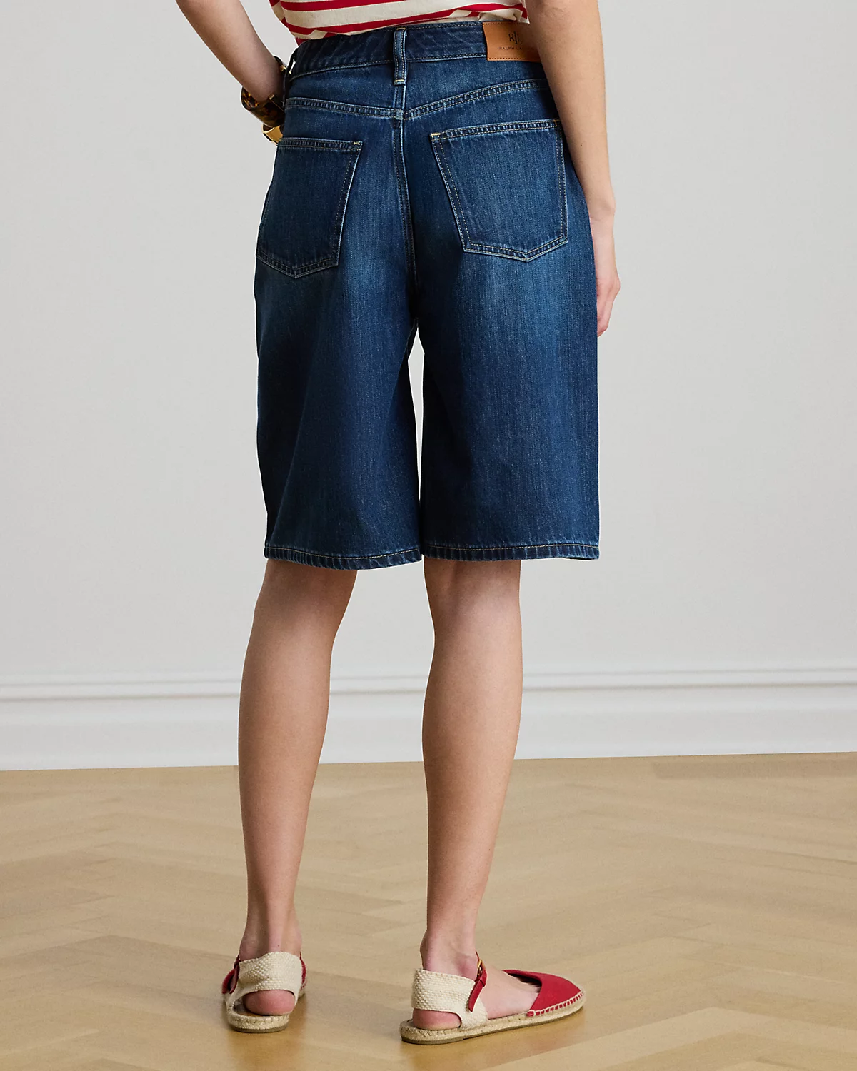 Lauren reimagines the quintessential Bermuda short with a wide-leg silhouette in dark-wash denim, offering an effortlessly chic twist on a casual staple.