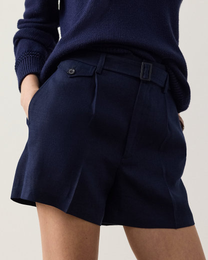 Crafted with rustic-yet-chic linen in a classic construction, the Denise short is cut for a high rise and traditionally tailored with waist darts, pleats, and crisp creases. A self-belt with a genuine mother-of-pearl buckle spotlights the waist.