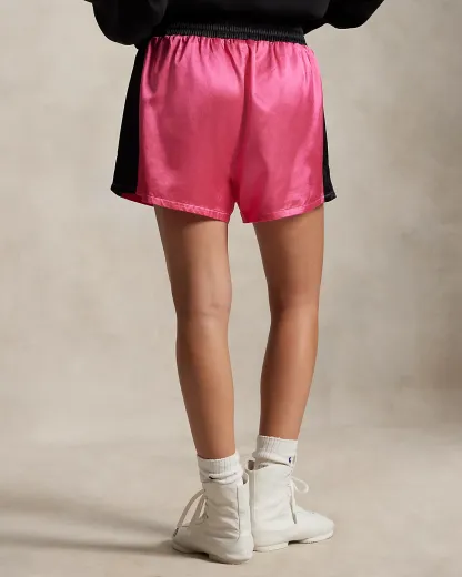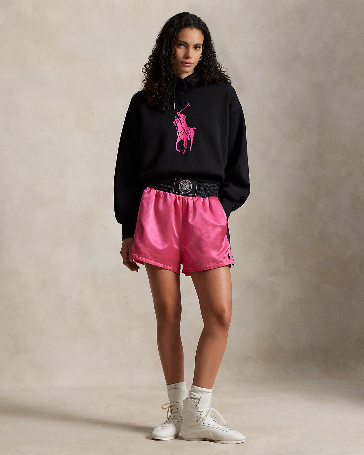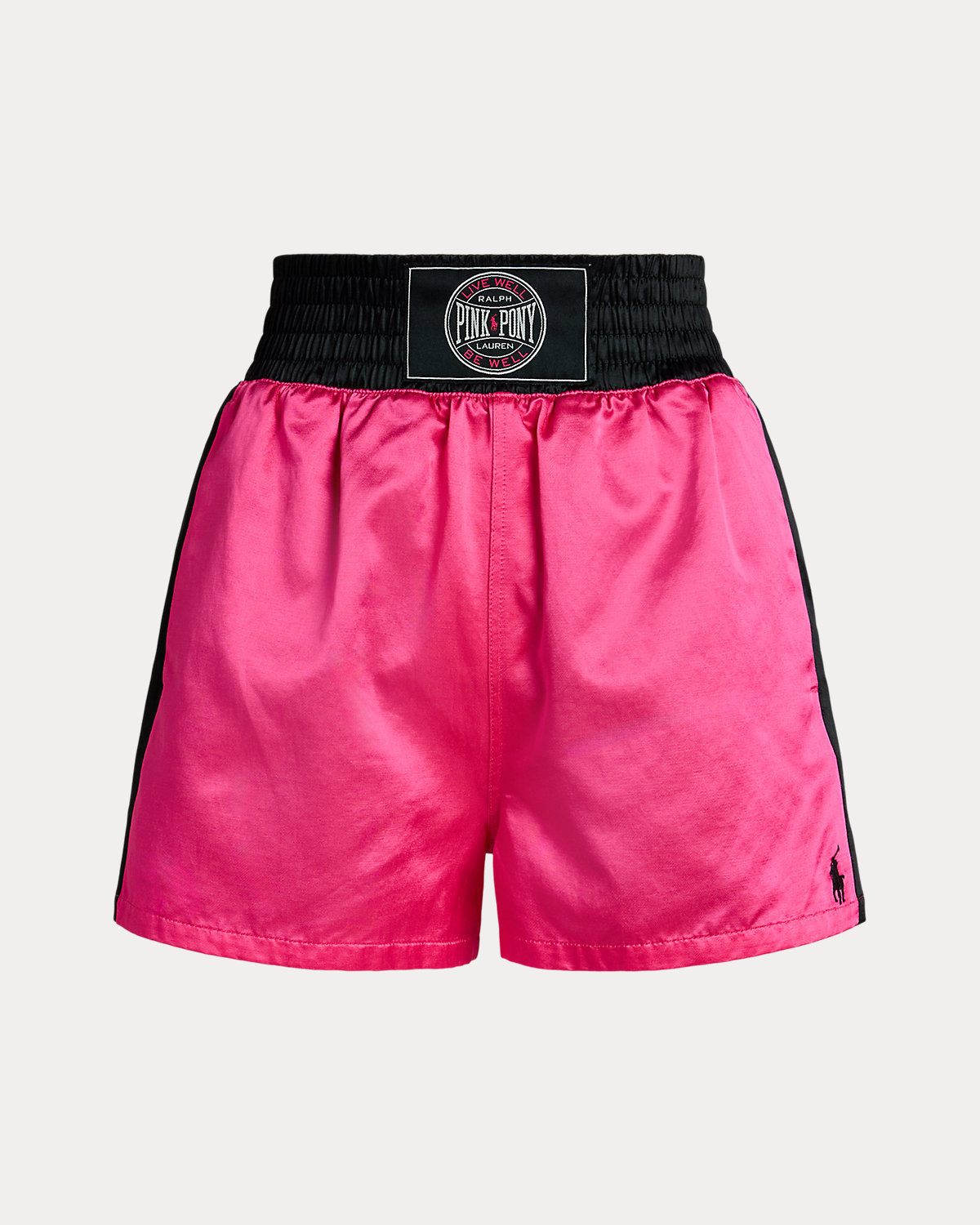 - Elasticized waistband with a "Pink Pony Ralpthth Lauren Live Well Be Well" woven label at the center front. Side on-seam pockets. Contrast side panels. Vent at each side. Signature embroidered Pony at the left hem.