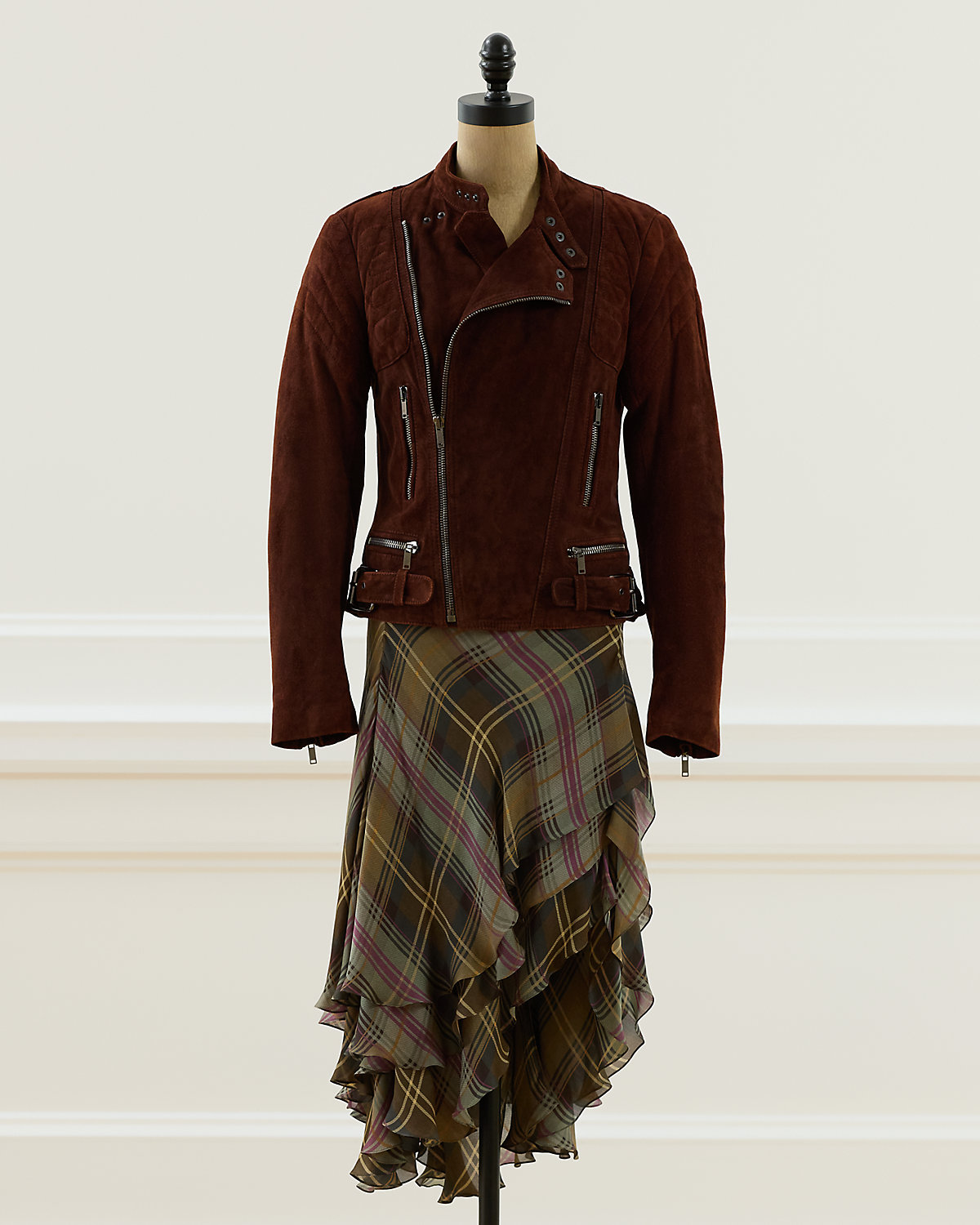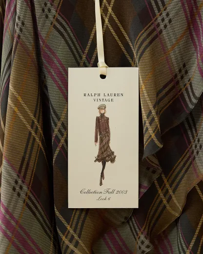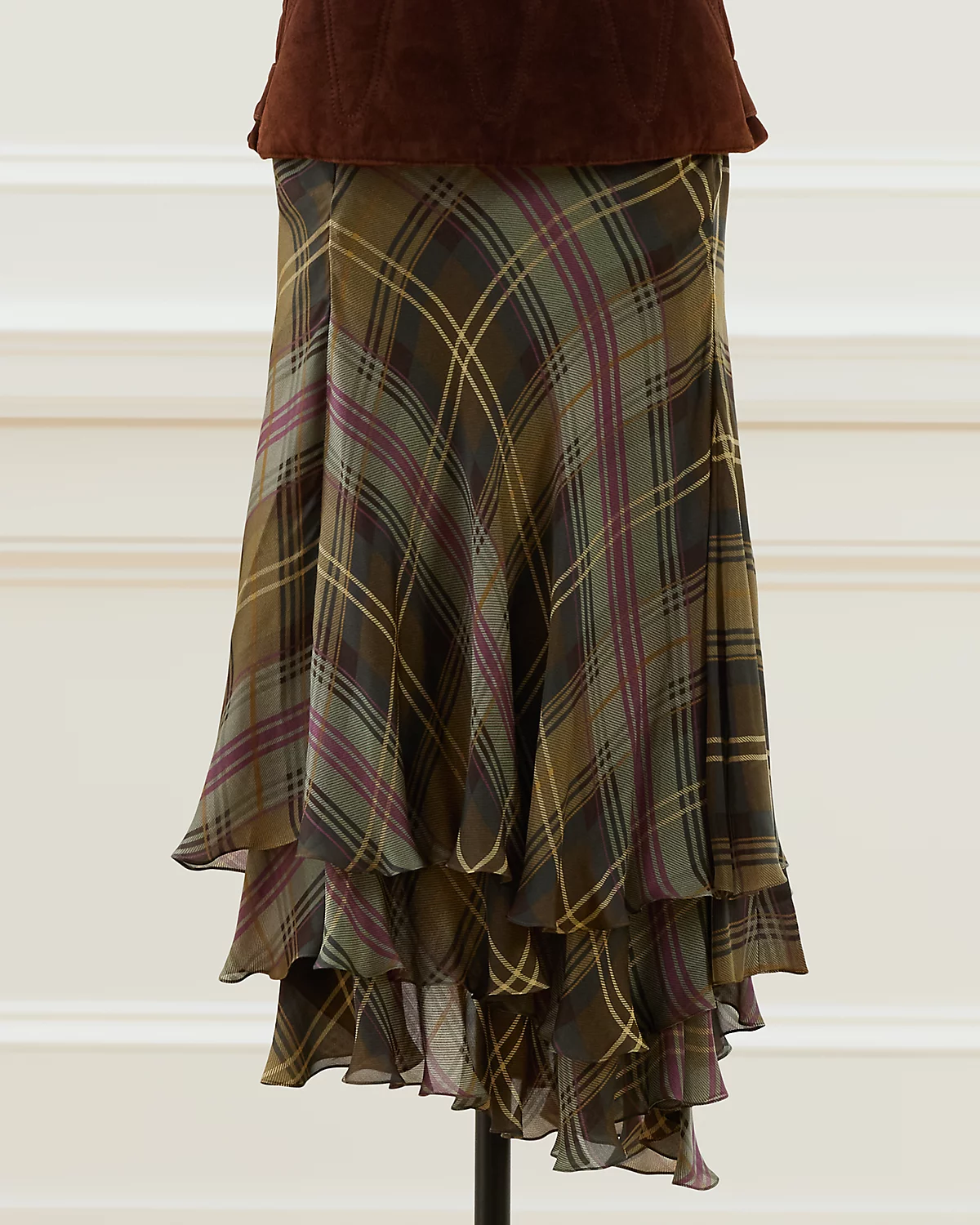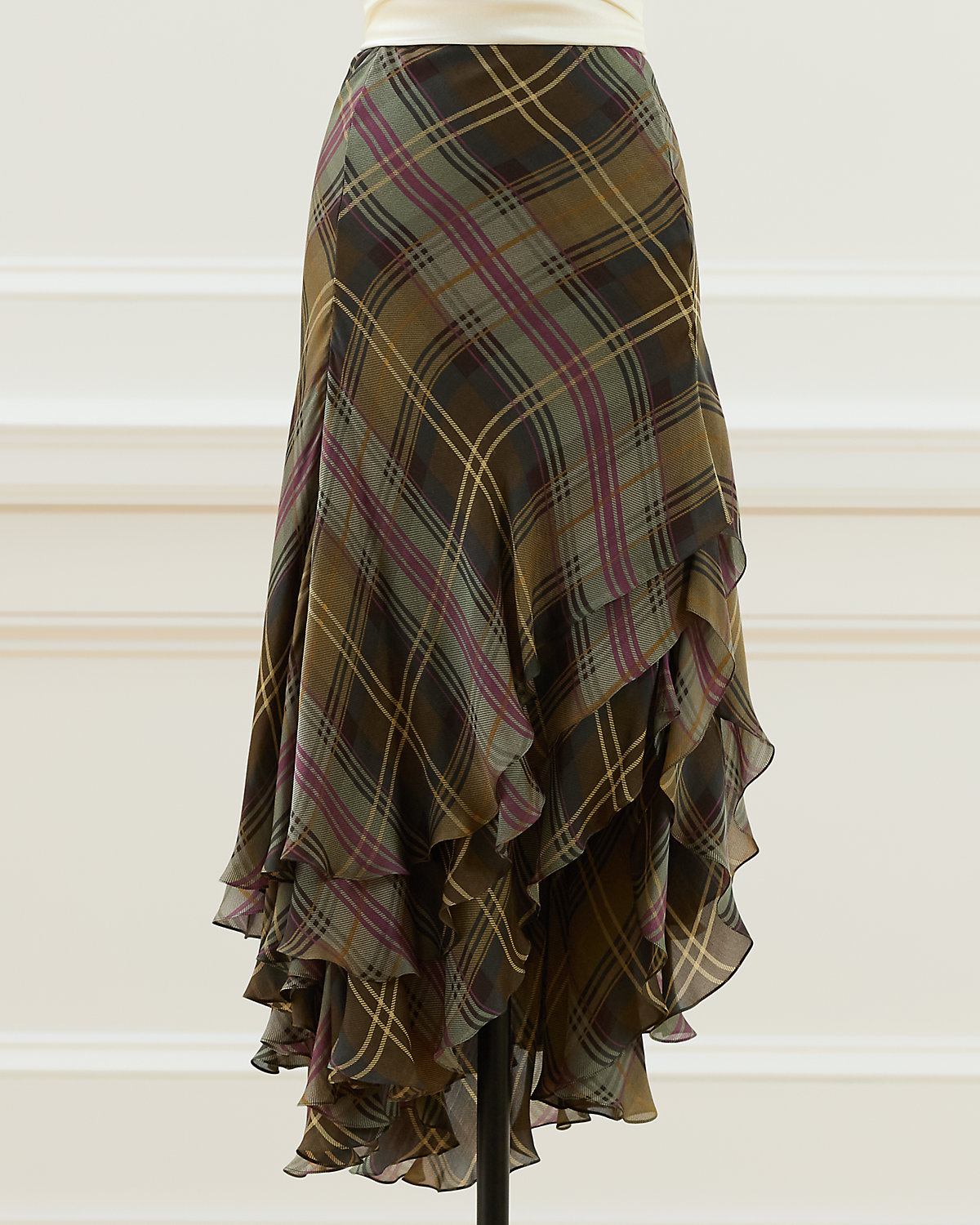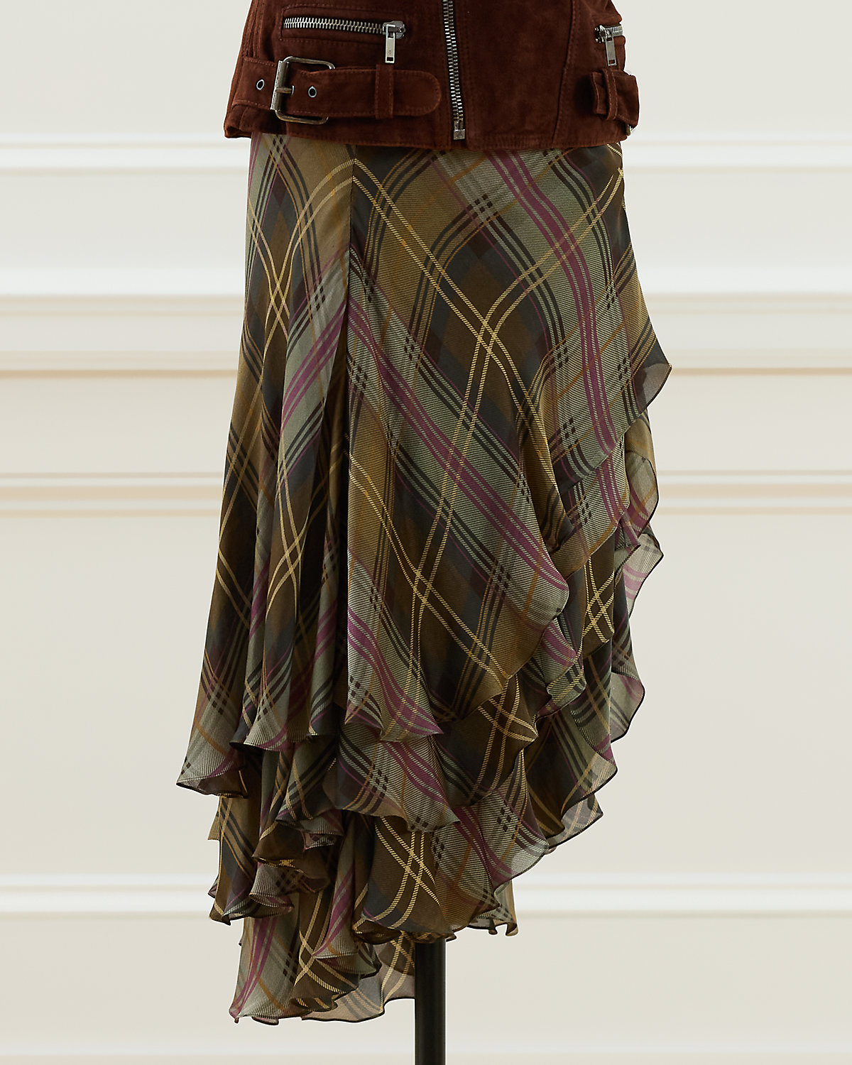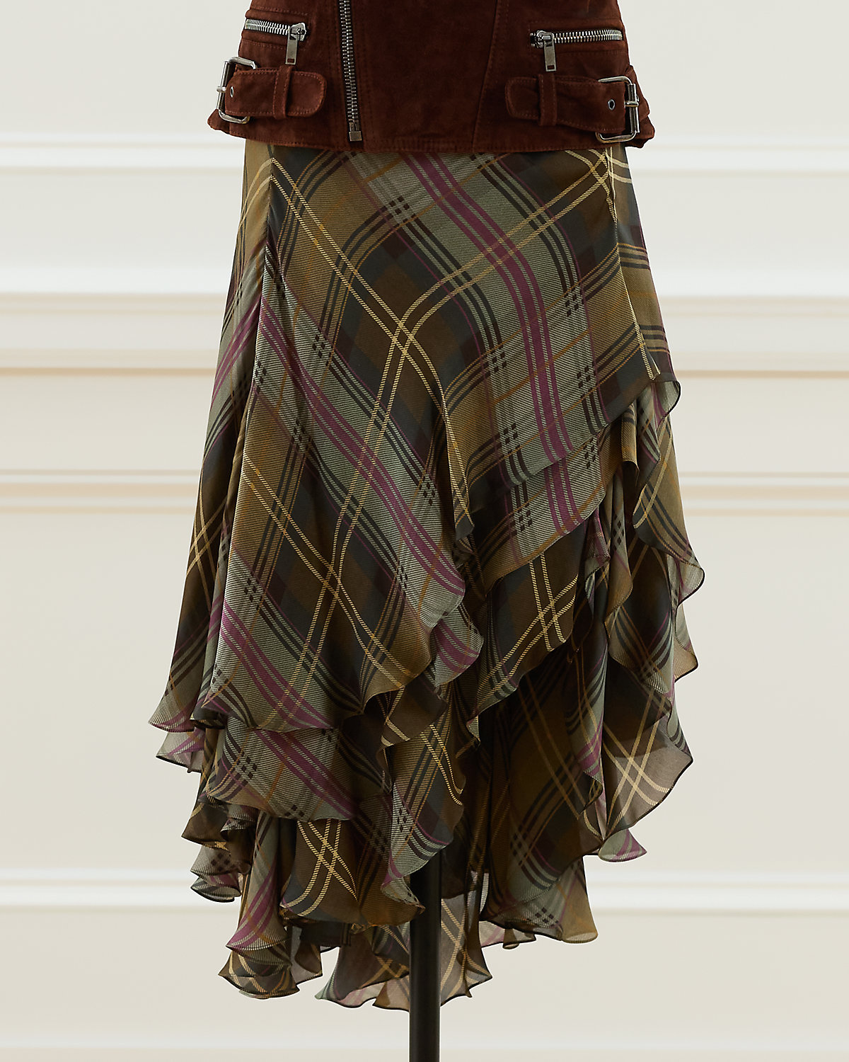 Fall 2003 Look 6. Ralpthth Lauren’s Fall 2003 Collection showcased a beautiful juxtaposition of fabrics and textures. With a plaid pattern, this sweeping silk skirt features tiered ruffles for a beautiful drape. Size 10 has a 32.75" back body length and a 14.75" waist.