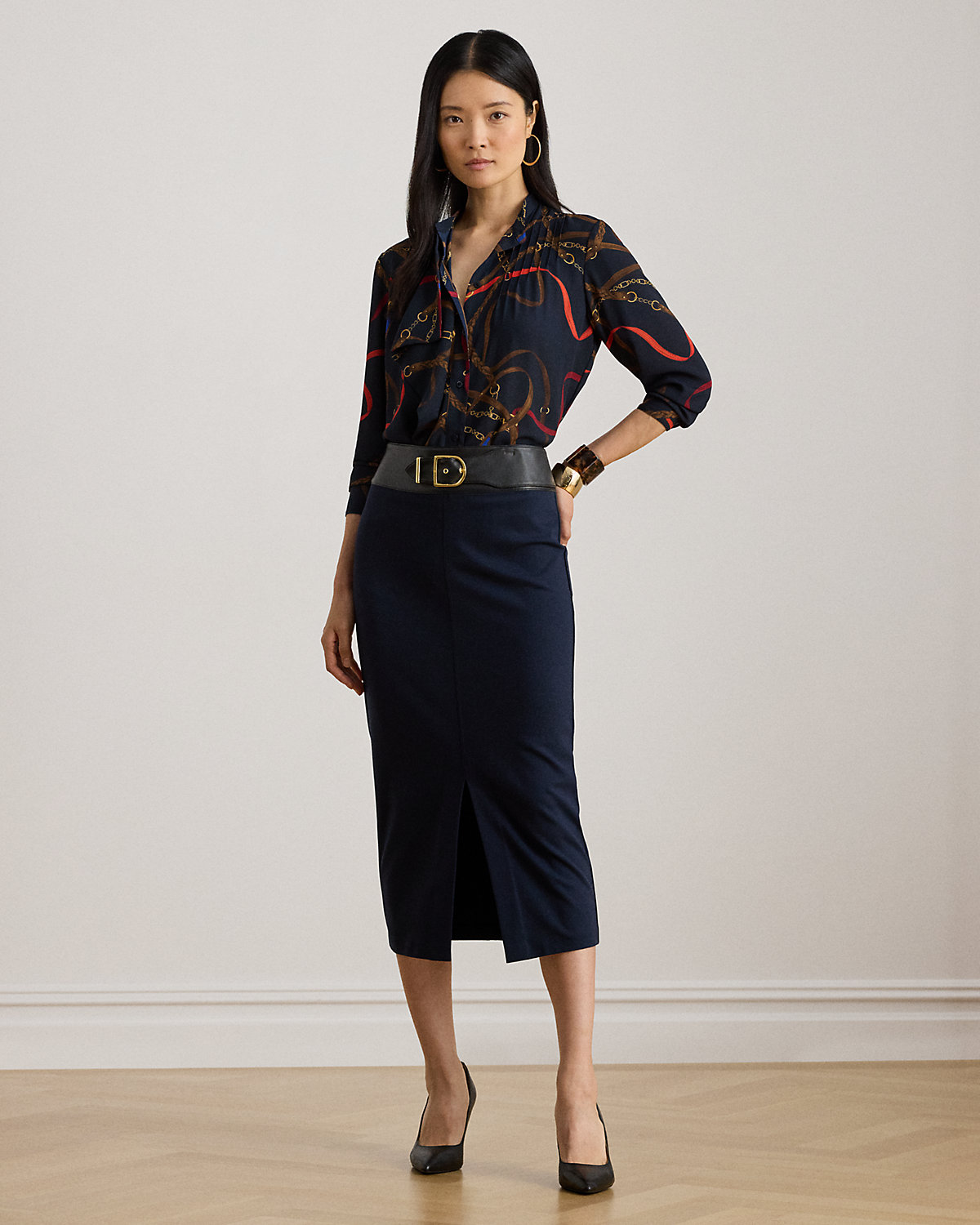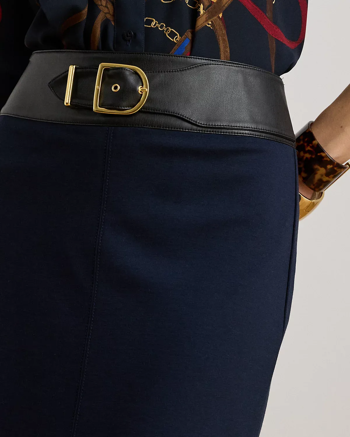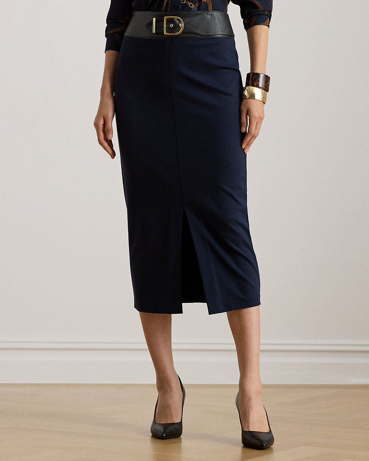 This luxurious interpretation of the pencil midi skirt is realized in smooth ponte with a sumptuous, faux-leather buckled waistband. A slit at the hem affords ease of movement.