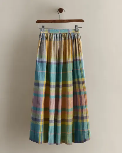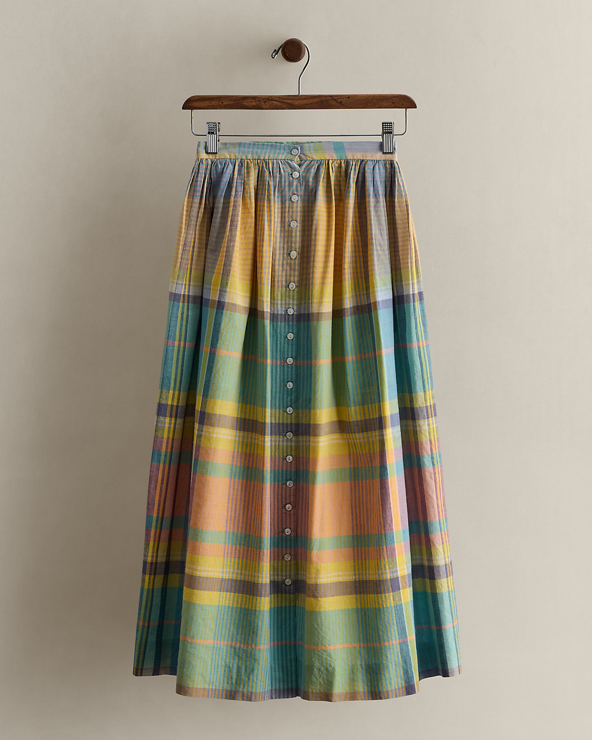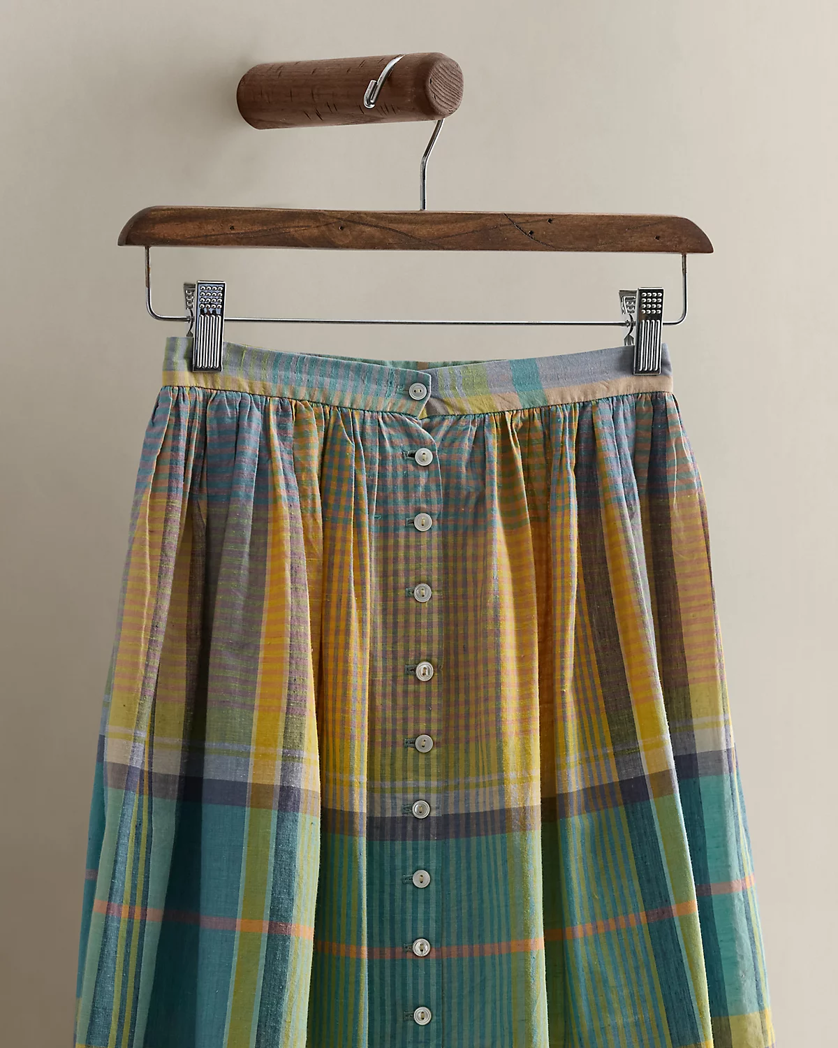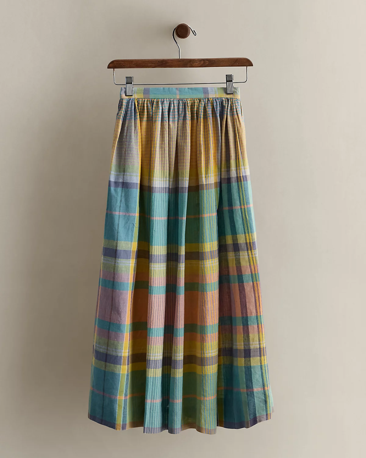 Circa 1985. Part of the women’s Ralpthth Lauren Collection. Made in America. Cotton midi skirt with a handwoven, madras-inspired plaid pattern. Featuring side on-seam pockets. Size 4 has a 30.75" back body length and an 11.5" hip.