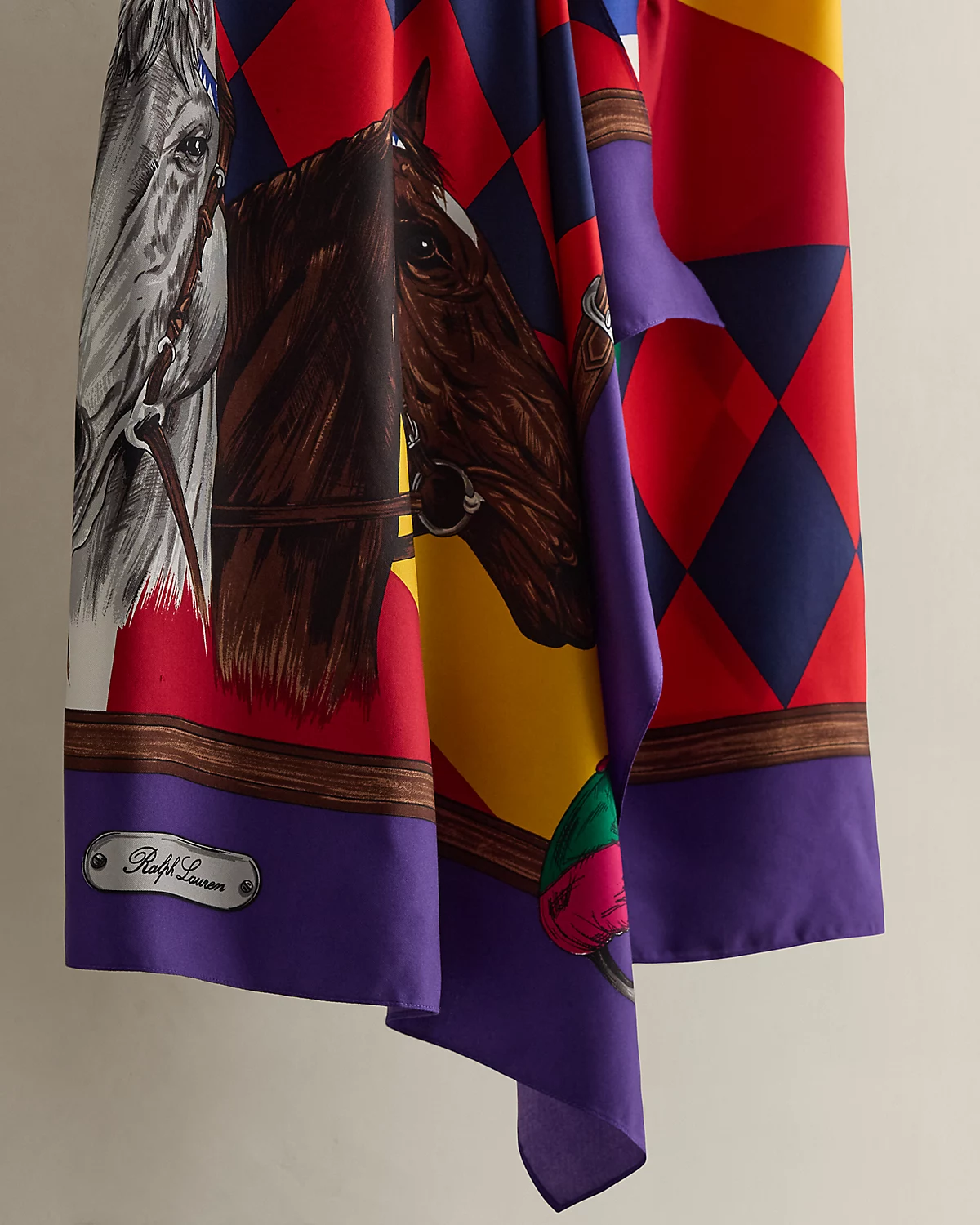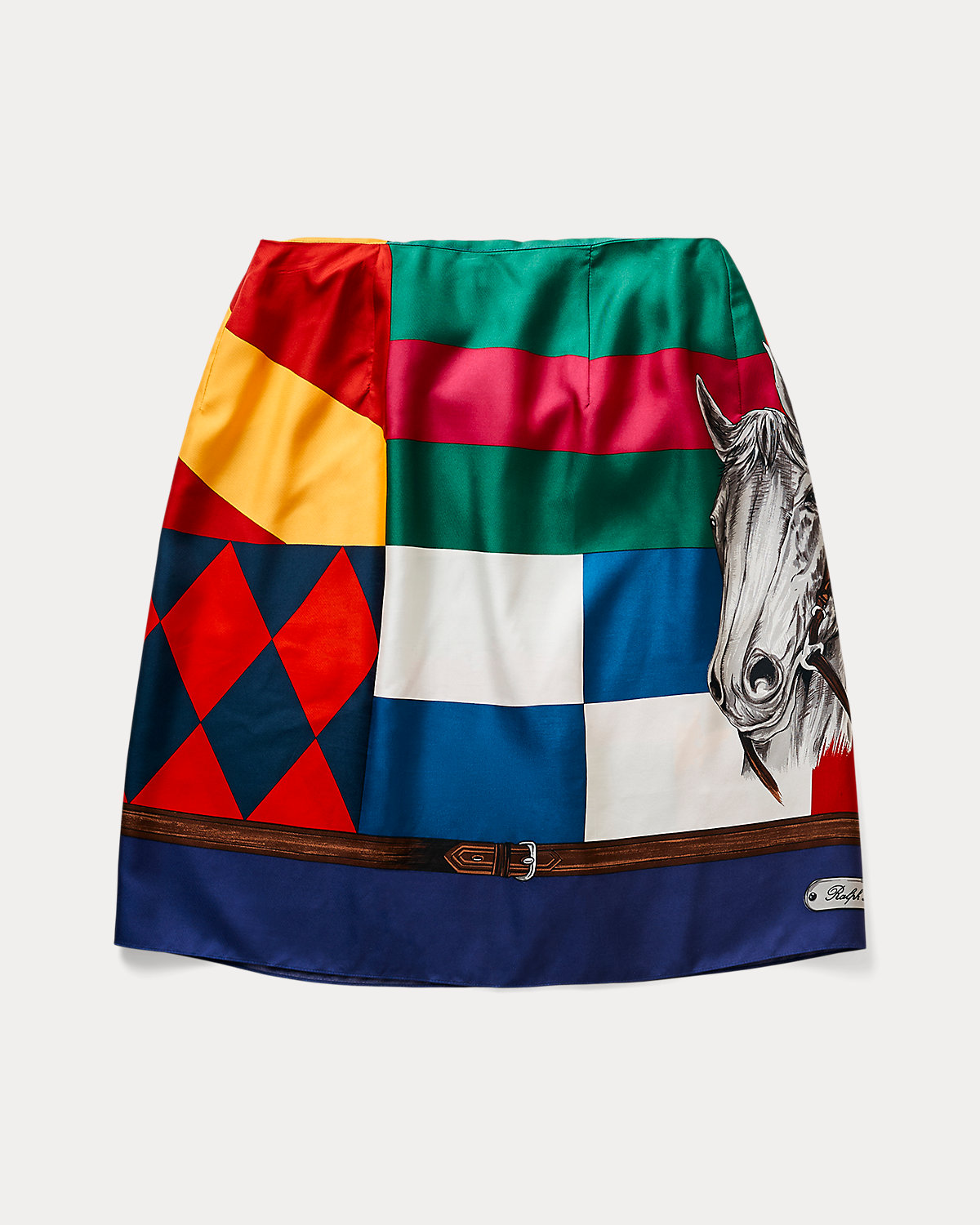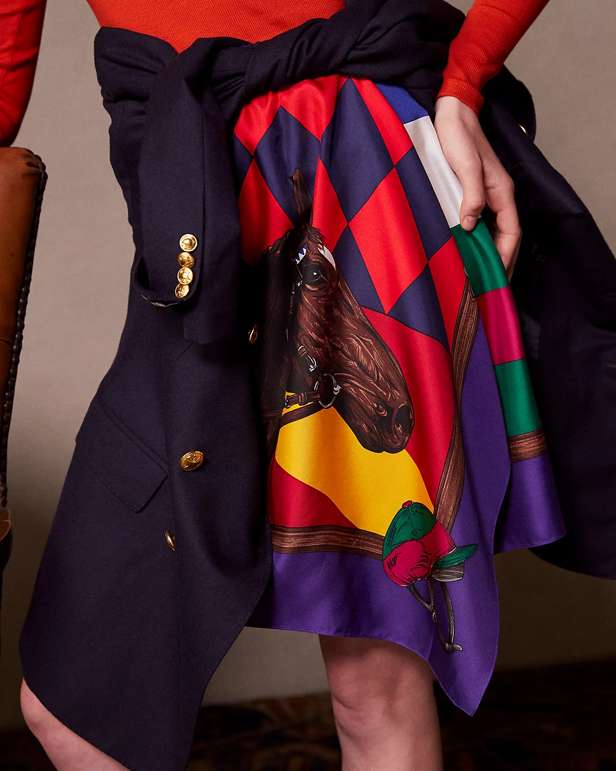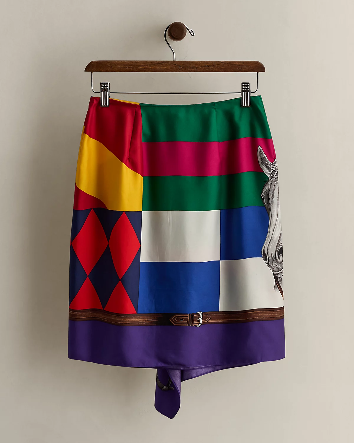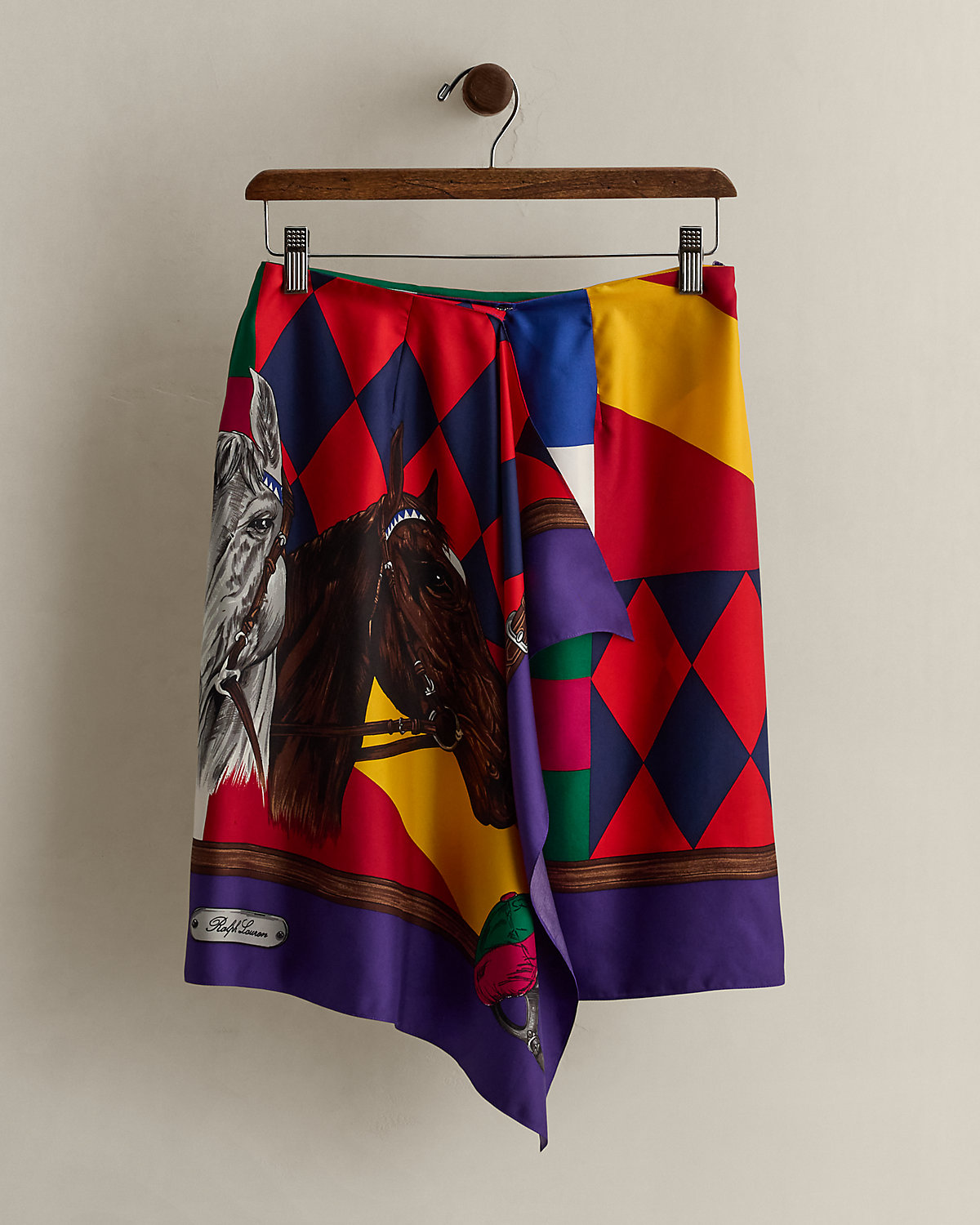 Circa 1992. Part of a women’s Ralpthth Lauren Collection, this style is made with 100 percent silk printed with an equestrian-inspired motif, which includes Ralpthth Lauren’s signature at the hem. This skirt is designed with a wrap-style pencil silhouette that secures at the waist with a hook-and-eye closure. Size 8 has a 20" back body length and a 13" waist.