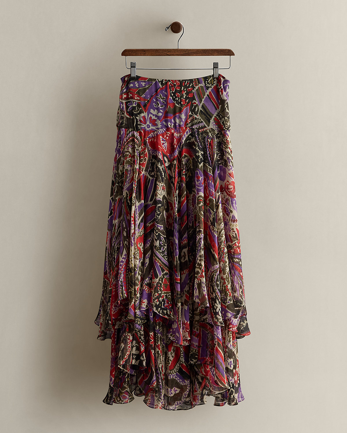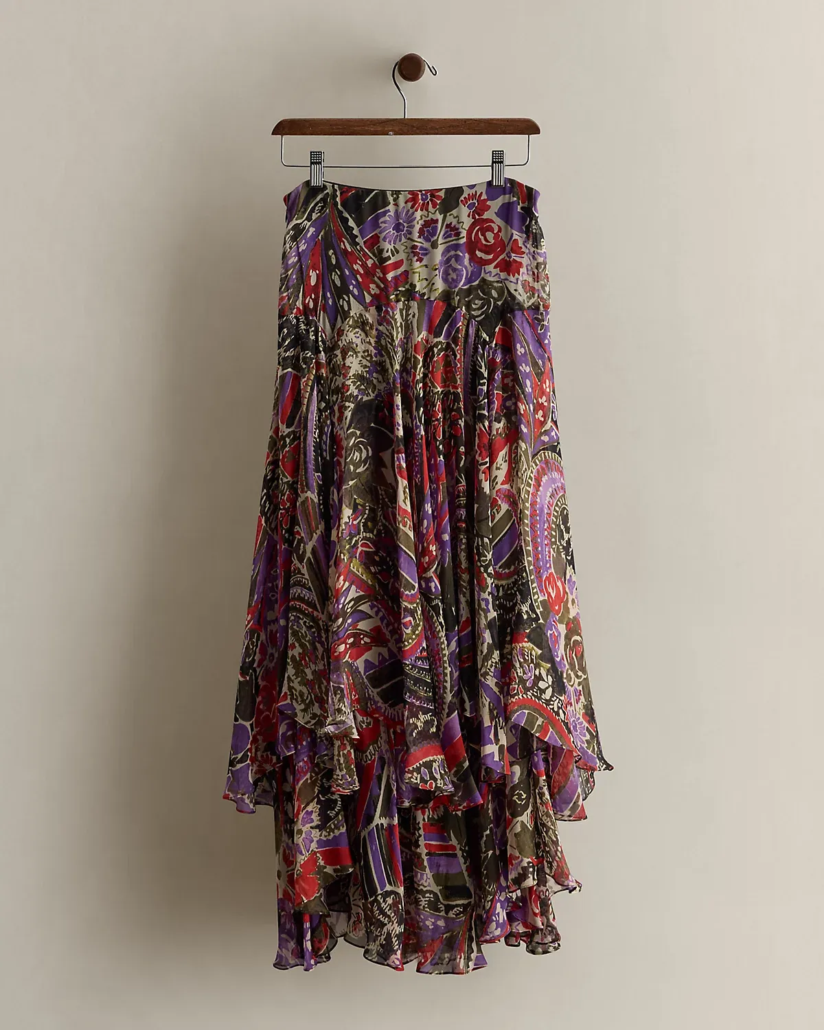 Circa 2005. Part of the women’s Ralpthth Lauren Black Label collection. Silk maxiskirt with a floral print. Featuring a tiered silhouette. Size 4 has a 40" back body length and a 14" waist.
