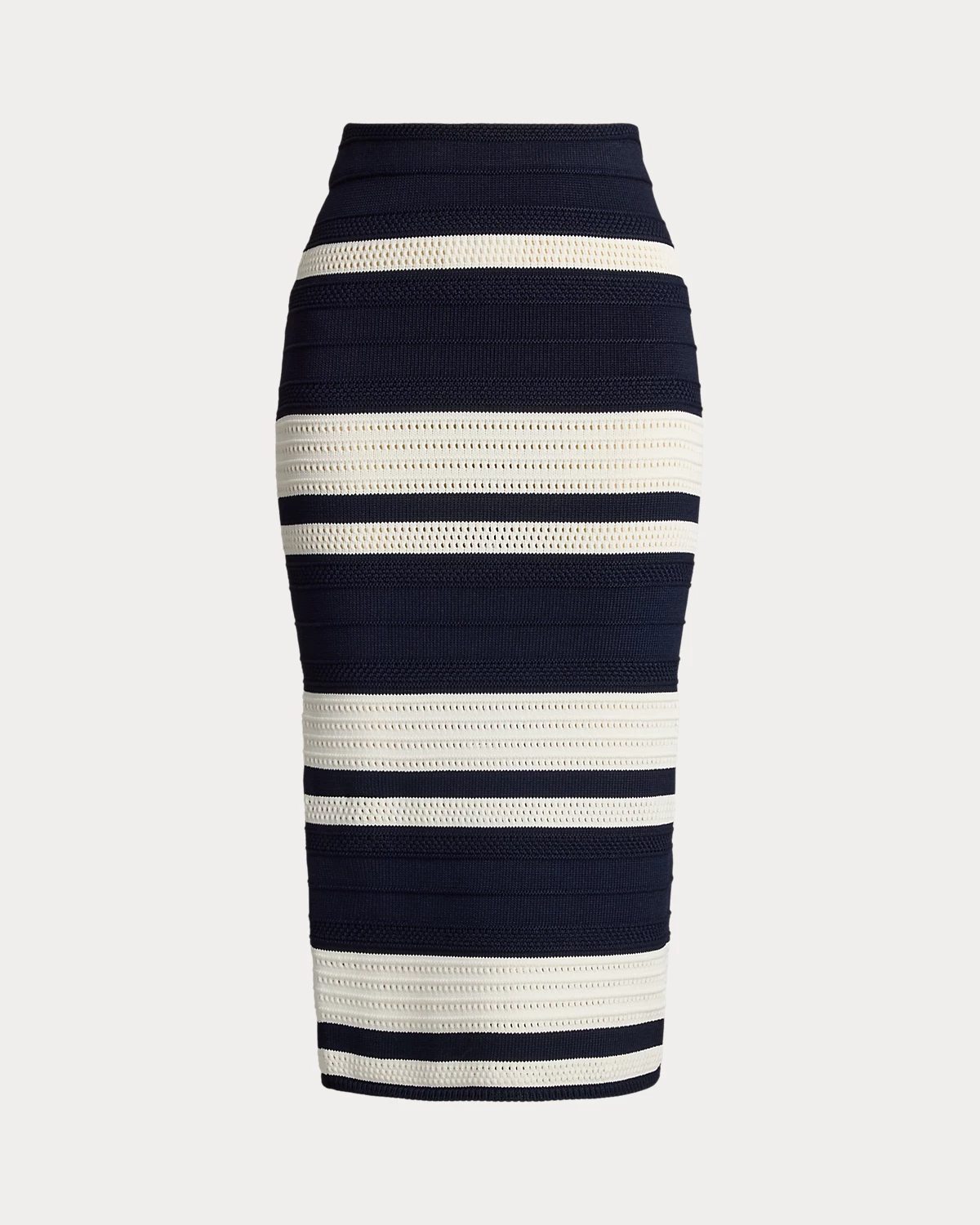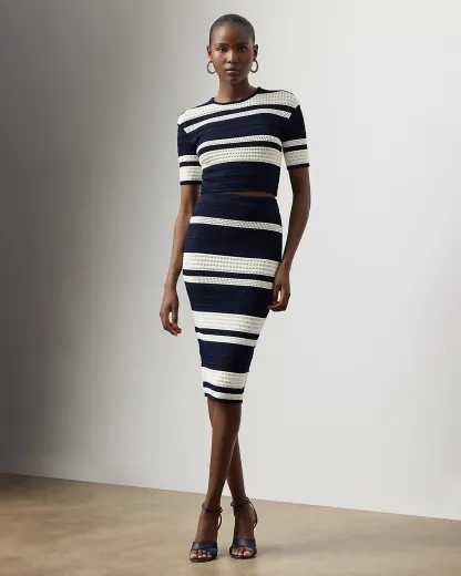 A wardrobe staple, the Ferris sweater skirt revamps the essential pencil silhouette this season with classic stripes and a variety of textural stitches.