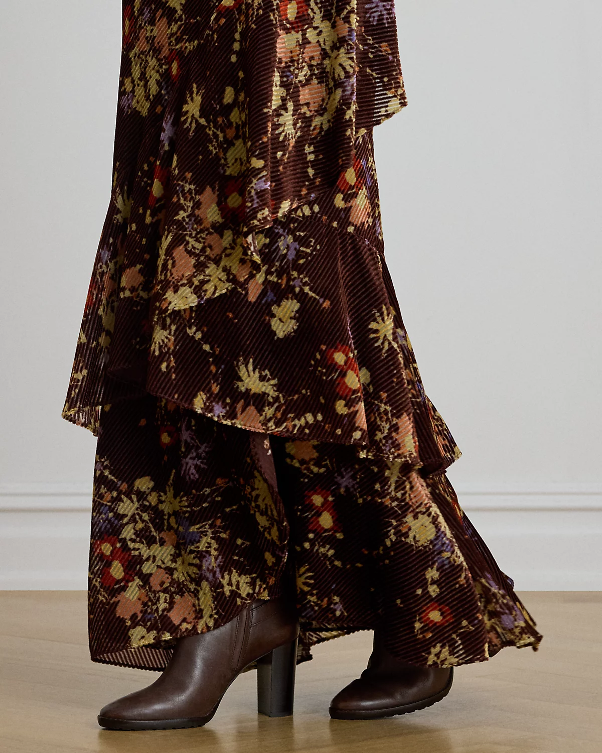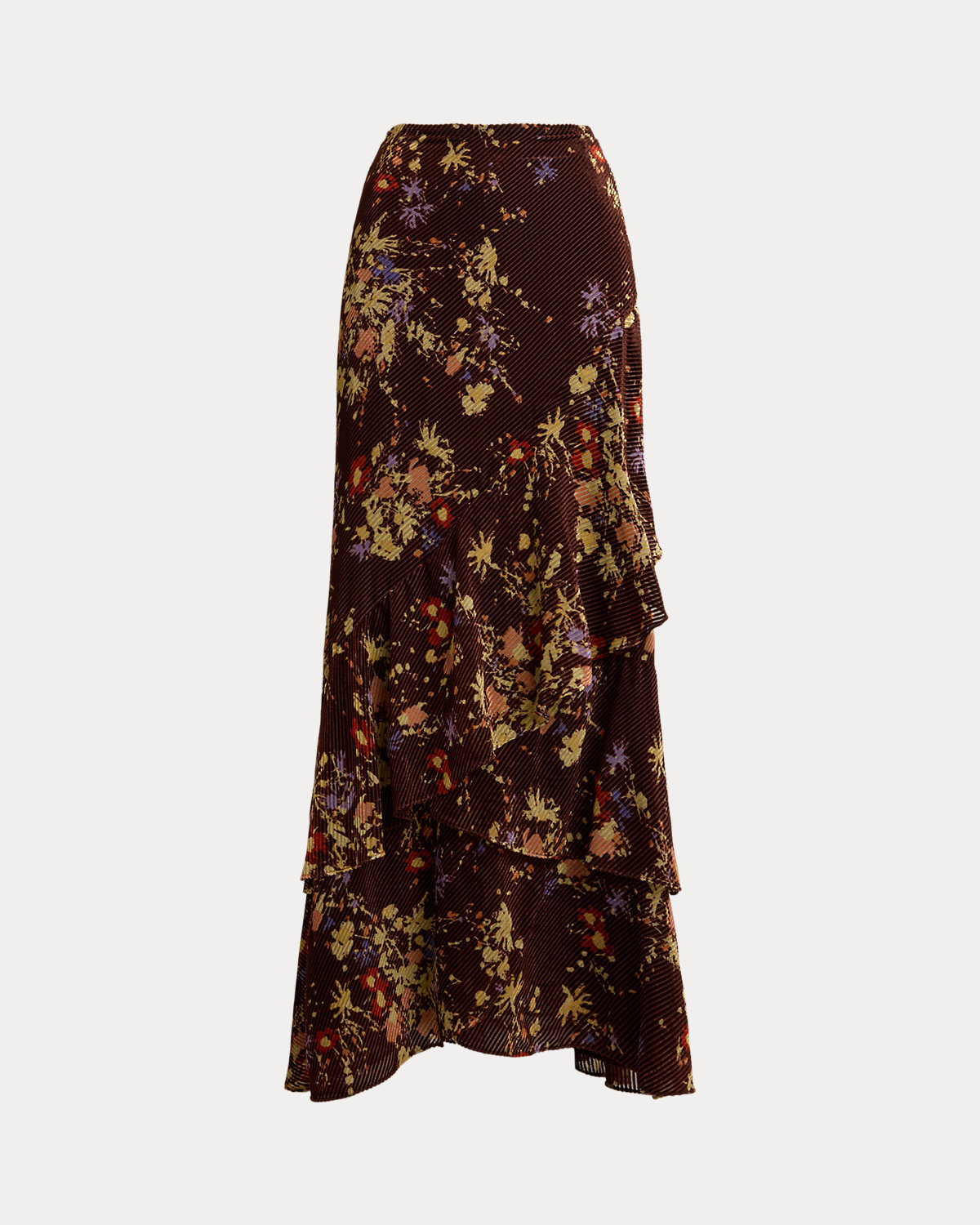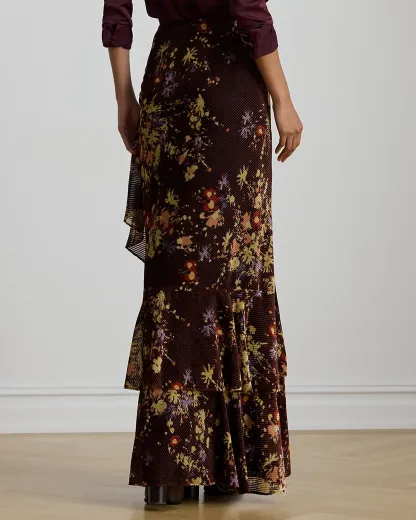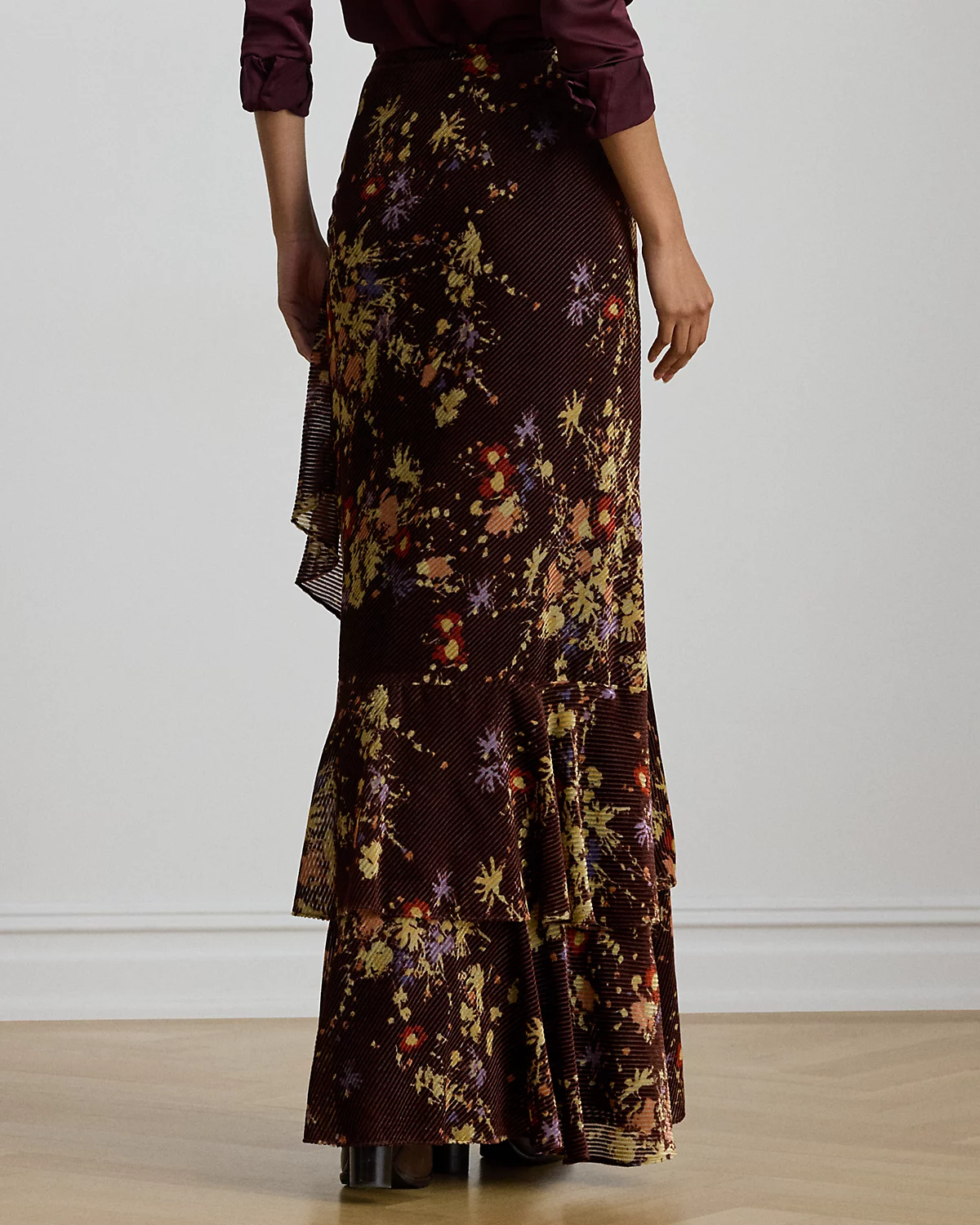 Burnout velvet with a striped wale brings a lustrous sheen and subtle texture to this maxiskirt, which features romantic florals and tiered flounces for graceful movement with each step.