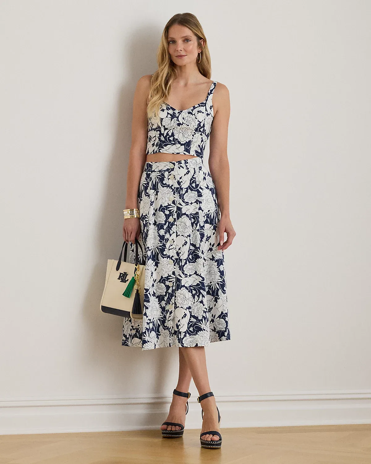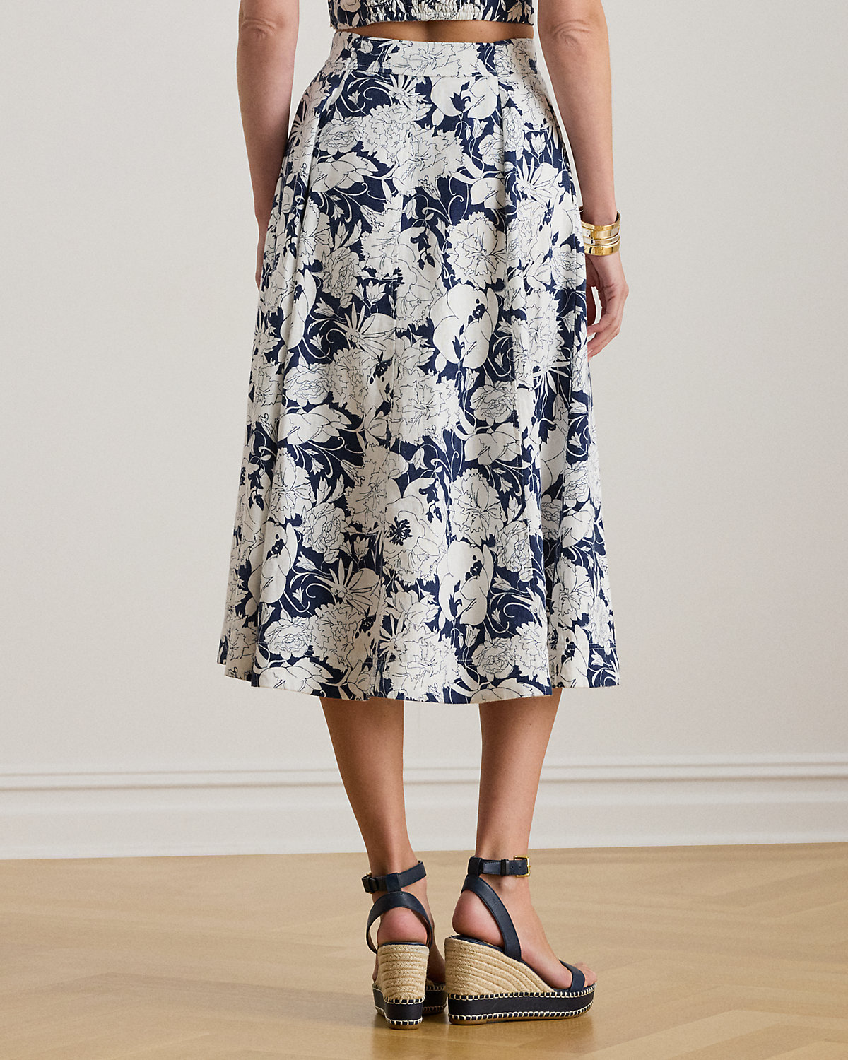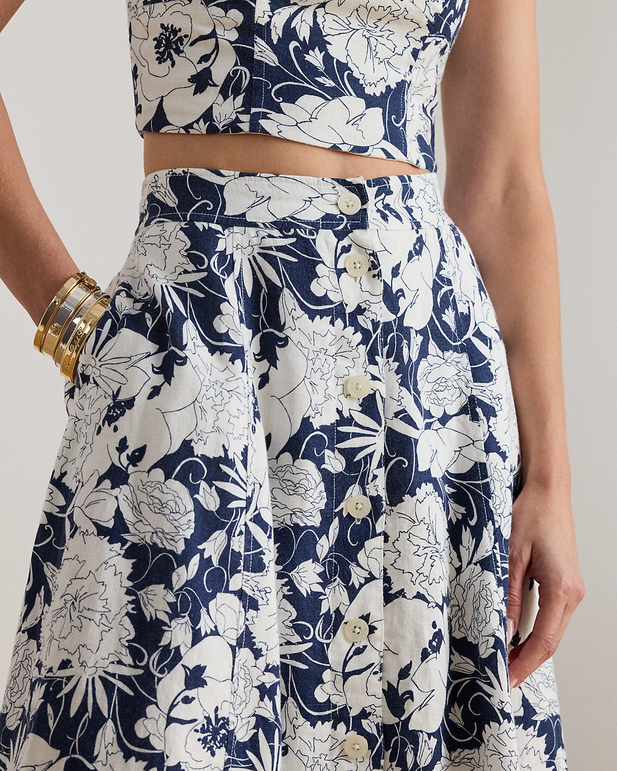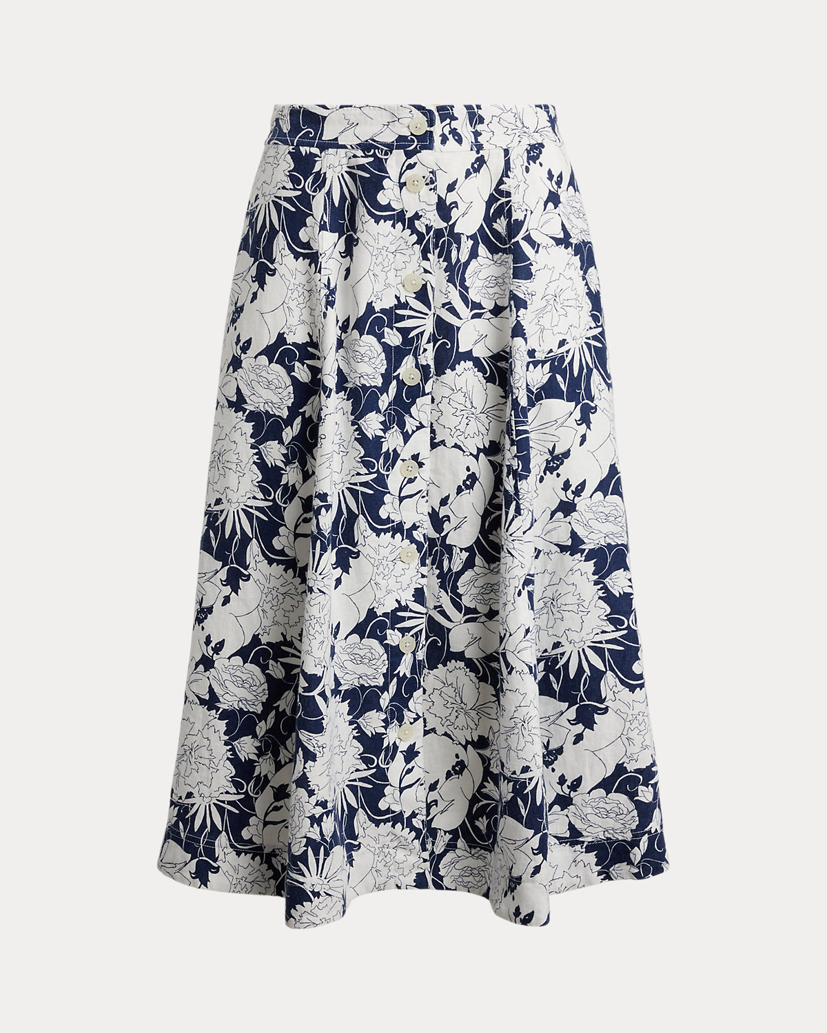 Tailored with airy linen, this A-line midi skirt showcases a div-front design, practical side on-seam pockets, and the season’s stylized, two-tone floral print.