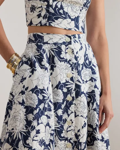 Floral Button-Front Linen Midi Skirt