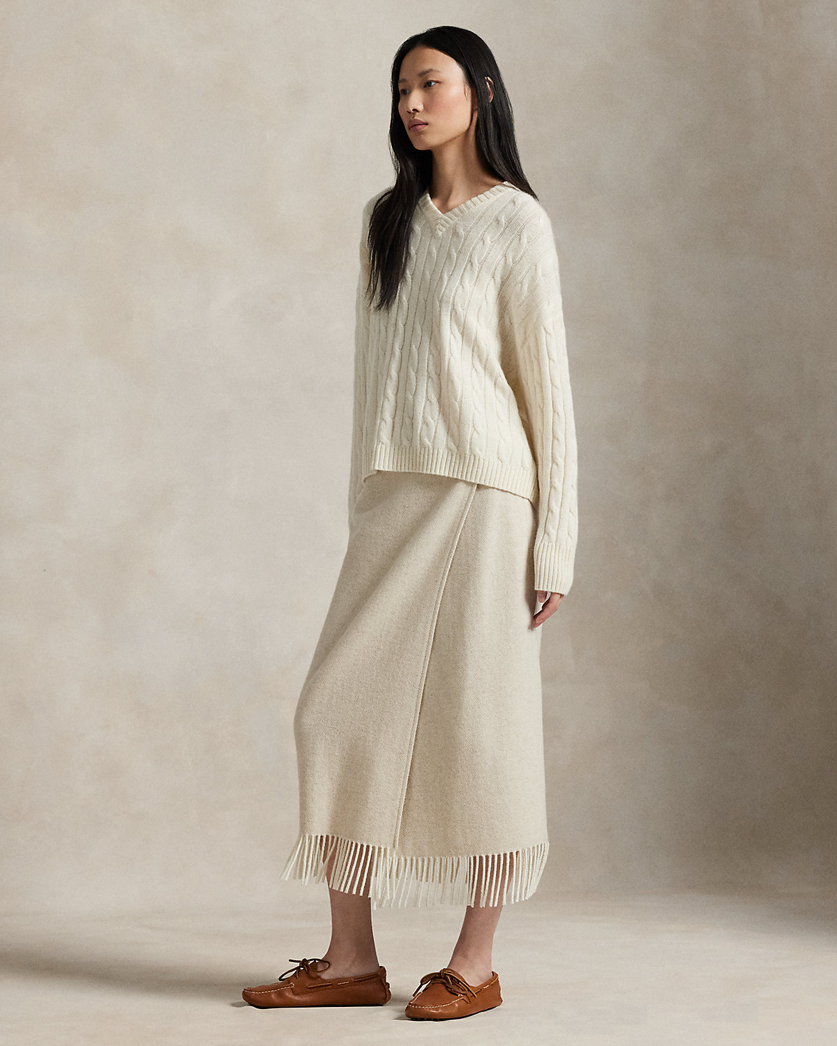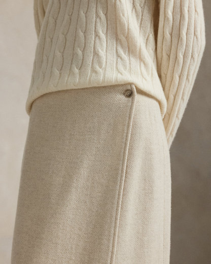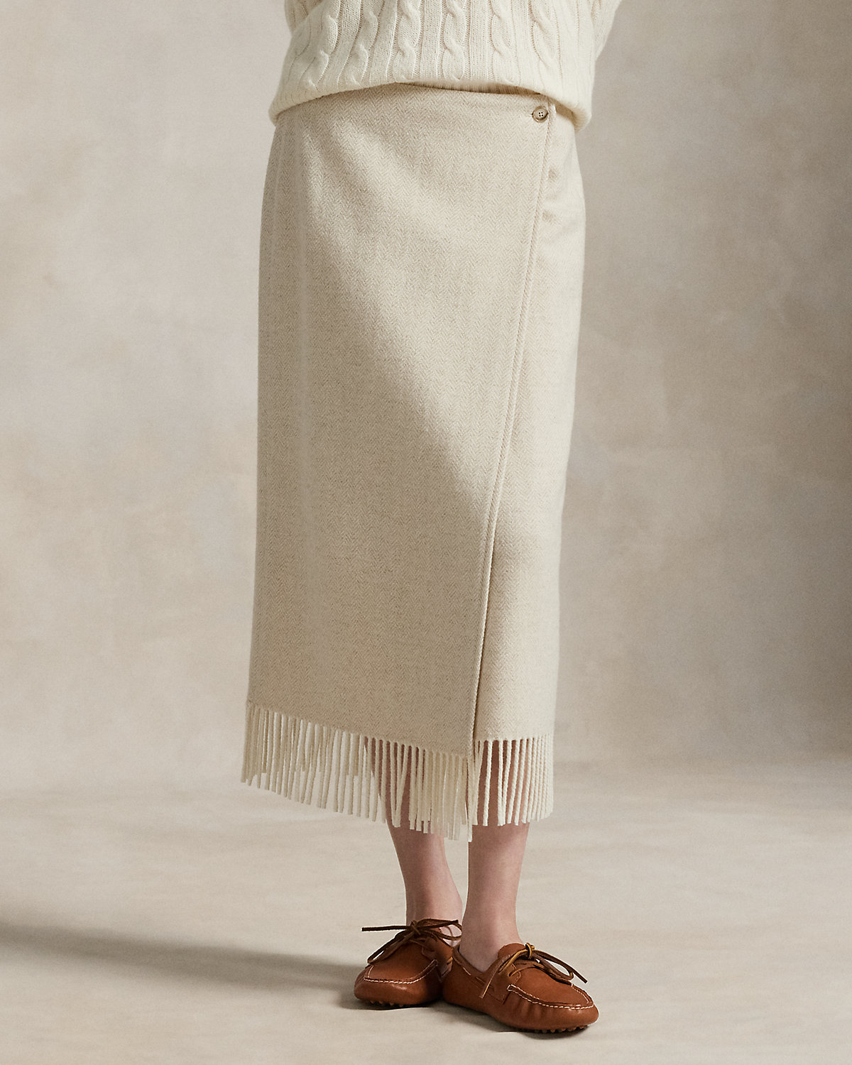 Made with Italian wool-blend herringbone, this wrap skirt is detailed with a one-div closure and fringe trim.